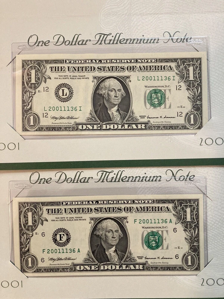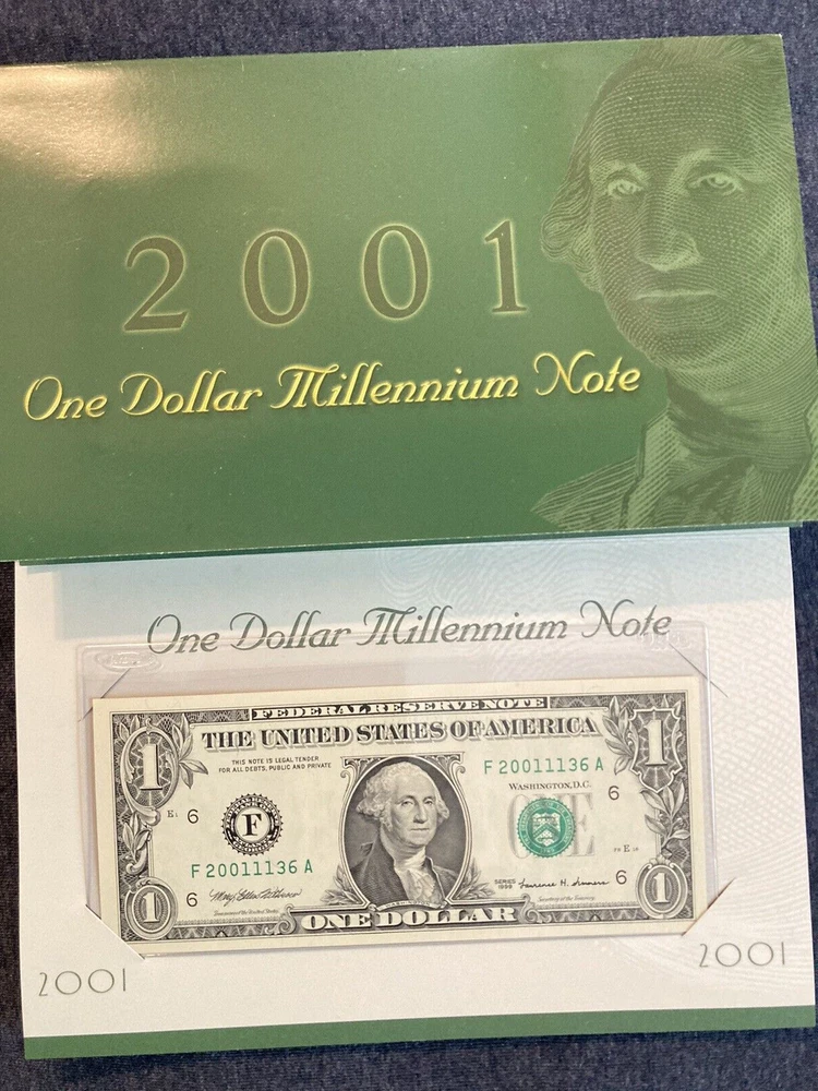 This Series 1999 One Dollar Millennium Note 2001 is a great addition to any collection. The notes are uncirculated. They were manufactured in the United States and has a denomination of $1. The note is a banknote and was produced in the year 1999. It is uncertified and falls under the categories of Federal Reserve Notes, Small Size Notes, and Paper Money. Add this unique piece to your collection today! *** PICTURE IS THE EXACT BILLS YOU WILL RECIEVE. YOU WILL RECIEVE THE SAME INFO CARD, SAME SERIAL NUMBERS NOTES *** ONE NOTE FROM SAN FRANSISCO SERIAL NUMBER L 20011136 I ONE NOTE FROM ATLANTA SERIAL NUMBER F 20011136 A MATCHING NUMBERS