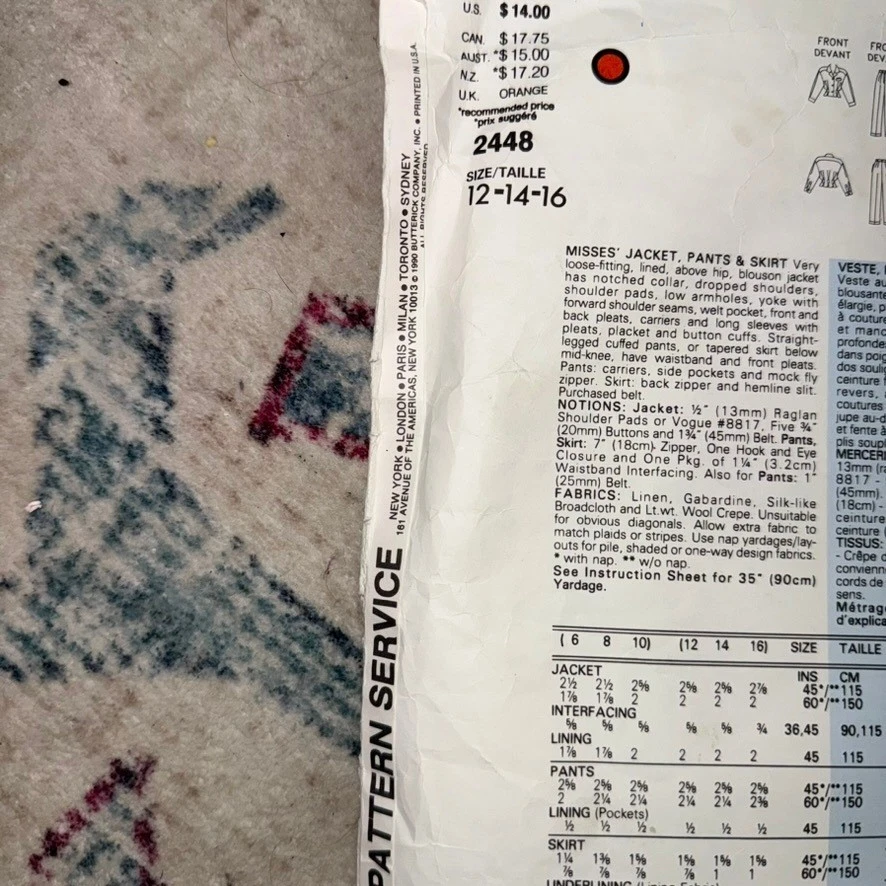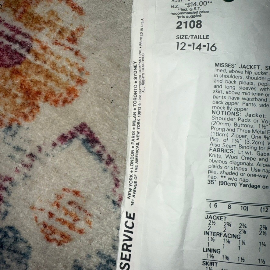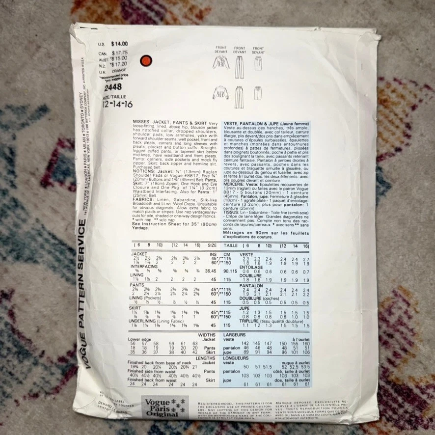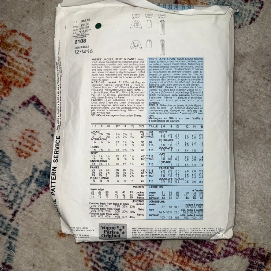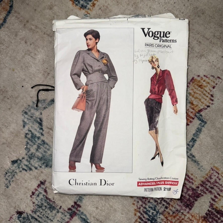 Vogue Paris Original Christian Dior 2108 sewing pattern for misses' jacket pants and skirt. This pattern includes options for a lined, above hip jacket with notched collar, dropped shoulders, full length sleeves with button cuffs and welt front pockets. Button front and back button pleats. Loose fitting, above knee or mid-knee skirt with side pockets and front pleats. Straight legged cuffed pants with fly zipper. This pattern is rated advanced plus. Age Group: Adult Type: Suit, Patterned Paper Gender: Female Compatible Size: 14 (Women's Size), 12 (Women's Size), 16 (Women's Size) Decade: 1980s Cut/Uncut: Uncut Unit Type: Unit Keywords: vintage sewing, designer pattern, couture sewing, tailored jacket, wide leg pants, pencil skirt, 1980s fashion, retro style, DIY clothing, custom made, fashion design, Parisian chic, sew your own Item is preowned, effort has been made to ensure all flaws are displayed photos serve as additional description Sizing varies by manufacturer and time period, please see measurements.