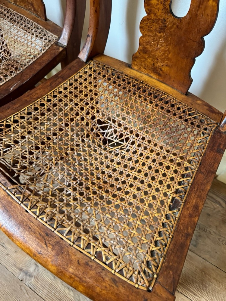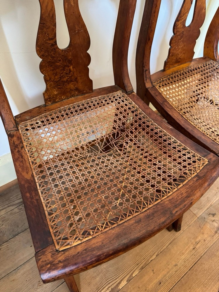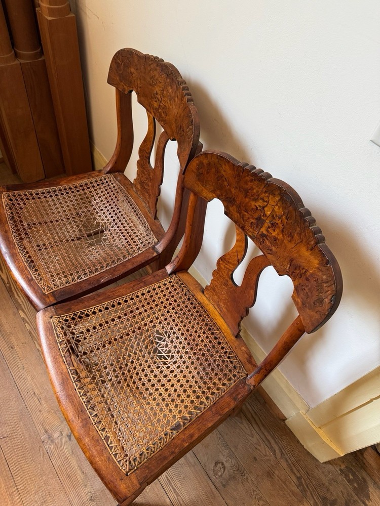 This set of 2 Antique Empire Revival side chairs is a beautiful example of classic American furniture from the mid-19th century. Handmade with walnut burl in the United States, these fully assembled chairs feature intricate carvings and a brown wood finish. The Empire style with a caned seat adds a touch of elegance to any room, bedroom, or den. With a height of 37.5 inches and a width of 23 inches, these chairs are a unique and timeless addition to any home decor collection. Caning needs repair.