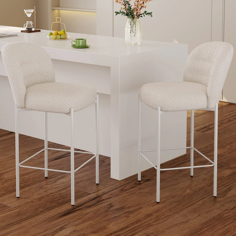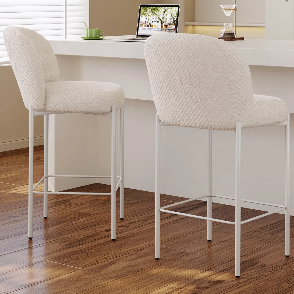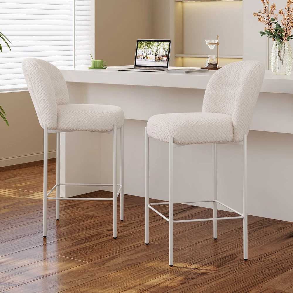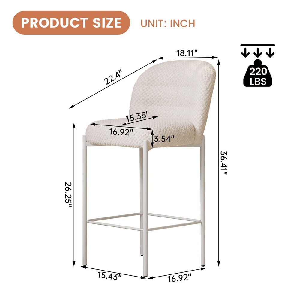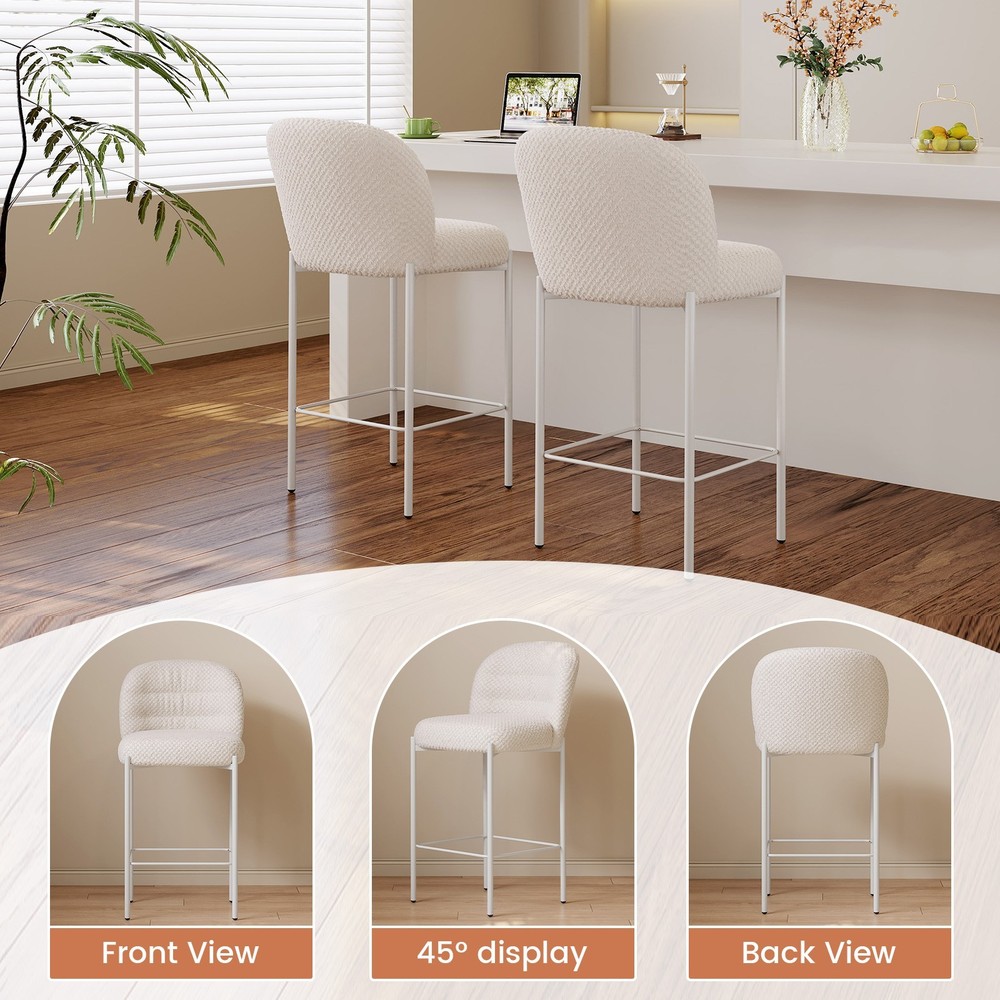 Set of 2 Bar Stools, 36.41" Counter Height Bar Chairs, Beige Upholstered Barstools for Dining Room, Kitchen, Island Features: 【Balanced Comfort for Daily Use】: These bar stools are designed to be comfortably firm—neither too hard nor too soft. The seat features high-resilience foam padding that provides excellent support without losing its shape over time, making it ideal for extended sitting. 【Soft, Skin-Friendly Fabric Upholstery】: The seats are upholstered in a beige, breathable fabric that feels soft to the touch and gentle on the skin. The fabric is also wear-resistant and easy to maintain, offering both comfort and durability for daily use. 【Curved Half-Ring Backrest Design】: The ergonomically curved backrest follows the natural contour of your back while offering just the right amount of support. Its semi-encased design also adds a touch of modern elegance and security while seated. 【Heavy-Duty Metal Frame with 220 lbs Capacity】: Built with a reinforced metal frame, each stool can support up to 220 pounds with ease. The sturdy construction ensures stability, while the sleek frame design contributes to the stool’s contemporary appeal. 【Quick Assembly & Low Maintenance】: All tools and instructions are included, making setup a breeze. The smooth fabric and durable frame require minimal upkeep—perfect for busy kitchens, bars, and family environments. What you will get: Set of 2 Bar Stools Assemble Instruction Accessories required for assembly