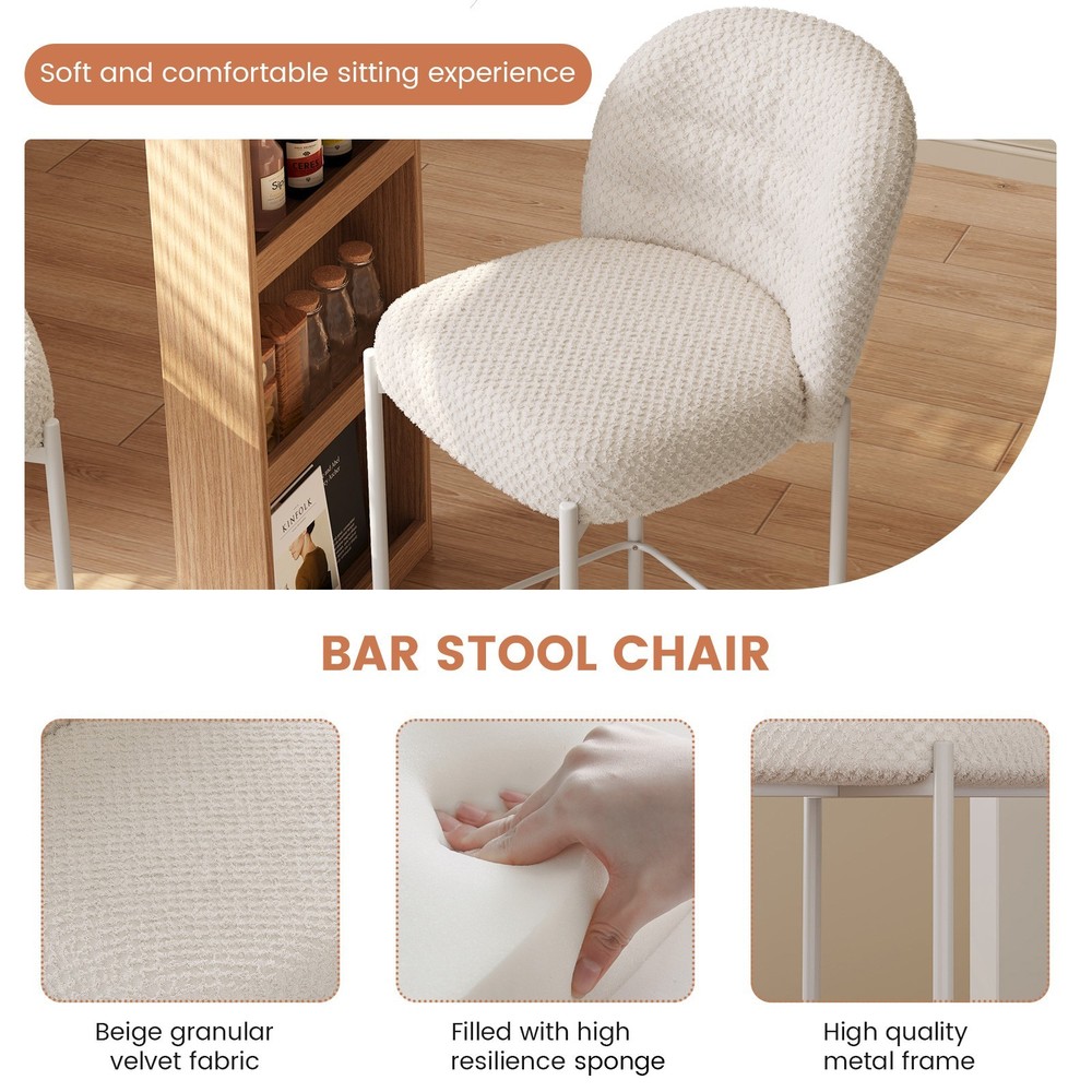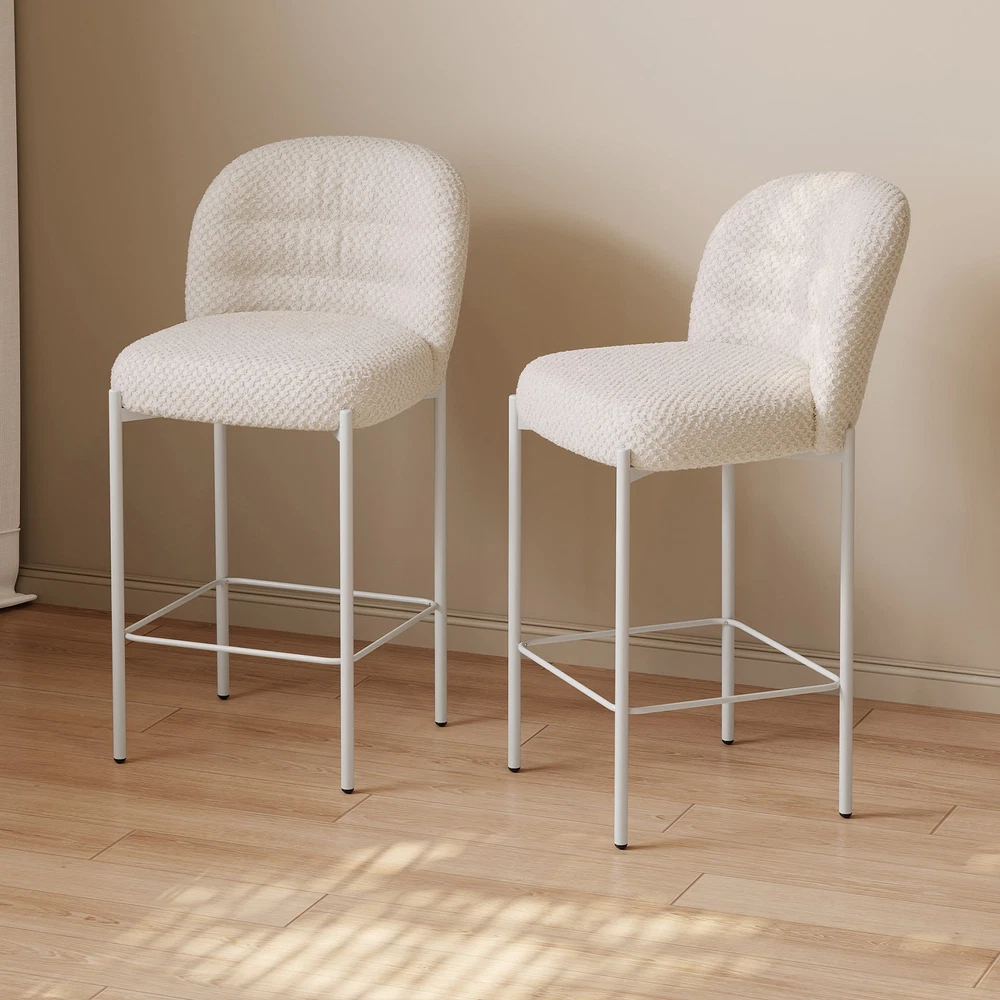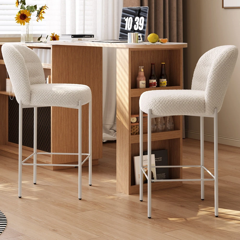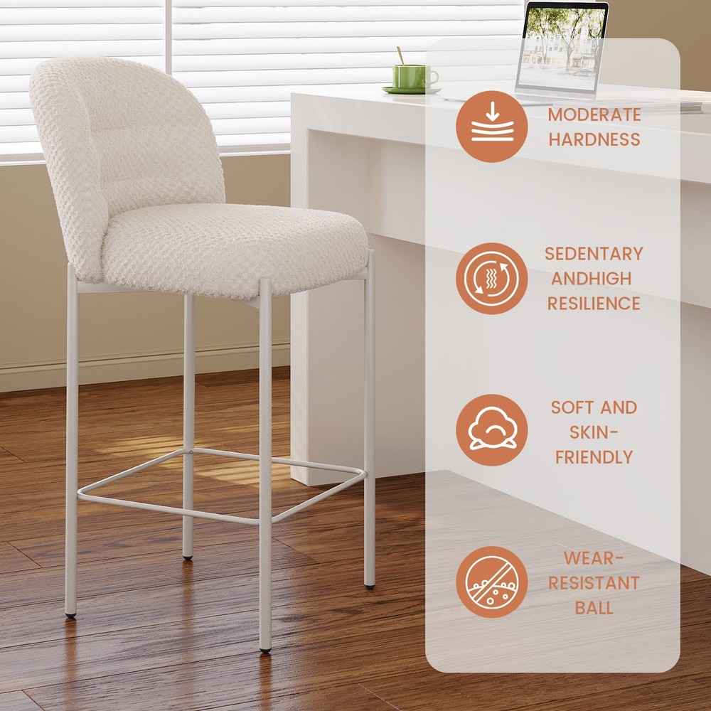 Set of 2 Bar Stools, 36.41" Counter Height Bar Chairs, Beige Upholstered Barstools for Dining Room, Kitchen, Island Features: 【Balanced Comfort for Daily Use】: These bar stools are designed to be comfortably firm—neither too hard nor too soft. The seat features high-resilience foam padding that provides excellent support without losing its shape over time, making it ideal for extended sitting. 【Soft, Skin-Friendly Fabric Upholstery】: The seats are upholstered in a beige, breathable fabric that feels soft to the touch and gentle on the skin. The fabric is also wear-resistant and easy to maintain, offering both comfort and durability for daily use. 【Curved Half-Ring Backrest Design】: The ergonomically curved backrest follows the natural contour of your back while offering just the right amount of support. Its semi-encased design also adds a touch of modern elegance and security while seated. 【Heavy-Duty Metal Frame with 220 lbs Capacity】: Built with a reinforced metal frame, each stool can support up to 220 pounds with ease. The sturdy construction ensures stability, while the sleek frame design contributes to the stool’s contemporary appeal. 【Quick Assembly & Low Maintenance】: All tools and instructions are included, making setup a breeze. The smooth fabric and durable frame require minimal upkeep—perfect for busy kitchens, bars, and family environments. What you will get: Set of 2 Bar Stools Assemble Instruction Accessories required for assembly