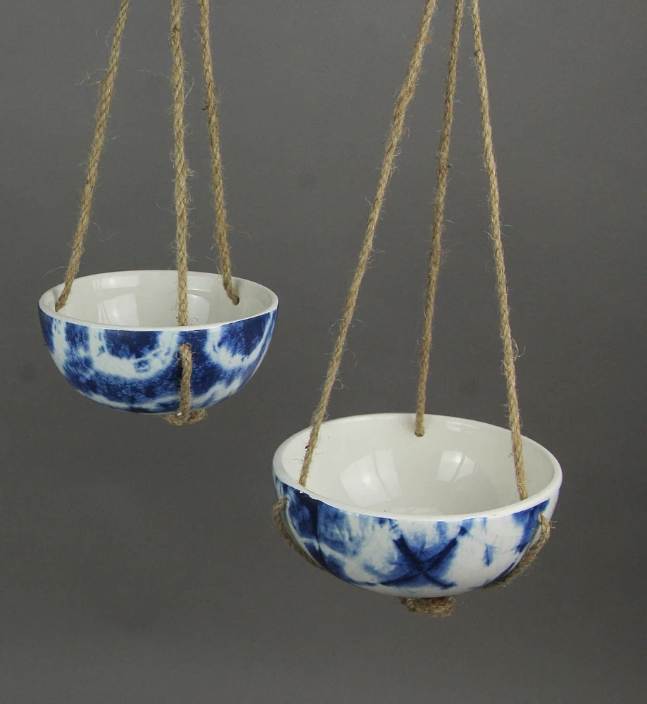 NOTE: DUE TO THIS IS A SET OF 2 this item is being sold at a reduced price. This set of white ceramic hanging mini planters features wonderful Japanese shibori-inspired patterns. Unlike tie-dye, shibori utilizes wooden blocks to create wonderful geometric patterns. These beautiful planters have stunning deep blue shibori-style designs to add a burst of color to your room, and have natural jute rope hangers for easy mounting to ceiling hooks or shepherd's hooks. The bigger one is 3 inches high, 6 inches in diameter, with an 11. inch drop hanger, and the smallest is 2.75 inches high, 5 inches in diameter, with a 9.5 inch drop hanger. Our eBay Store About Us Add to Favorite Sellers Set of 2 Blue and White Shibori Style Dyed Ceramic Hanging Mini Planters NOTE: DUE TO THIS IS A SET OF 2 this item is being sold at a reduced price. NOTE - DUE TO THIS IS A SET OF 2 this item is being sold at a reduced price. DURABLE MATERIAL - Made of Ceramic With Natural Jute Rope Hangers For Years of Display UNIQUE FINISH - Different Deep Blue Shibori Inspired Patterns EASY TO HANG - From Shepherds Hooks, Garden Stakes and Trees OVERALL SIZE - Large - 3 Inches High, 6 Inches in Diameter. Small - 2.75 Inches High, 5 Inches in Diameter NOTE: DUE TO THIS IS A SET OF 2 this item is being sold at a reduced price. This set of white ceramic hanging mini planters features wonderful Japanese shibori-inspired patterns. Unlike tie-dye, shibori utilizes wooden blocks to create wonderful geometric patterns. These beautiful planters have stunning deep blue shibori-style designs to add a burst of color to your room, and have natural jute rope hangers for easy mounting to ceiling hooks or shepherd's hooks. The bigger one is 3 inches high, 6 inches in diameter, with an 11. inch drop hanger, and the smallest is 2.75 inches high, 5 inches in diameter, with a 9.5 inch drop hanger. Product Details Color Blue Height 3.5 Length 7 Weight 2.3 LB