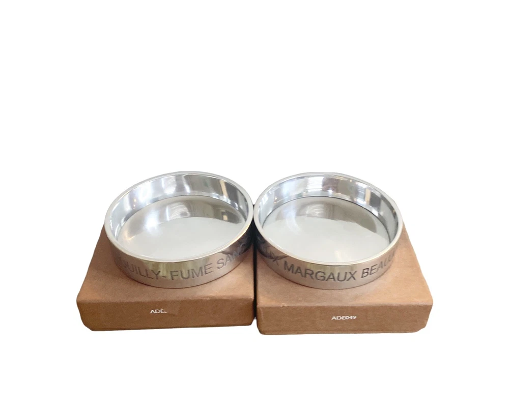 Set of 2 Bombay London Wine Coasters Etched Aluminium Boxed Red White Wine Measure approx 4" D X 1' H Set of 2 Cast Aluminum Coasters White Wine has etched Pinot Grigio, Pouilly Fume, Sanceree, Chablis, Chardonnay Red Wine has etched Burgandy, Bordeaux, Marguex, Beaujolais, Cotes du Rhone. Smoke free home Please visit my store at https://www.ebay.com/str/theuniqueredhead . Thank you for your consideration. Please message me if you have any questions. I do combined shipping on my items in the store.