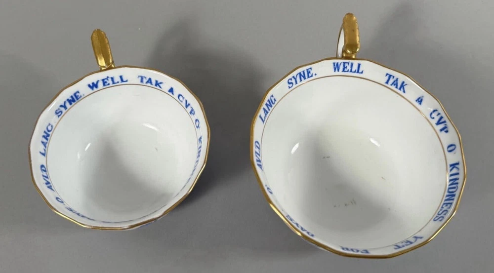 Set of 2 - Copeland China England Retailed by Tiffany and Co. Copeland China, Endland. Retailed by Tiffany and Co. D: Large cup 2.75"h x 4.50" diameter. Small cup 2"h x 4" diameter. Condition Fair. Small chip on large cup. Signs of use.