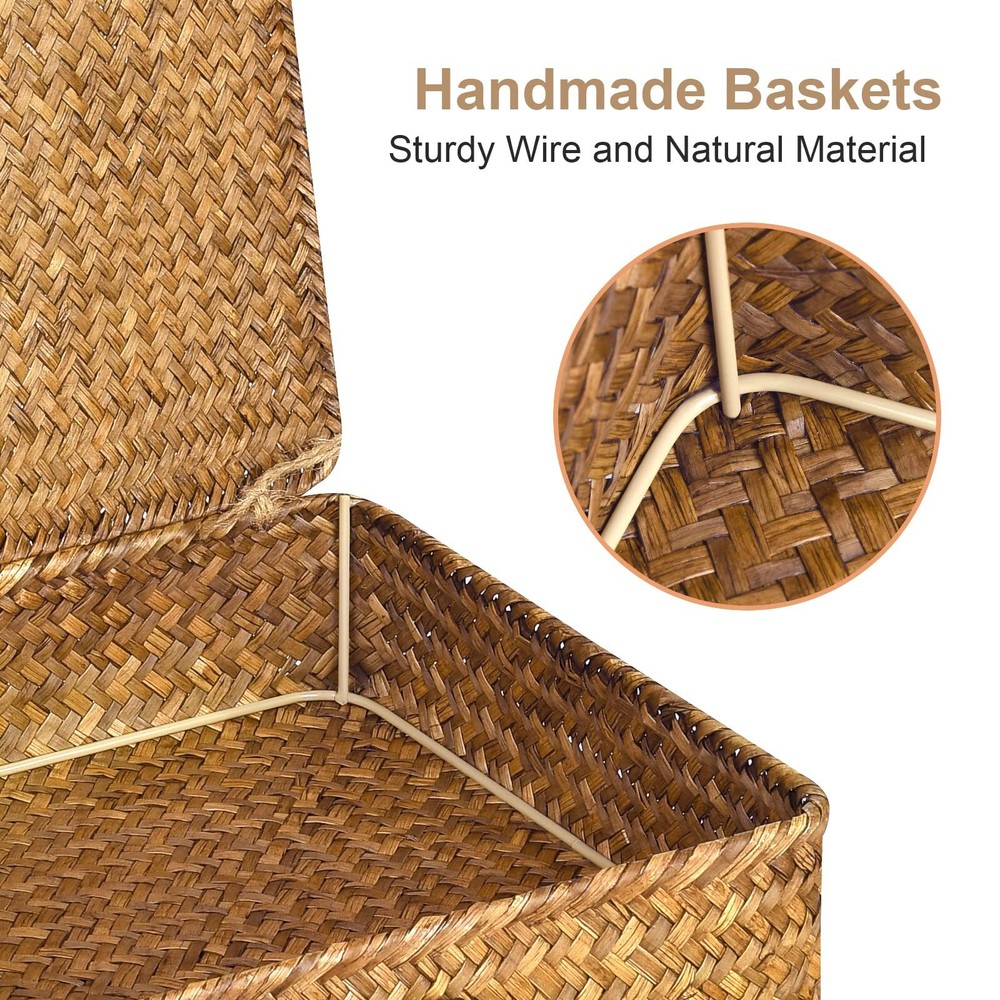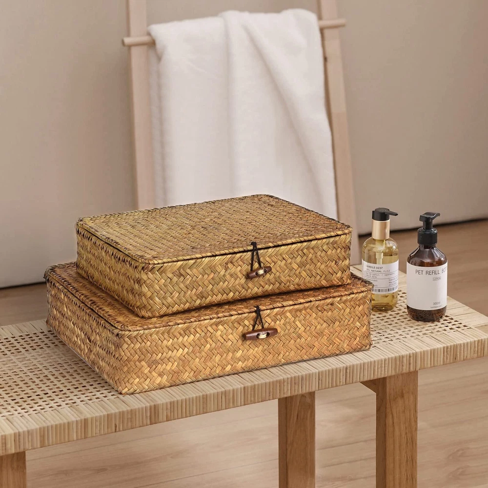 Hand-Woven Seagrass Baskets: Our storage bins are made of natural seagrass and metal frames, making them strong and durable. Each basket is unique due to the natural variations in the seagrass. Practical and Beautiful: Flat baskets are both functional and a work of art. The unique button design secures the lid to the box, making it more secure. Flexible Size: The flat shape of our decorative boxes makes them easy to insert into different places in your home. This set includes two pieces (L+S), with sizes of L: 12.6"x11.1"x2.9"H and S: 10.5"x8.9"x2.5"H. Easy Organization: Keep your home tidy by storing books, toys, stationery, accessories, and more in our storage bins. The lid makes it easy to access your items, and the flat shape allows for versatile placement. Perfect Gift: Our baskets are handcrafted with care and make a thoughtful gift for friends and family. Give the gift of organization and style with 's Seagrass Storage Bins.
