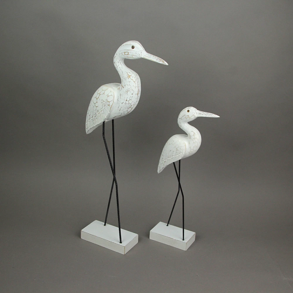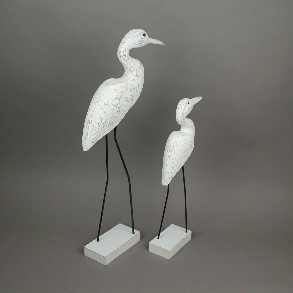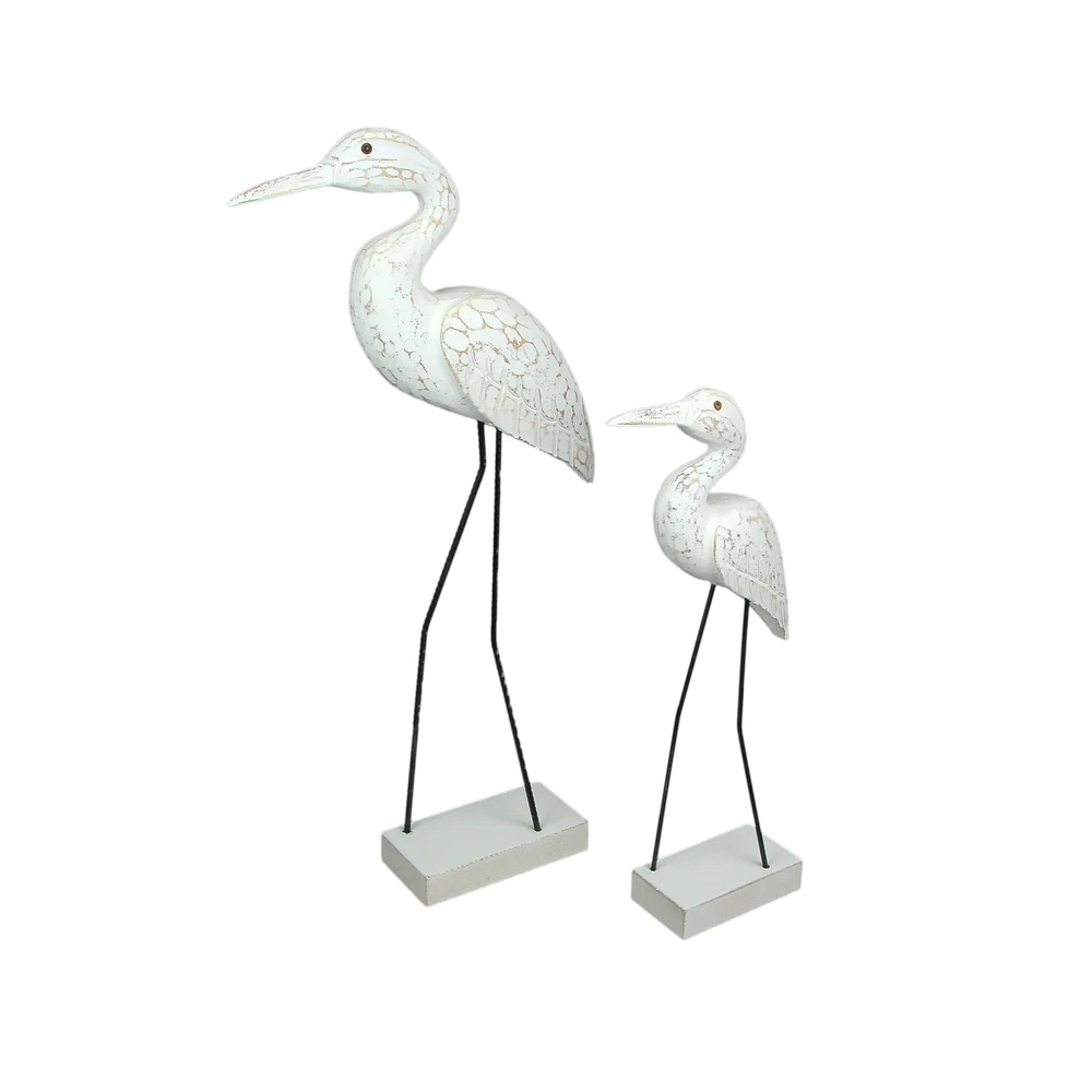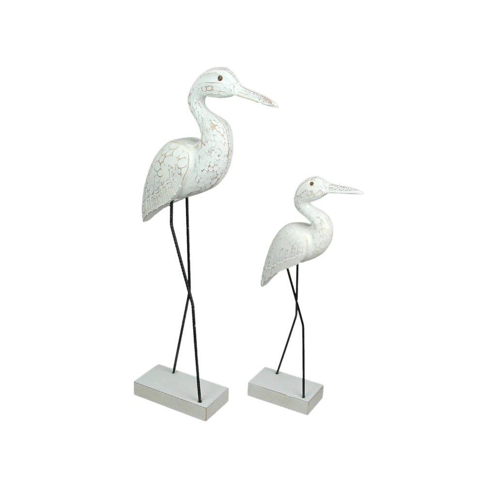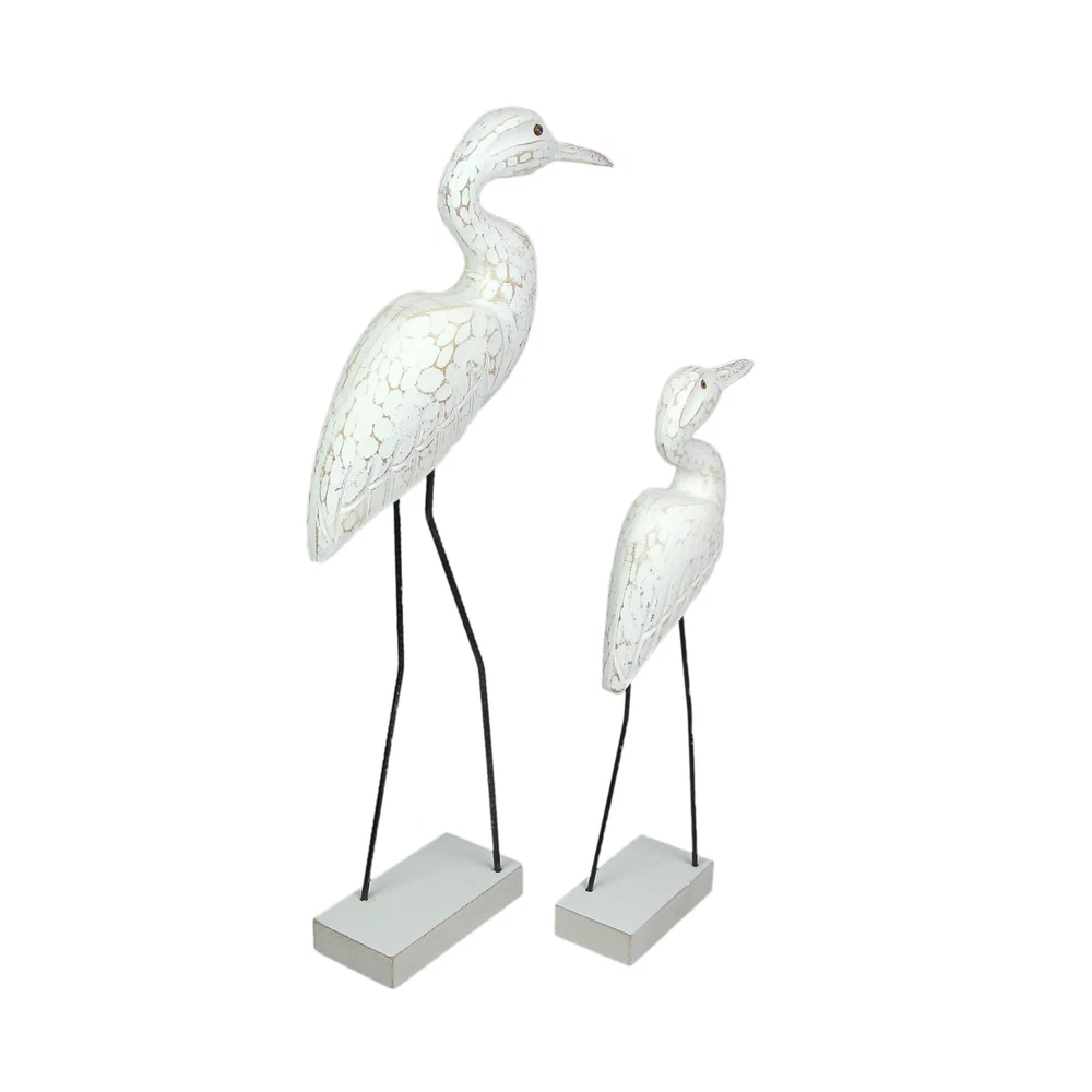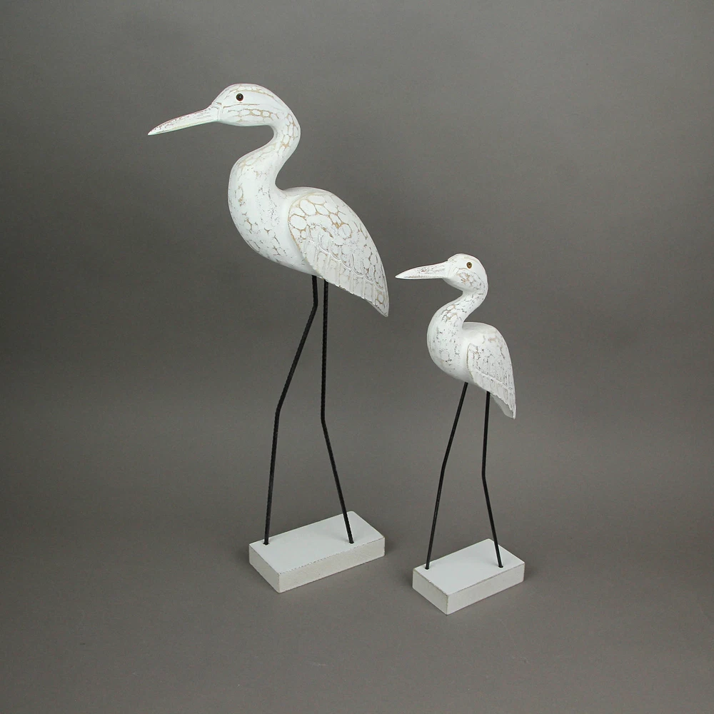 You love the shore, but if you live a little further away, you can bring the look of the coast to your home with this wonderful pair of hand-carved wooden egret statues, with legs made of reinforced steel round bar. Place them on a table with plants or on a wall shelf as part of a gallery wall. The white finish is given a distressed look giving it a seaside appearance. The shorter one measures 15.25 inches high, 5.25 inches long, and 2.5 inches wide, and the larger one measures 21.25 inches high, 9.25 inches long, and 2.75 inches wide. These wood and metal statues are a charming way to beautifully complement beach, coastal and nautical decor styles. Our eBay Store About Us Add to Favorite Sellers Set of 2 Hand Carved Wood and Metal White Egret Bird Statues Coastal Decor OVERALL SIZE - Short - 5.25 Inches Long, 2.5 Inches Wide, 15.25 Inches High. Large - 9.25 Inches Long, 2.75 Inches Wide, 21.25 Inches High DURABLE MATERIAL - Creatively Crafted of Albesia Wood and Reinforced Steel Bar UNIQUE DETAIL - Hand Carved and Hand Painted INDOOR / OUTDOOR - Looks Great on Porches and Patios as Well as Bedrooms and Living Rooms GREAT GIFT - For Yourself or For Friends and Family You love the shore, but if you live a little further away, you can bring the look of the coast to your home with this wonderful pair of hand-carved wooden egret statues, with legs made of reinforced steel round bar. Place them on a table with plants or on a wall shelf as part of a gallery wall. The white finish is given a distressed look giving it a seaside appearance. The shorter one measures 15.25 inches high, 5.25 inches long, and 2.5 inches wide, and the larger one measures 21.25 inches high, 9.25 inches long, and 2.75 inches wide. These wood and metal statues are a charming way to beautifully complement beach, coastal and nautical decor styles. Product Details Color White Height 21.25 Length 9.25 Weight 3.05 LB