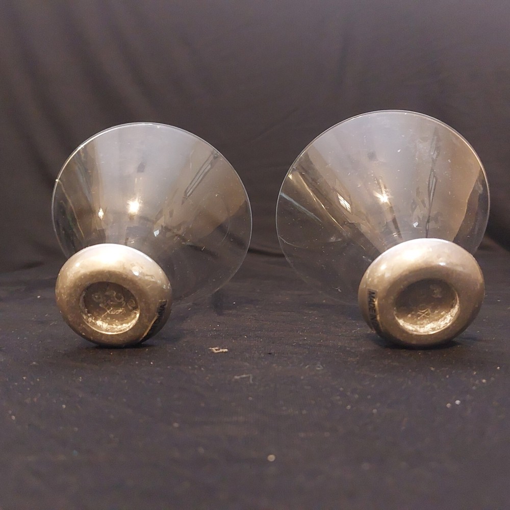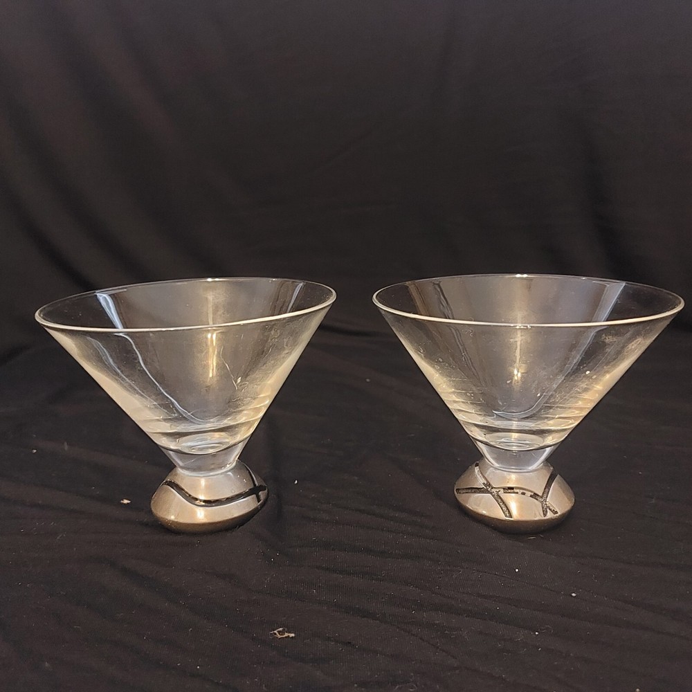 This is a set of 2 Lenox Vibe stemless martini glasses with a metal base. The glasses are round in shape, made of glass with a metal base, and have a clear/silver color. They are suitable for all occasions, featuring a holiday party, bar, and cocktails theme. Each glass is 3.75" tall and 4.75" wide, with a weight of 2.2 lbs. Perfect for entertaining and serving drinks to guests. The paint is coming of a little on one of the glasses which can easily be corrected but I did not want to alter the state of th