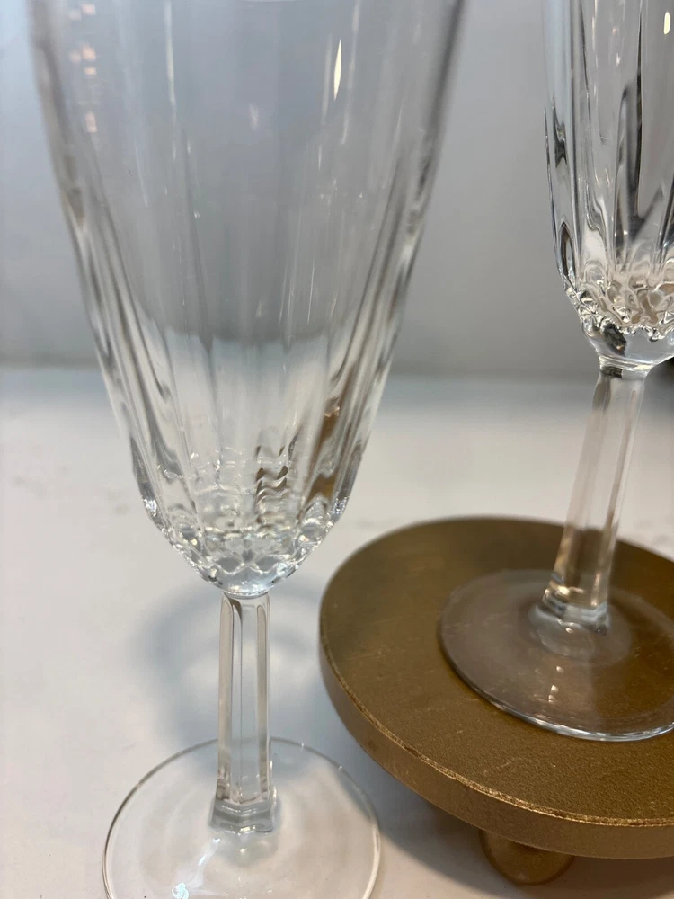 Elevate your toasting experience with this set of 2 Long Champ Champagne Flutes. Crafted from premium crystal, these glasses offer a clear, refined view of your bubbly, ensuring every sip is as delightful to the eyes as it is to your taste buds. The Mid-Century Modern design exudes a timeless elegance, making these flutes a sophisticated addition to any occasion. The cut glass production style not only showcases the drink's effervescence but also enhances the visual appeal of your table setting. Whether it's a celebration or an elegant dinner, these unbranded champagne glasses are designed to impress while providing a classic touch to your dining experience.