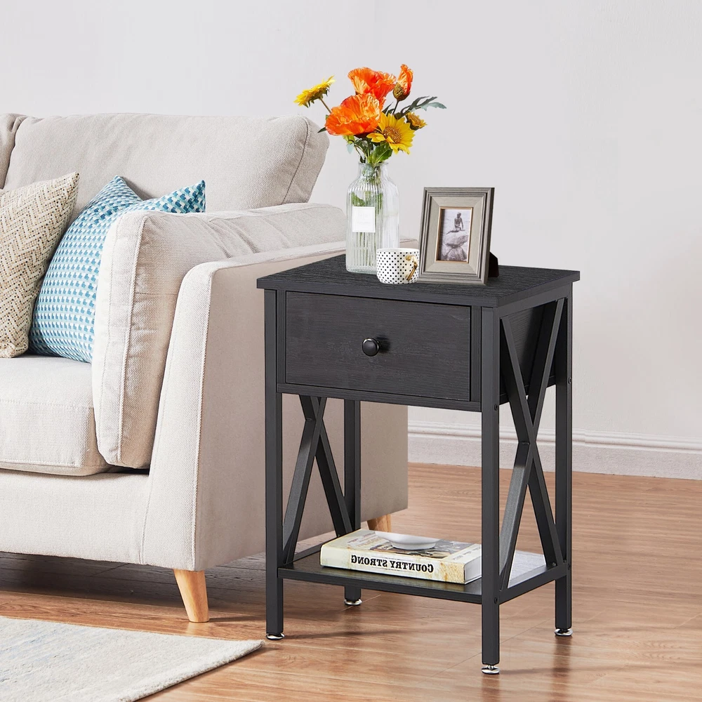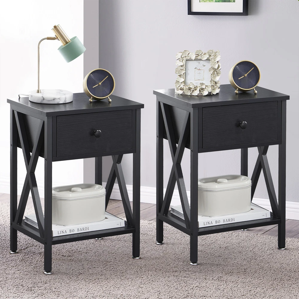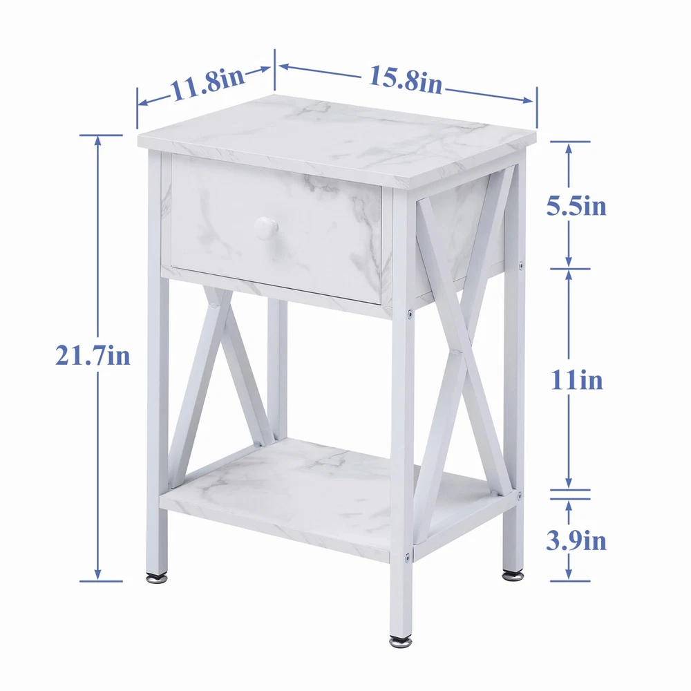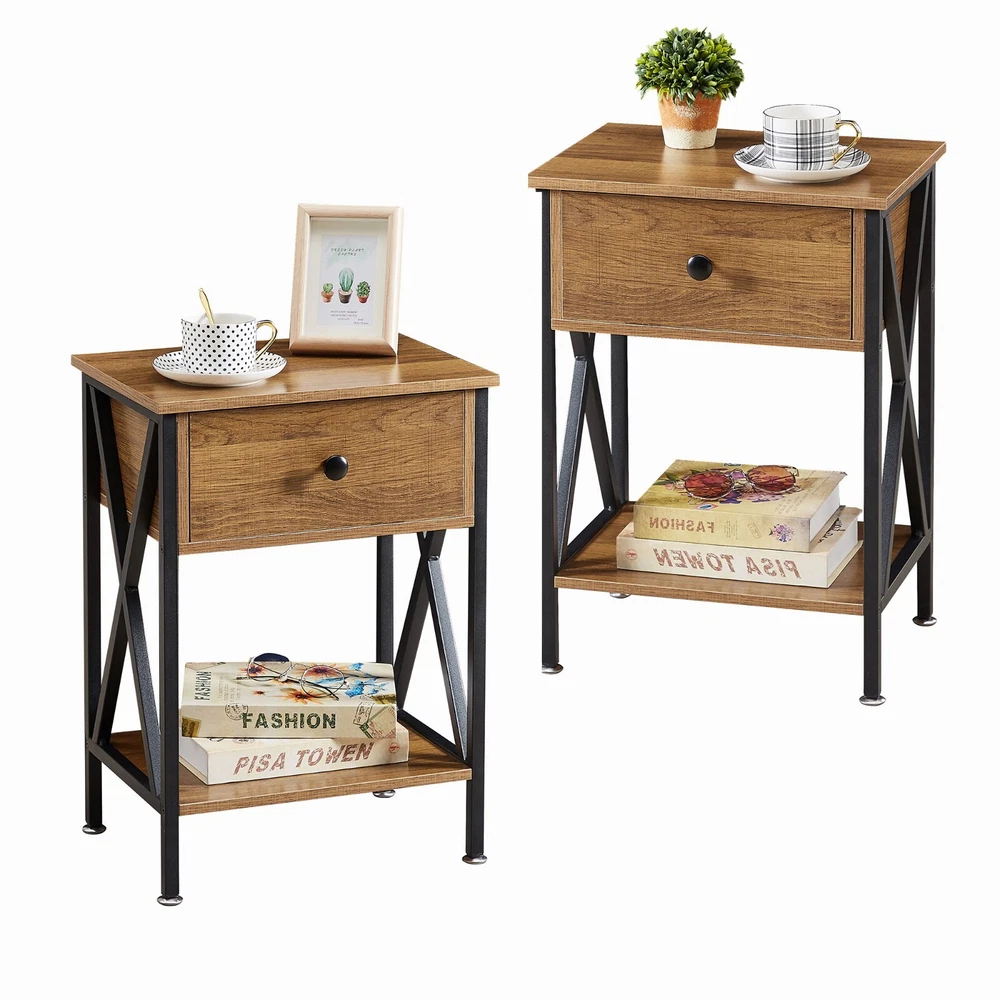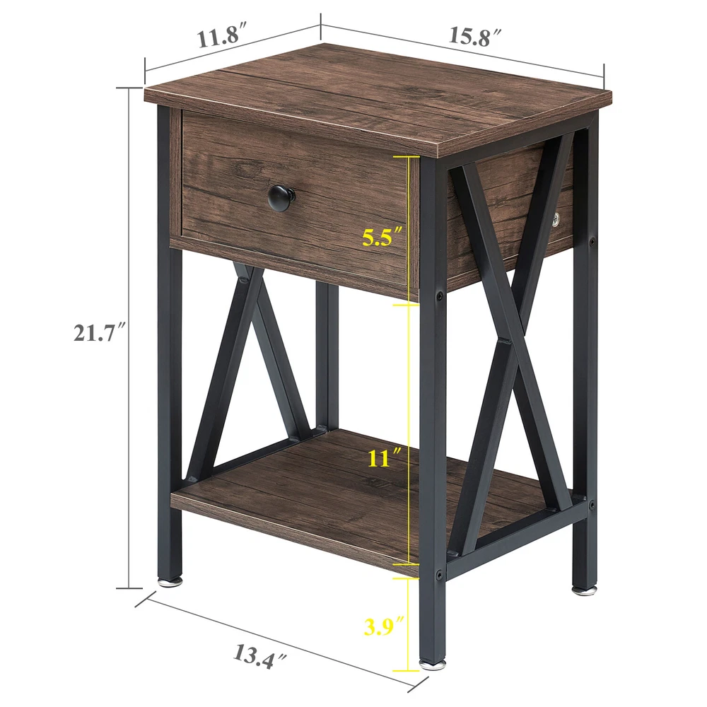 Features ² 【 Vintage appearance】The classical design and simple construction gives this modern nightstand a beautiful and elegant look. The nightstand is functional and suitable for any space. ² 【 Large Storage】Equipped with a pull-out drawer and a large-capacity lower cabinet, it is the perfect choice for bedside item storage, keeping your bedside tidy. ² 【 Multi-scenario use】You can put it in the living room as a side table, or a small coffee table. It can also be placed in the bedroom as a bedside table, next to the desk is also a good choice. Storage can be done better. ² 【 Reliable Quality】Made of high-quality MDF and metal, coupled with an X-shaped frame design, strong and stable. Four adjustable metal foot pads keep the nightstand balanced on uneven ground and increase its stability. ² 【 Easy Assembly】 Detailed instructions and all labeled parts and accessories are included, Just following the easy-to-understand and finishing the assembly quickly .The end table wipe-clean surface, and is easy to clean. Specifications Nightstand Color: Brown, Black, White, Walnut Brown, Hemp Gray, Gray, Antique Brown, Light Blue, Orange, Pink Material: Manufactured Wood; Metal. Size:21.7'' H X 15.8'' W X 11.8'' D Weight: 60 lb. Package Includes: 2 x End tables 1 x Instructions 1 x Assembly Bag Note: 1. When viewing the color of the product on your monitor, it may differ from the actual color of the item. 2. Please allow ±1/0.5'' error due to manual measurement.