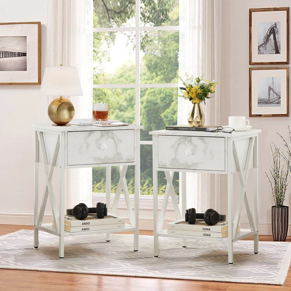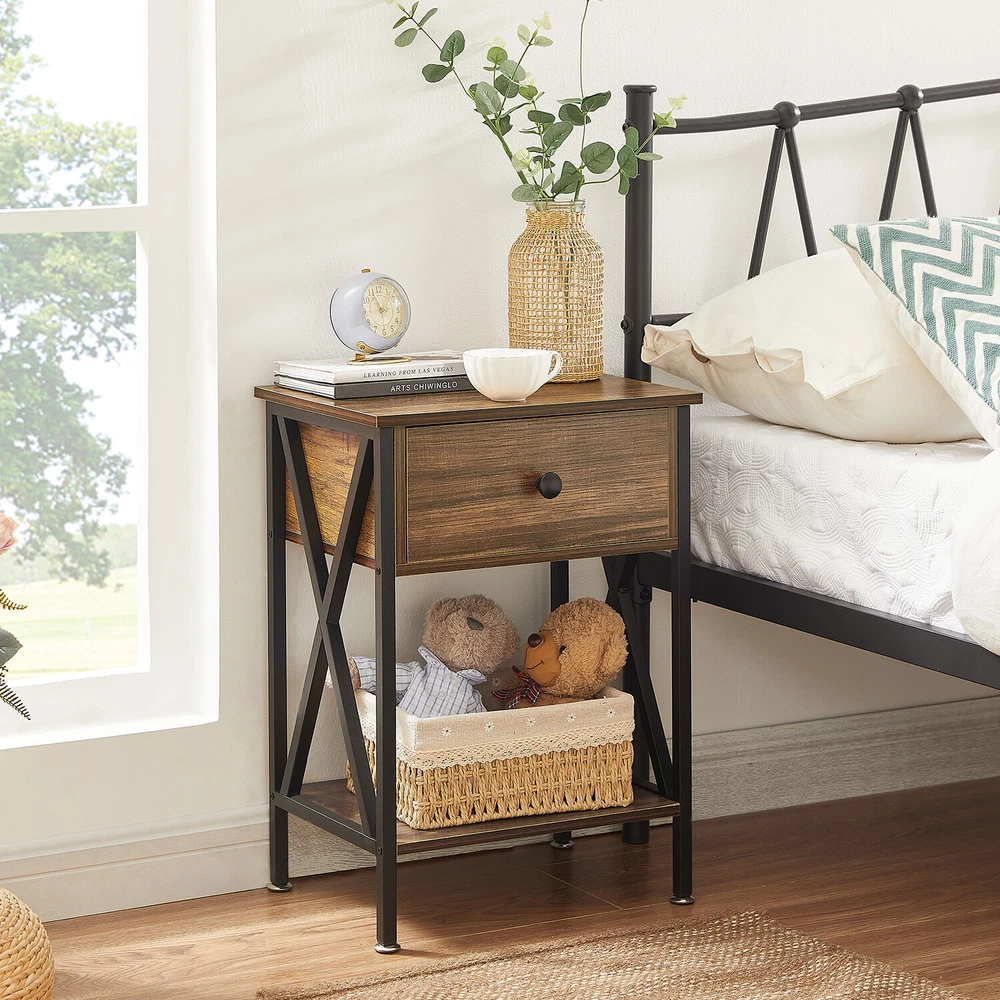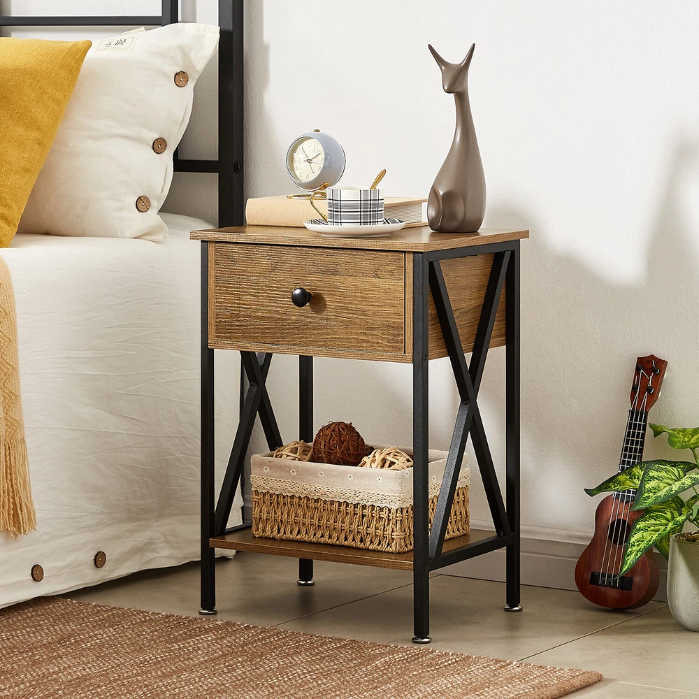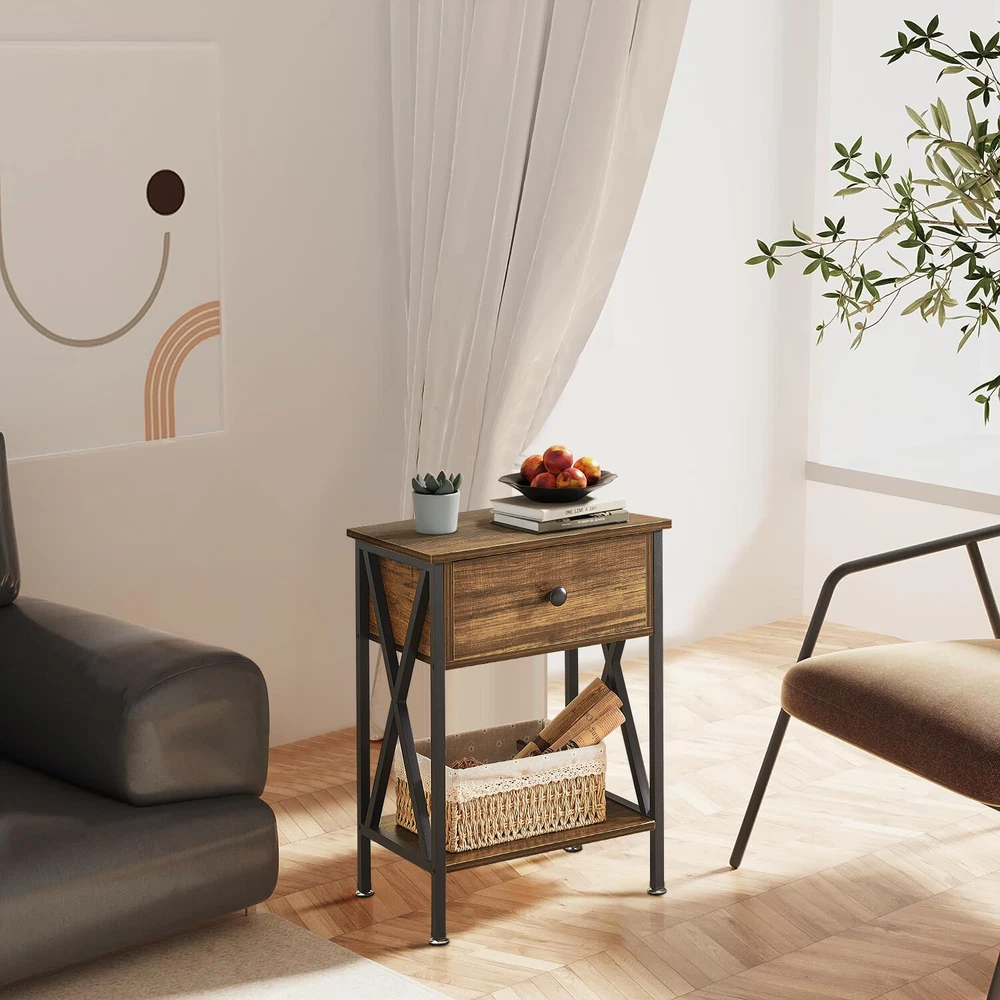 Features ² 【 Vintage appearance】The classical design and simple construction gives this modern nightstand a beautiful and elegant look. The nightstand is functional and suitable for any space. ² 【 Large Storage】Equipped with a pull-out drawer and a large-capacity lower cabinet, it is the perfect choice for bedside item storage, keeping your bedside tidy. ² 【 Multi-scenario use】You can put it in the living room as a side table, or a small coffee table. It can also be placed in the bedroom as a bedside table, next to the desk is also a good choice. Storage can be done better. ² 【 Reliable Quality】Made of high-quality MDF and metal, coupled with an X-shaped frame design, strong and stable. Four adjustable metal foot pads keep the nightstand balanced on uneven ground and increase its stability. ² 【 Easy Assembly】 Detailed instructions and all labeled parts and accessories are included, Just following the easy-to-understand and finishing the assembly quickly .The end table wipe-clean surface, and is easy to clean. Specifications Nightstand Color: Brown, Black, White, Walnut Brown, Hemp Gray, Gray, Antique Brown, Light Blue, Orange, Pink Material: Manufactured Wood; Metal. Size:21.7'' H X 15.8'' W X 11.8'' D Weight: 60 lb. Package Includes: 2 x End tables 1 x Instructions 1 x Assembly Bag Note: 1. When viewing the color of the product on your monitor, it may differ from the actual color of the item. 2. Please allow ±1/0.5'' error due to manual measurement.