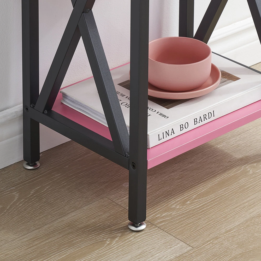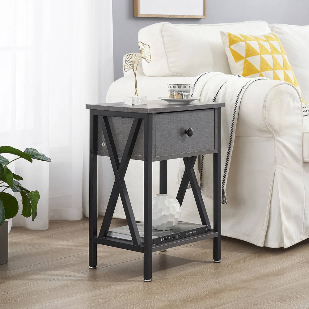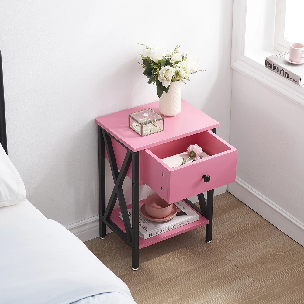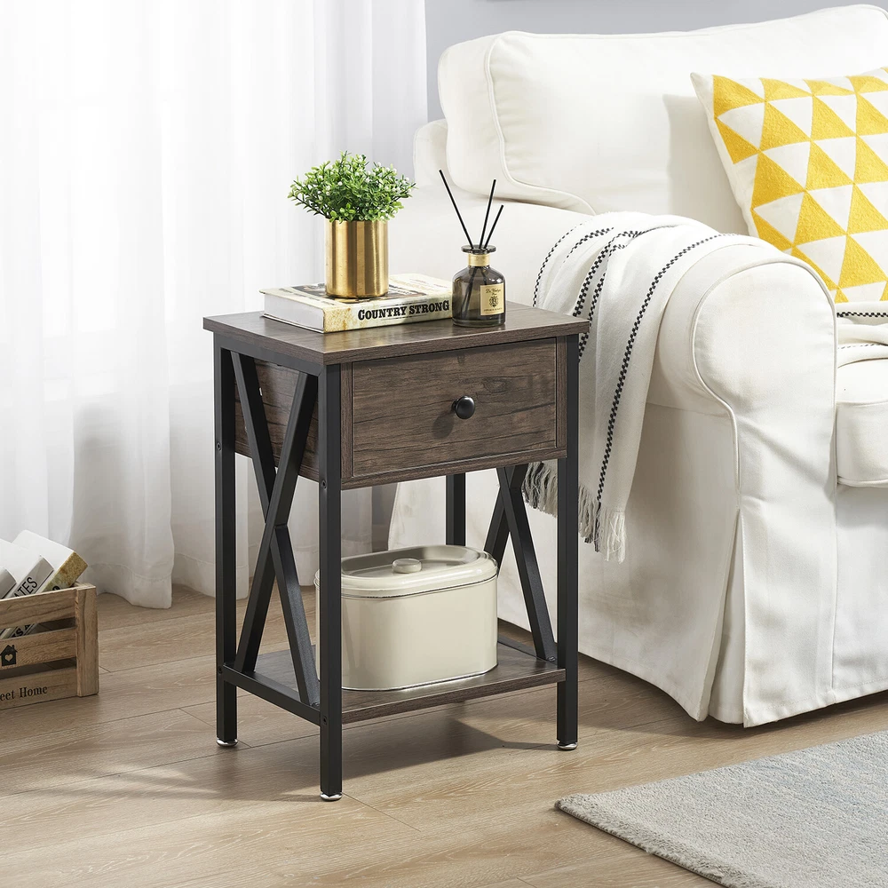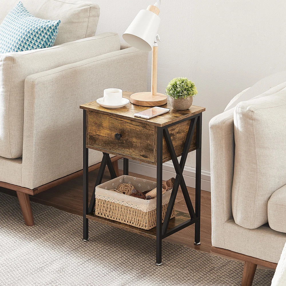 Features ² 【 Vintage appearance】The classical design and simple construction gives this modern nightstand a beautiful and elegant look. The nightstand is functional and suitable for any space. ² 【 Large Storage】Equipped with a pull-out drawer and a large-capacity lower cabinet, it is the perfect choice for bedside item storage, keeping your bedside tidy. ² 【 Multi-scenario use】You can put it in the living room as a side table, or a small coffee table. It can also be placed in the bedroom as a bedside table, next to the desk is also a good choice. Storage can be done better. ² 【 Reliable Quality】Made of high-quality MDF and metal, coupled with an X-shaped frame design, strong and stable. Four adjustable metal foot pads keep the nightstand balanced on uneven ground and increase its stability. ² 【 Easy Assembly】 Detailed instructions and all labeled parts and accessories are included, Just following the easy-to-understand and finishing the assembly quickly .The end table wipe-clean surface, and is easy to clean. Specifications Nightstand Color: Brown, Black, White, Walnut Brown, Hemp Gray, Gray, Antique Brown, Light Blue, Orange, Pink Material: Manufactured Wood; Metal. Size:21.7'' H X 15.8'' W X 11.8'' D Weight: 60 lb. Package Includes: 2 x End tables 1 x Instructions 1 x Assembly Bag Note: 1. When viewing the color of the product on your monitor, it may differ from the actual color of the item. 2. Please allow ±1/0.5'' error due to manual measurement.