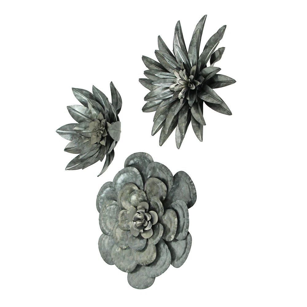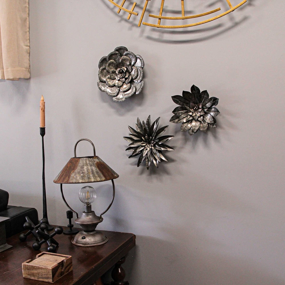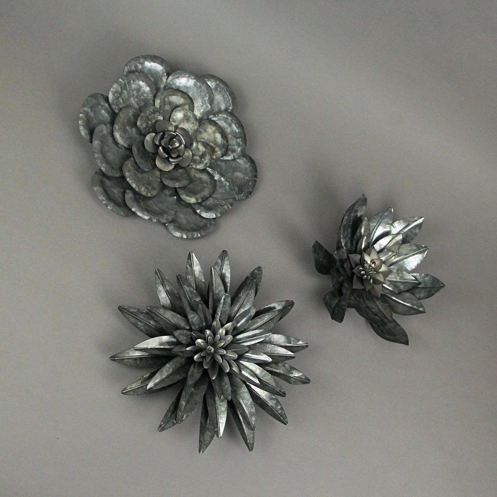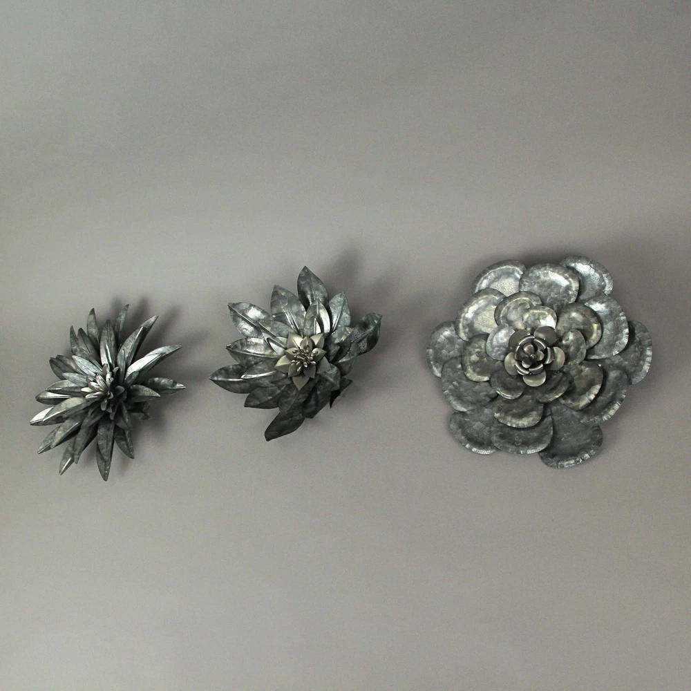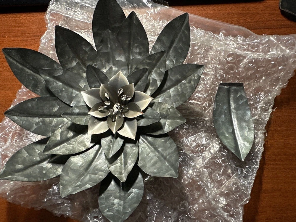NOTE: DUE TO A BROKEN PETAL, INCLUDED FOR REPAIR this item is being sold at a reduced price (DAMAGE MAY VARY PER PRODUCT AVAILABLE). See last photo for damages/defects. Robust Craftsmanship - Crafted from high-quality galvanized metal, these sculptures are designed for years of maintenance-free elegance. Their sturdy build ensures they remain a charming addition to your decor. Timeless Aesthetics - Boasting a rustic metal finish, these pieces exude a timeless appeal. The aged decor adds character to any setting, creating a captivating atmosphere that resonates with classic charm. Our eBay Store About Us Add to Favorite Sellers Set of 3 Galvanized Metal Flower Wall Sculptures Home Decor 10 Inches High NOTE: DUE TO A BROKEN PETAL, INCLUDED FOR REPAIR this item is being sold at a reduced price (DAMAGE MAY VARY PER PRODUCT AVAILABLE). See last photo for damages/defects. NOTE: DUE TO A BROKEN PETAL, INCLUDED FOR REPAIR this item is being sold at a reduced price (DAMAGE MAY VARY PER PRODUCT AVAILABLE). See last photo for damages/defects. Robust Craftsmanship - Crafted from high-quality galvanized metal, these sculptures are designed for years of maintenance-free elegance. Their sturdy build ensures they remain a charming addition to your decor. Timeless Aesthetics - Boasting a rustic metal finish, these pieces exude a timeless appeal. The aged decor adds character to any setting, creating a captivating atmosphere that resonates with classic charm. Effortless Installation - Equipped with built-in hangers, these sculptures offer easy and quick mounting on walls or garden fences. Enjoy hassle-free display, transforming your living room, bedroom, bathroom, or patio effortlessly. Perfect Dimensions - Sculpture A - (9.25" L, 1.75" W, 10" H); B - (10" L, 2" W, 10" H); C - (8.5" L, 3" W, 8.5" H). Each piece showcases an ideal size, fitting seamlessly into any space, indoors or outdoors. NOTE: DUE TO A BROKEN PETAL, INCLUDED FOR REPAIR this item is being sold at a reduced price (DAMAGE MAY VARY PER PRODUCT AVAILABLE). See last photo for damages/defects. Embrace rustic elegance with this exquisite set of three wall-hanging flower sculptures, meticulously crafted from galvanized metal. Their detailed design exudes an aged charm, adding character to any space, indoors or outdoors. Ranging in size from approximately 8.5 to 10 inches long, 8.5 to 10 inches high, and 1.75 to 3 inches wide, these sculptures promise a diverse and captivating display. Each piece comes equipped with built-in hangers, facilitating effortless mounting with a single screw or hook (not included). Whether adorning the walls of your living room, bedroom, bathroom, or kitchen, or enhancing your outdoor space on a fence or patio, these floral sculptures make a statement. Their rustic allure transforms any room or outdoor area into a picturesque retreat, infusing your home with a touch of nature's beauty. The galvanized metal not only ensures durability but also contributes to the sculptures' timeless aesthetic. These pieces are more than mere decorations; they are an embodiment of artistry and craftsmanship. Elevate your decor with this charming floral ensemble, bringing a harmonious blend of rustic charm and natural grace into your home. Each piece tells a story, making your space uniquely yours, and promising years of maintenance-free beauty. Product Details Color Grey Height 10 Length 9.25 Weight 1.5 LB