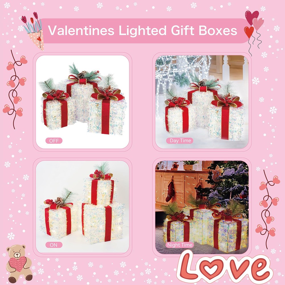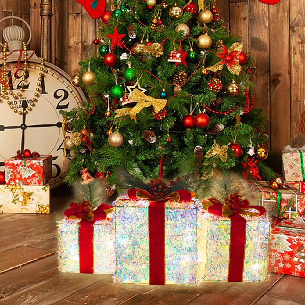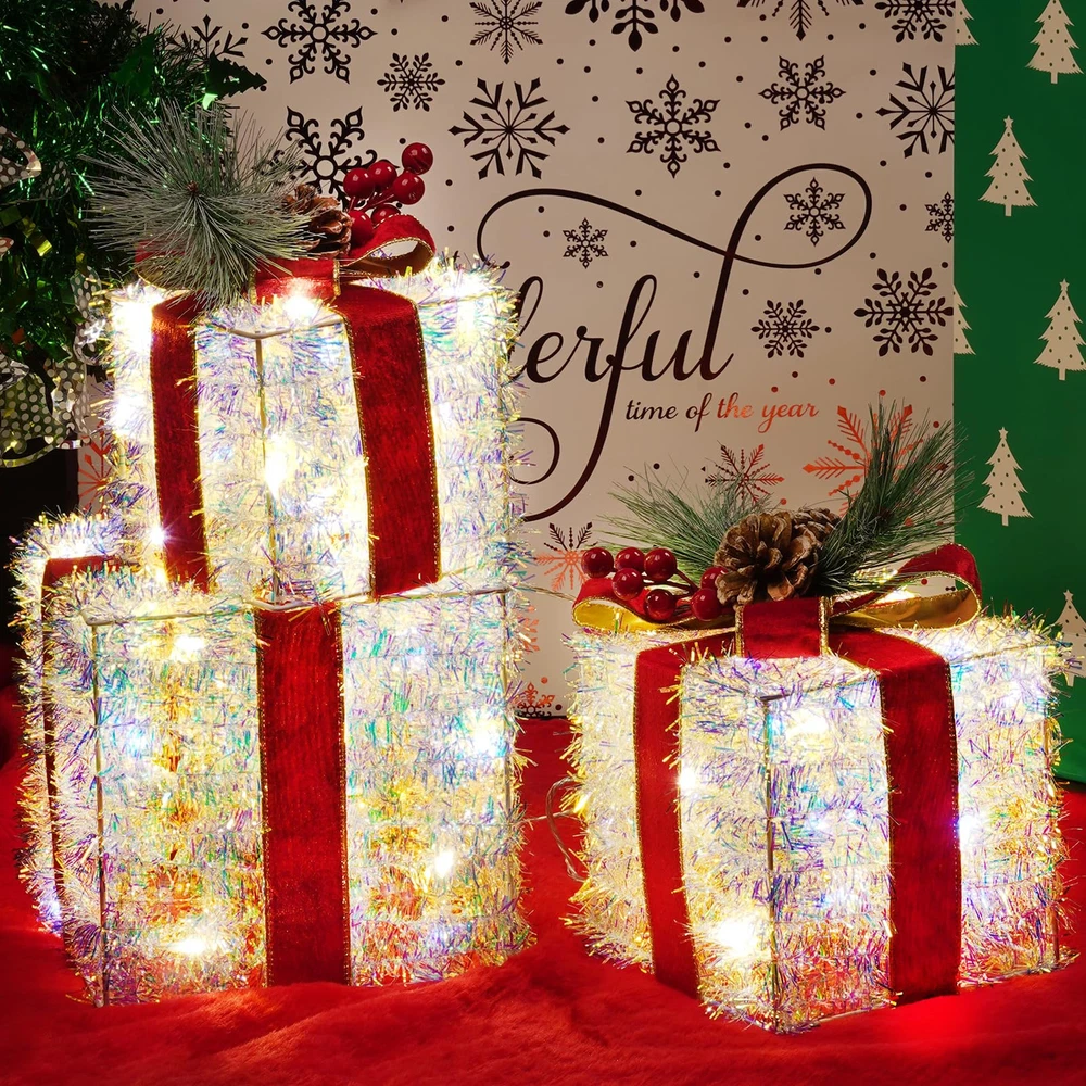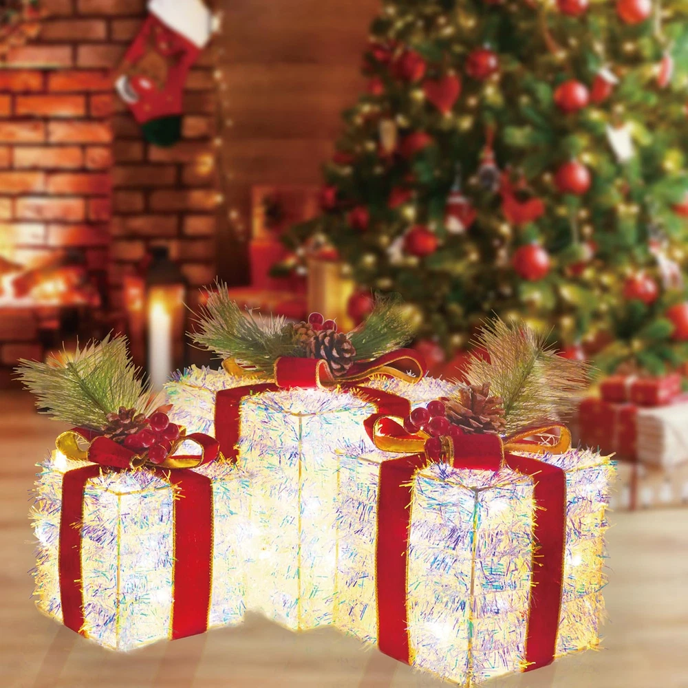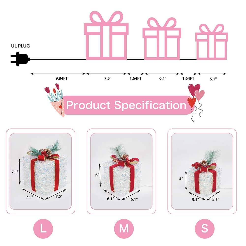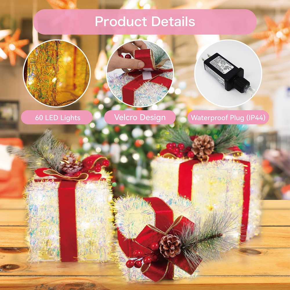 Dazzling Christmas Decor: Outdoor Christmas decorations gift box set includes three distinctively crafted gift boxes of varying sizes, ranging from large (7.5" x 7.5" x 7.1"), medium (6.1" x 6.1" x 6"), to small (5.1" x 5.1" x 5"). Each box is adorned with a velvet bow and vivid pinecone berries. Safe and Durable: Crafted from high-quality materials, Christmas yard decorations gift boxes with their weather-resistant design, you can count on them to shine brilliantly throughout the holiday season. We prioritize safety and quality. These Christmas decorations indoor home decor gift boxes are UL-certified, ensuring your peace of mind while they adorn your home. Effortless Assembly: Simple setup in minutes - just unfold, fix the bow, and plug in. No tools are required, so you can enjoy your decorations in no time. Share the holiday spirit by gifting these charming outdoor holiday decorations boxes to family and friends. They make a delightful present that adds a touch of magic to any space. Brilliant Energy-Efficient LED Lights: One of the standout features of these outside Christmas decorations gift boxes is their enchanting LED illumination. Energy-efficient and long-lasting, these lights will brighten up your space with a warm, inviting glow. The 60 LEDs are meticulously placed to ensure even distribution, creating a harmonious display of light. Versatile Decoration: These outdoor Christmas decor gift boxes are more than just decorations; they are a symbol of the joy and warmth of the holiday season. Whether you want to decorate a living room, office, storefront, porch, garden, or entryway, these lighted outdoor Christmas decorations gift boxes are versatile enough for both indoor and outdoor use and will create a cheerful and inviting atmosphere for all to enjoy.