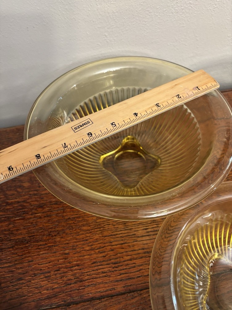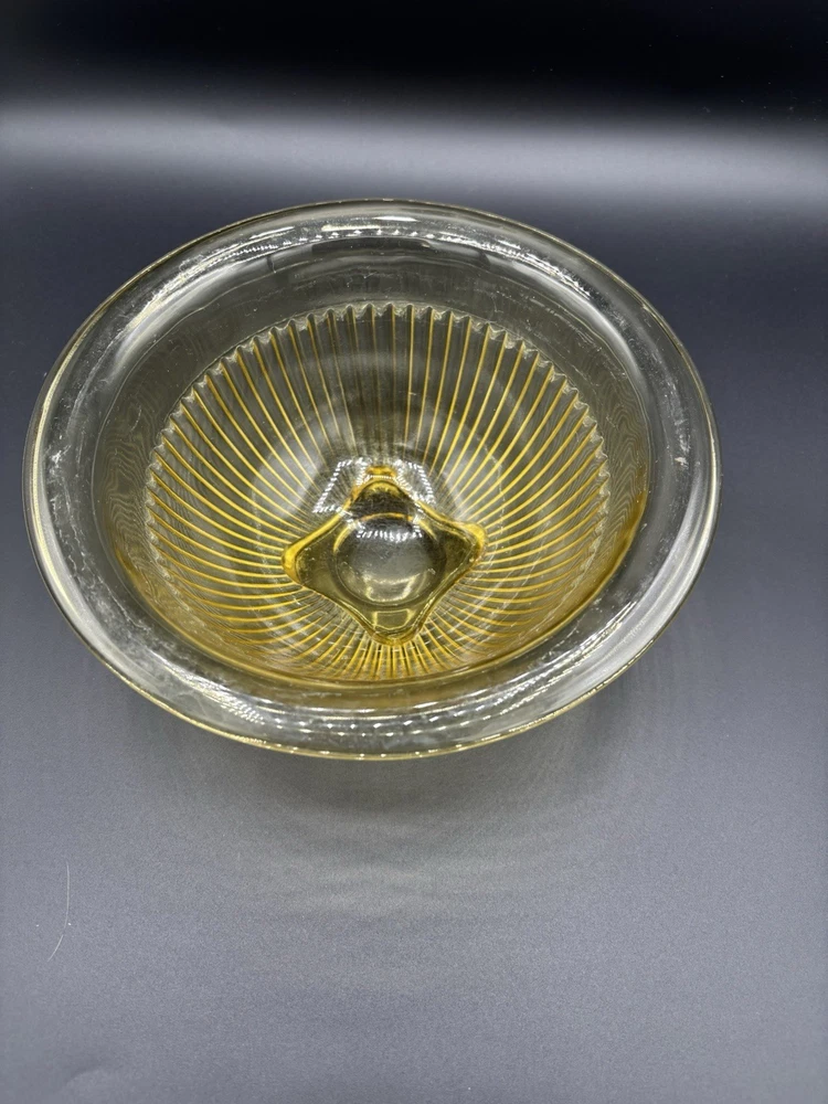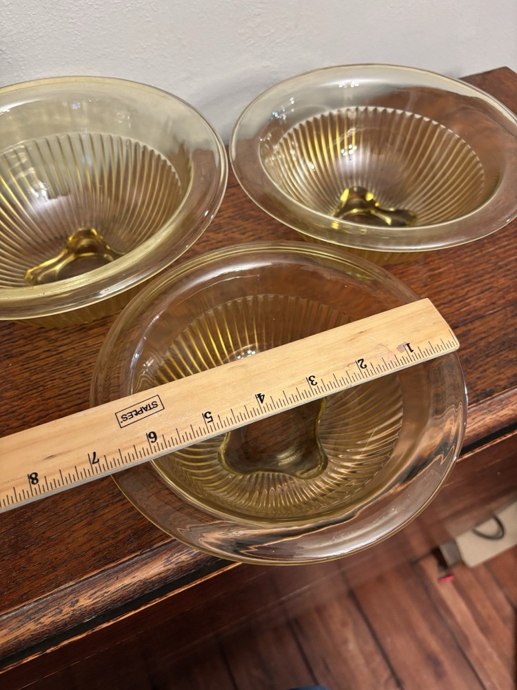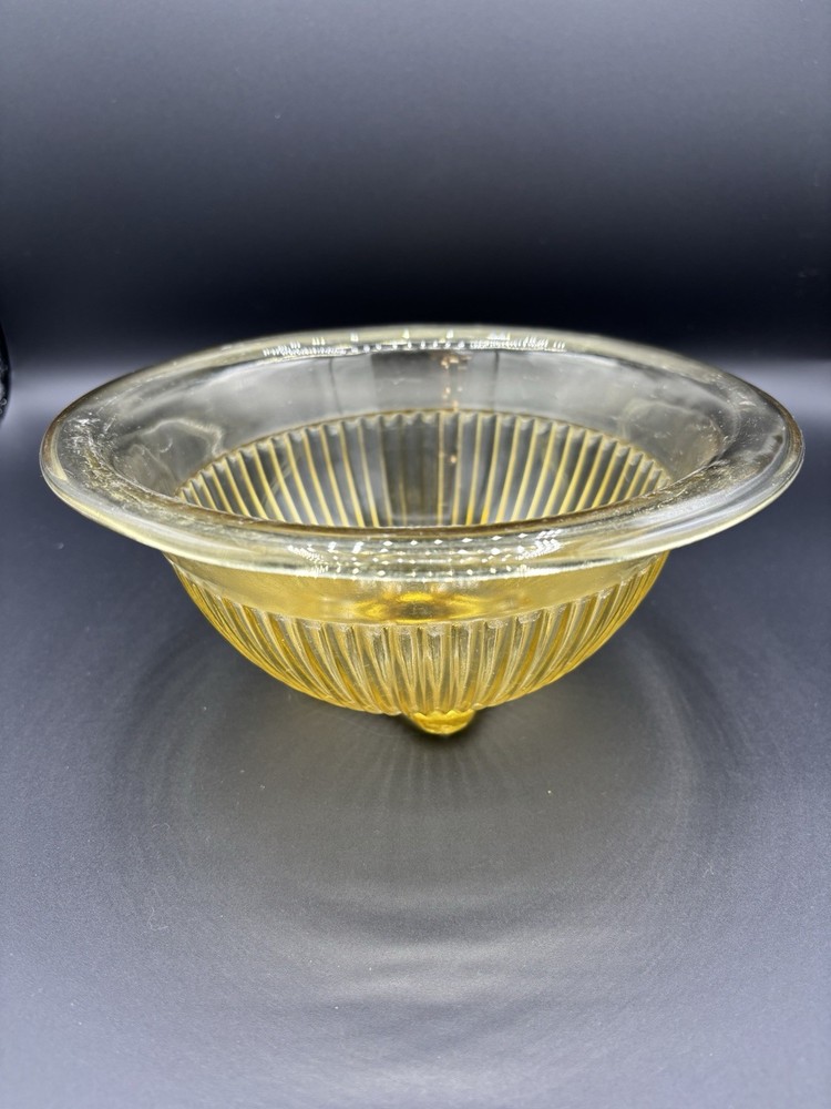 This set consists of three vintage yellow federal depression gold depression glass ribbed mixing bowls. Made from high-quality glass, these bowls are not only functional but also beautifully decorative. The yellow color and ribbed design add a touch of retro charm to any kitchen or dining area. Perfect for adding a vintage touch to your collection or as a unique gift for collectors of decorative items. The smallest bowl’s diameter measures to be 7 inches, the medium bowl’s diameter measures to be 7.5 inches, and the largest’s diameter measures at 8.5 inches.