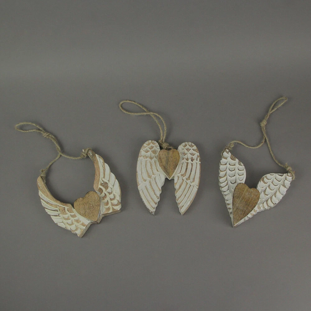Heart A - Dimensions - 5.75" W, 1" D, 6" H; Heart B - Dimensions - 5.75" W, 1" D, 6" H; Heart C - Dimensions - 4.75" W, 1" D, 5.75" H Artistic Craftsmanship - Meticulously crafted from sustainably sourced wood, ensuring detailed and enduring sculptures. Timeless Rustic Appeal - Adorned with a white painted finish, these pieces exude a timeless charm, complementing various decor styles. Effortless Display - Each sculpture features an 8-inch drop twine hanger, facilitating a quick and easy installation in any room. Heartfelt Gift - A perfect present for yourself or loved ones, these angelic wooden sculptures add a touch of grace to any home. Our eBay Store About Us Add to Favorite Sellers Set of 3 Rustic Wood Angel Wings Heart Sculptures with White Painted Finish and Twine Hanging - Each 5 Inches High - Timeless Wall Decor Art for Living Spaces Heart A - Dimensions - 5.75" W, 1" D, 6" H; Heart B - Dimensions - 5.75" W, 1" D, 6" H; Heart C - Dimensions - 4.75" W, 1" D, 5.75" H Artistic Craftsmanship - Meticulously crafted from sustainably sourced wood, ensuring detailed and enduring sculptures. Timeless Rustic Appeal - Adorned with a white painted finish, these pieces exude a timeless charm, complementing various decor styles. Effortless Display - Each sculpture features an 8-inch drop twine hanger, facilitating a quick and easy installation in any room. Heartfelt Gift - A perfect present for yourself or loved ones, these angelic wooden sculptures add a touch of grace to any home. Infuse your living spaces with a touch of divine elegance using this exquisite set of three angel wings sculptures, adorned with heart-shaped designs. Meticulously handcrafted from sustainably sourced wood, these sculptures exemplify the fusion of artistic craftsmanship and natural beauty. The intricate details, combined with the harmonious blend of natural wood and a white painted finish, create a timeless aesthetic that seamlessly complements various home decor styles. Each sculpture, measuring approximately 5.75 inches wide, 1 inch in depth, and 5 inches high, is equipped with an 8-inch drop twine hanger, ensuring effortless and versatile display options. Hang them in your living room, kitchen, bathroom, or bedroom to add a touch of rustic charm and serenity to your surroundings. The artisanal quality of these wooden angel wings makes them a unique and thoughtful gift, whether you're treating yourself or surprising friends and family. Elevate your home with the ethereal beauty of these sculptures, allowing the angelic presence to inspire moments of tranquility and grace in your daily life. Embrace the fusion of rustic and elegant elements, creating a warm and inviting atmosphere that resonates with the timeless appeal of these heavenly adornments. Product Details Color Brown Height 6 Length 5.75 Weight 1 LB