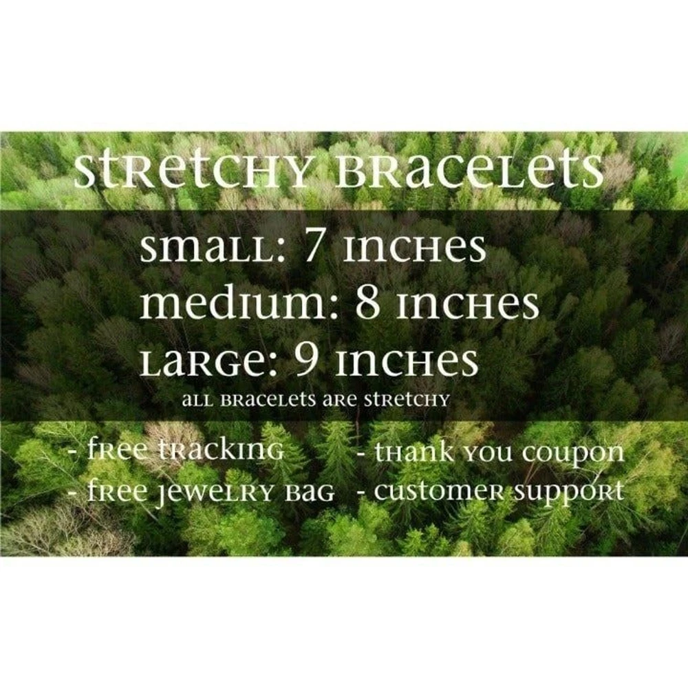 Yoga Mala Crystal Healing Bracelet. The most powerful yoga bracelet available on etsy. Our healing crystal mala bracelets or perfect as yoga gifts, or for wearing during meditation. If you do yoga, or just enjoy yoga styled jewelry, don't wait. This crystal jewelry goes fast! We've crafted a powerful blend of high energy crystals made to make the most out of your life, meditation, or yoga. High Quality Genuine Crystals and Cedar Wood Water Resistant Gemstone bracelet Handmade by us. XSmall: 6.5 Stretchy Small: 7" Stretchy Medium: 8" Stretchy Large: 9" Stretchy CRYSTAL EARTH BRACELET: This yoga bracelet has been designed for ultimate grounding. Agate: Grounds and brings focus. A great stone for calming and relaxing. Peridot: Encourages the heart to open. Attracts abundance. Unakite: A powerful stone of deep healing. Releases past traumas and eases the subconscious mind. Cedar Wood: Cedar, a species of strength, wisdom, and courage. Humbling, and brings inner peace. CRYSTAL