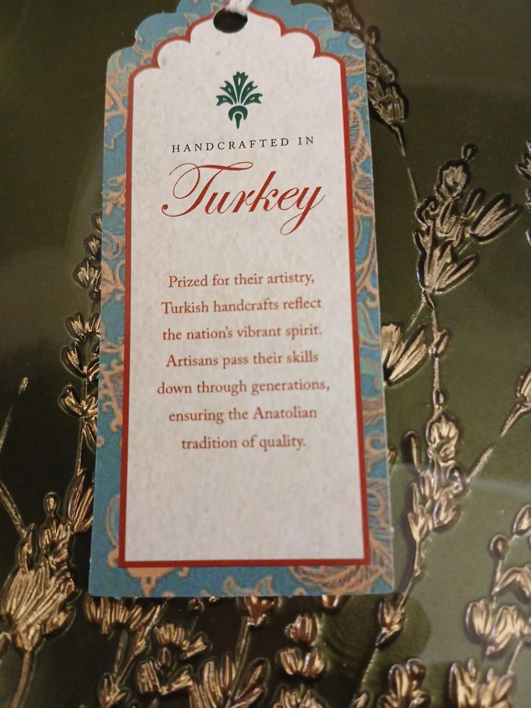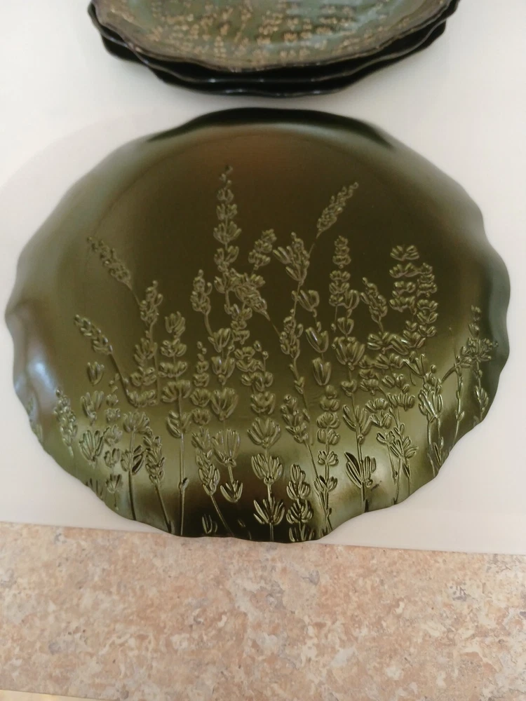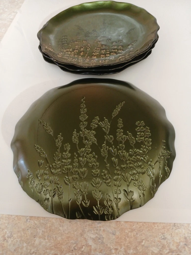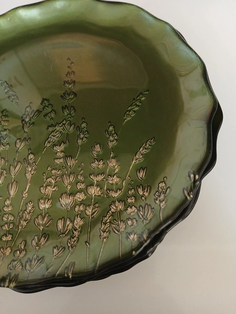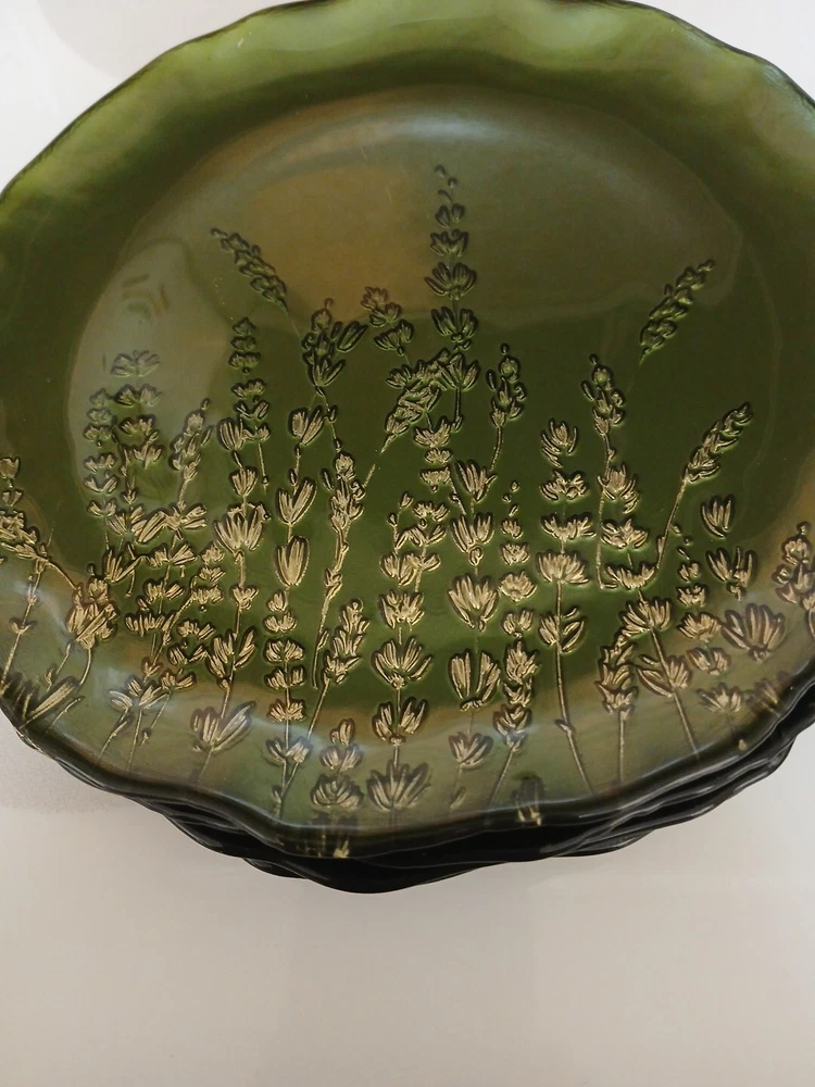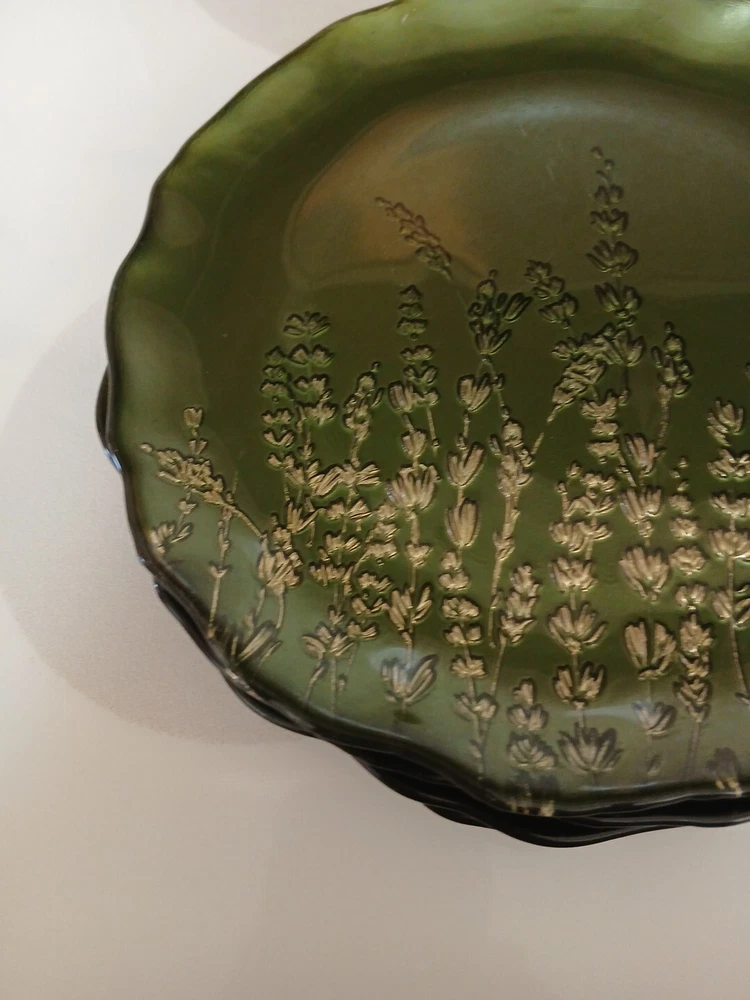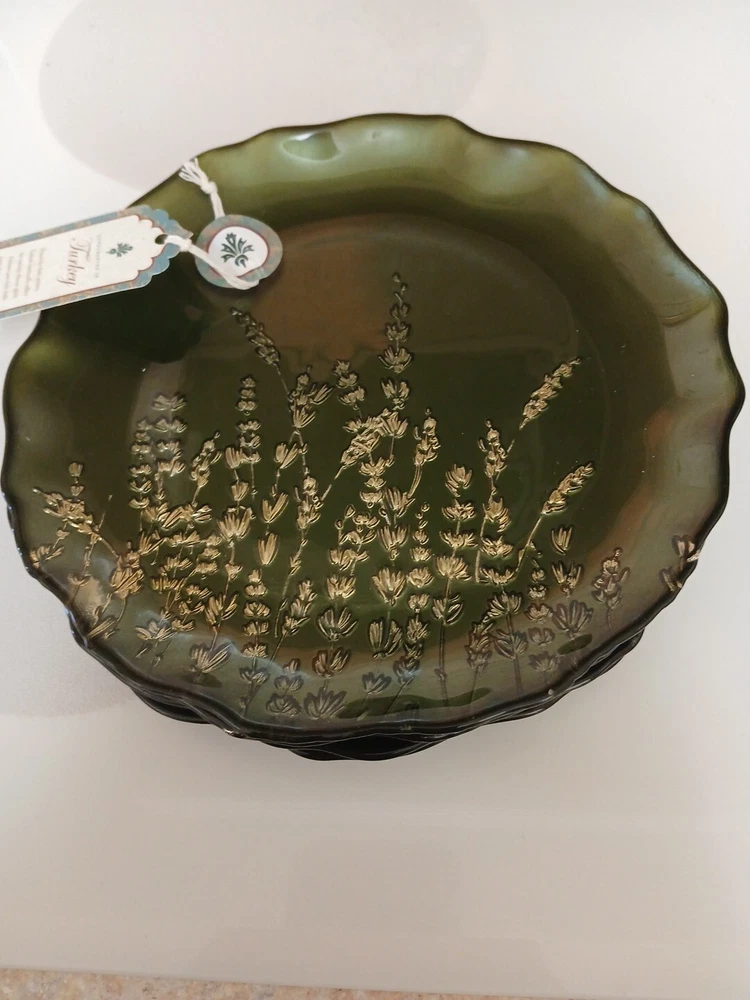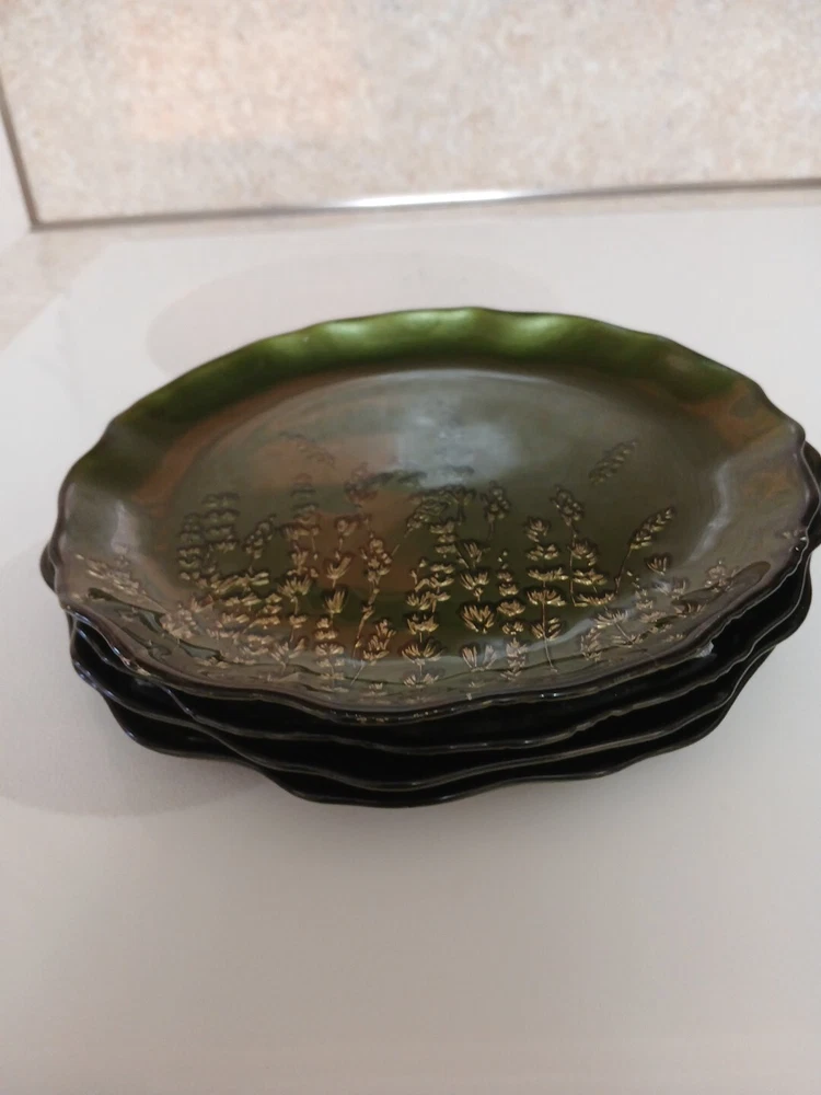 Set of 4 Artisan Olive Green & Gold Glass 8" Salad Plates with Gold Grasses Scalloped Edges Hand Wash Only A beautiful, elegant addition to your table setting I also have listed the matching: 11" Dinner Plates; item # 315936088016 I will do combined shipping if you buy any other of my other items. The bright white spots in the photos are just reflections from the lights Comes from a clean, smoke free, pet free home Buy with Confidence - see my feedback Check out my eBay store for more amazing items