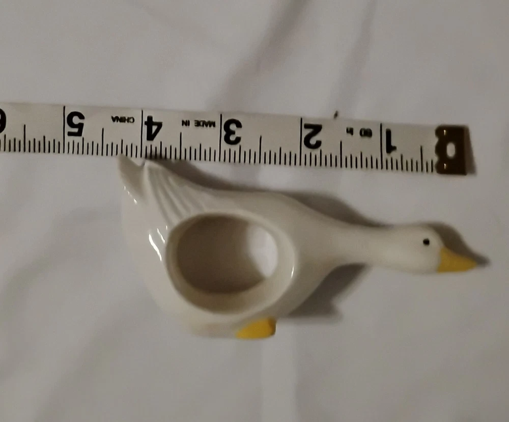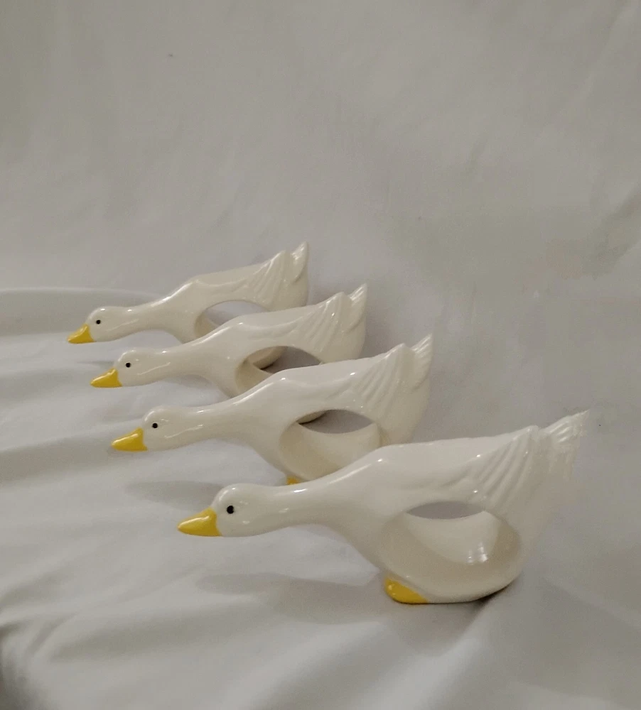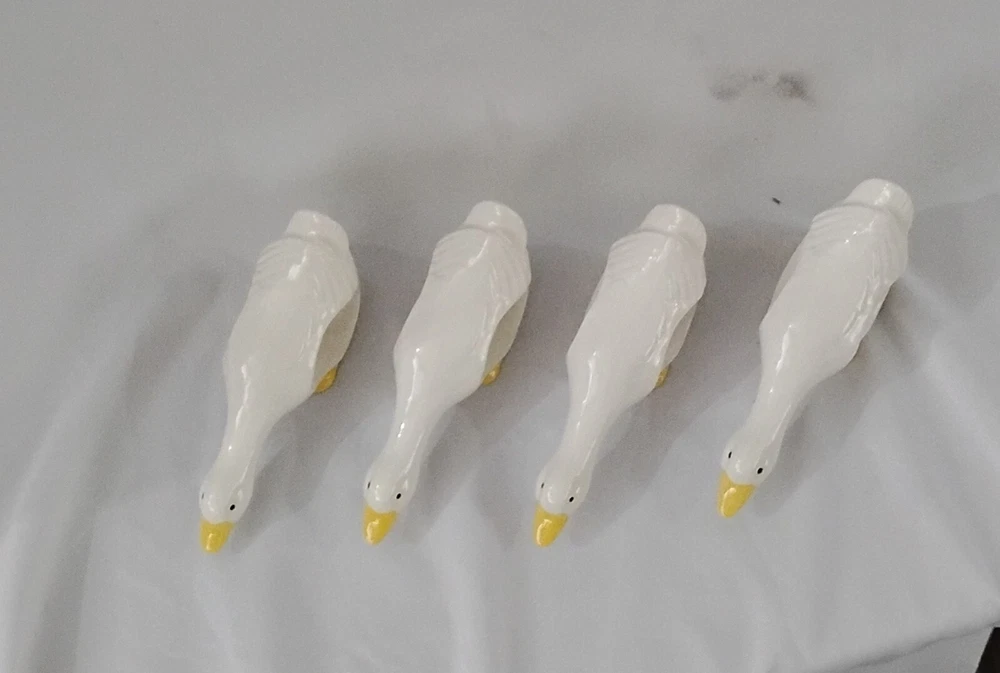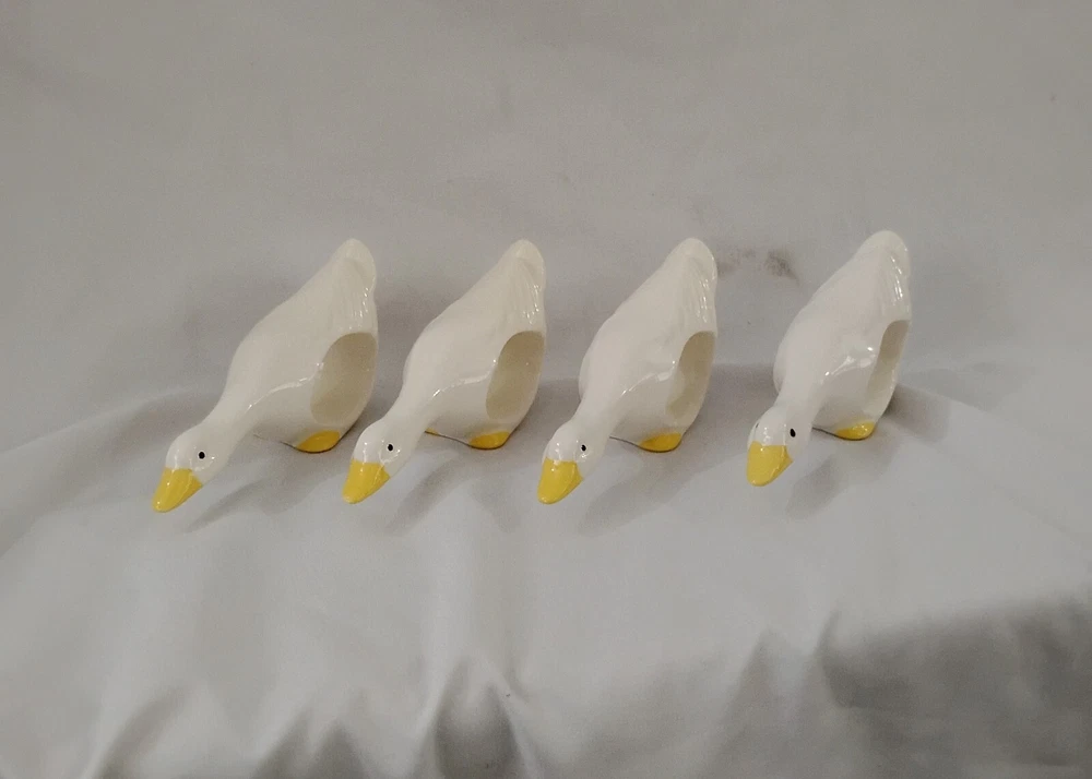 Add a touch of nature to your dining table with this set of 4 ceramic duck napkin rings. These rings feature a cute white duck design with a smooth finish, perfect for any occasion - from Easter to baby showers, or even just as a gift for a loved one. Measuring less than 4 inches in length and less than 2 inches in width, these napkin rings are the ideal size for any table setting. Crafted from high-quality ceramic material, these napkin rings are built to last and bring a touch of country style to your kitchen. The set includes four rings, each with a unique number in pack. These original, licensed reproduction napkin rings are perfect for collectors and animal lovers alike. Add a touch of charm to your dining experience with these adorable duck napkin rings.
