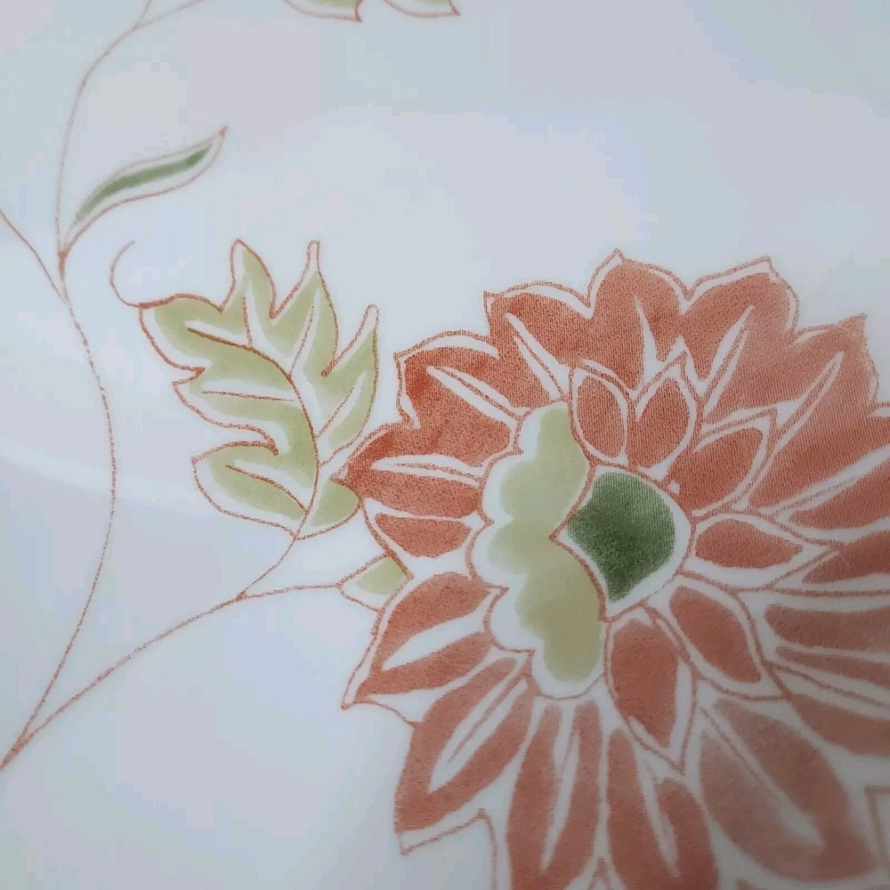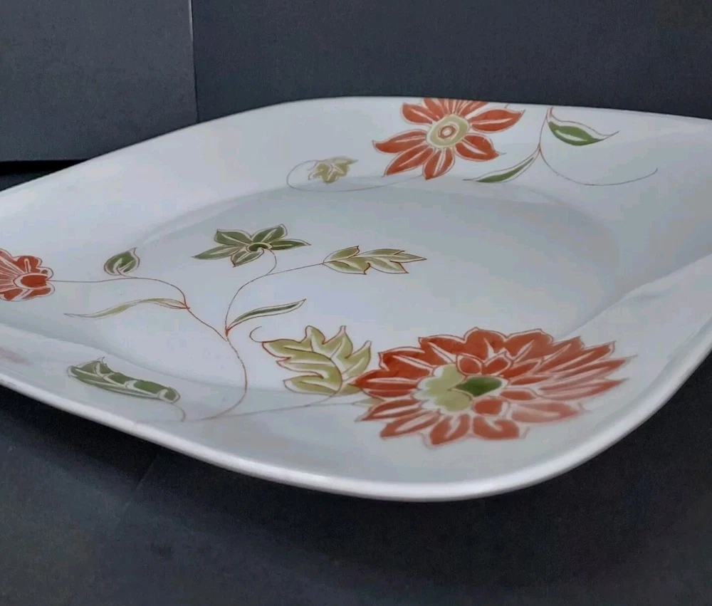 These white square dinner plates feature a fresh orange/red floral design with green and sage leaves. They were made from 2014-2019. The plates are in excellent pre-owned condition with no chips or cracks.