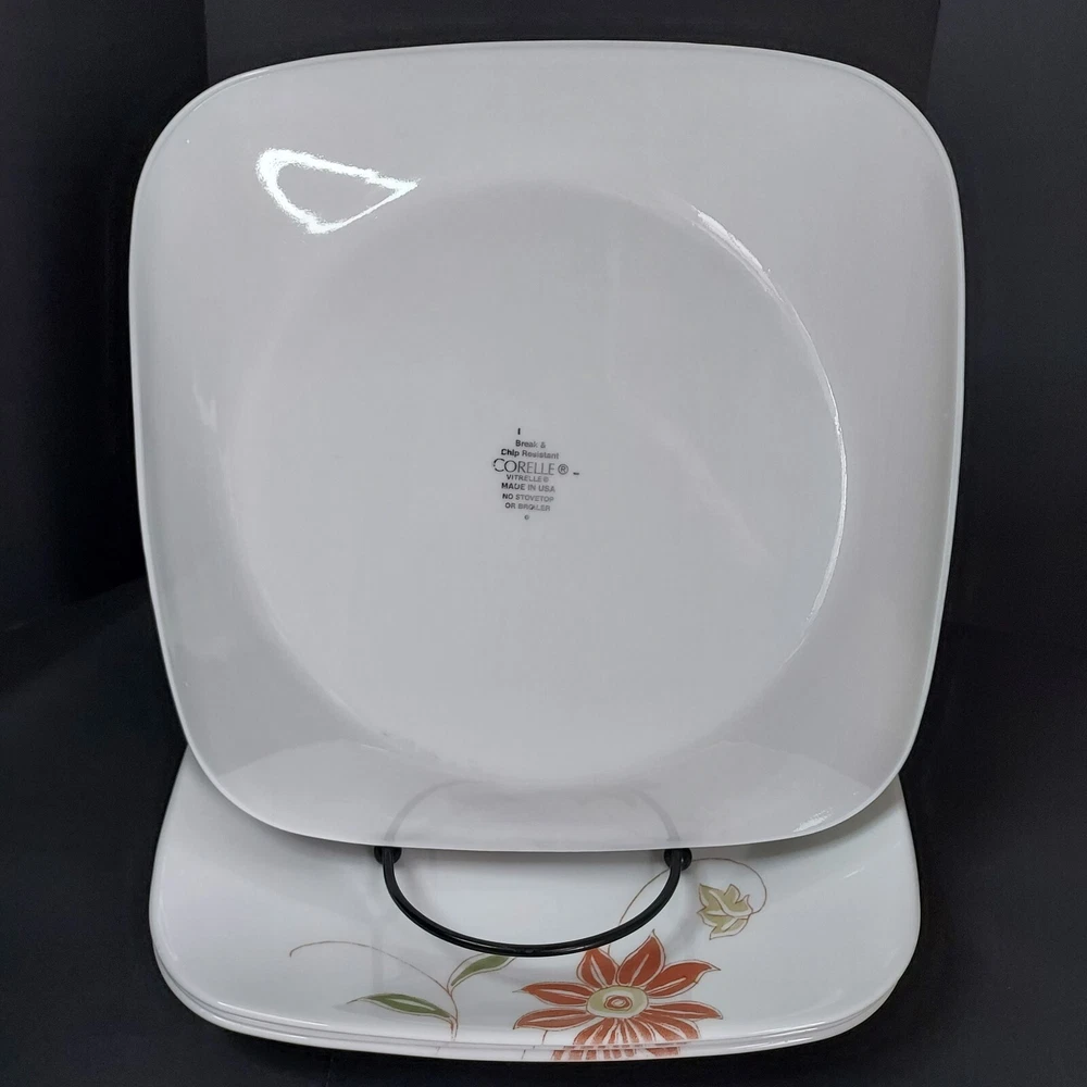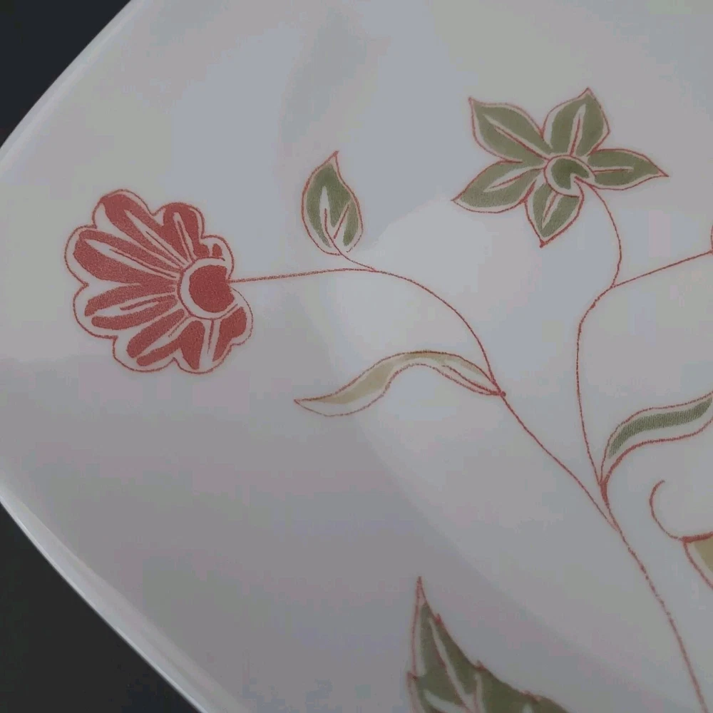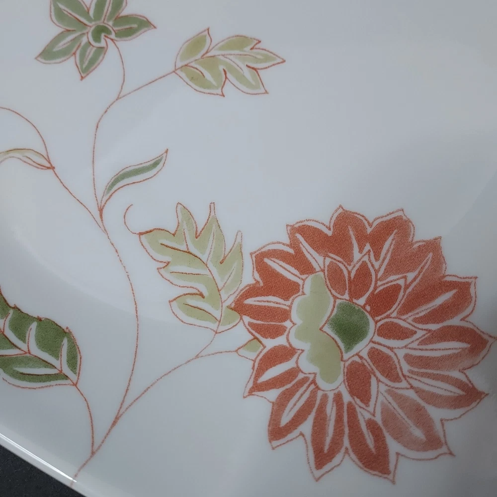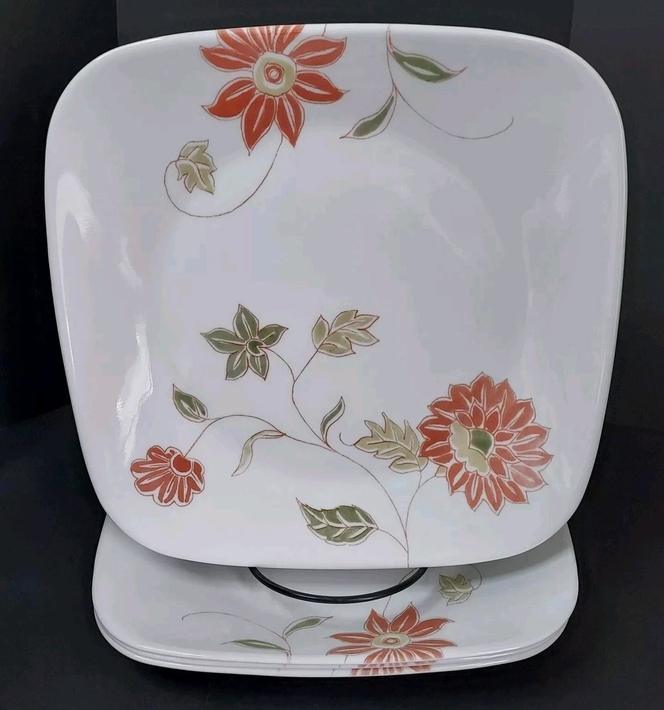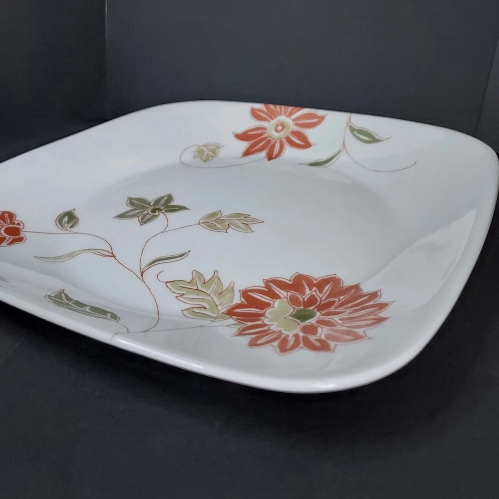 These square white plates feature a fresh orange/red floral design with green and sage leaves. They were made from 2014-2019. The plates are in excellent pre-owned condition with no chips or cracks.