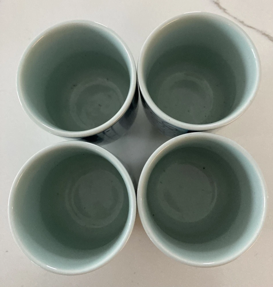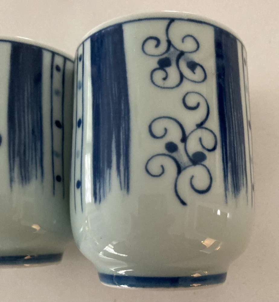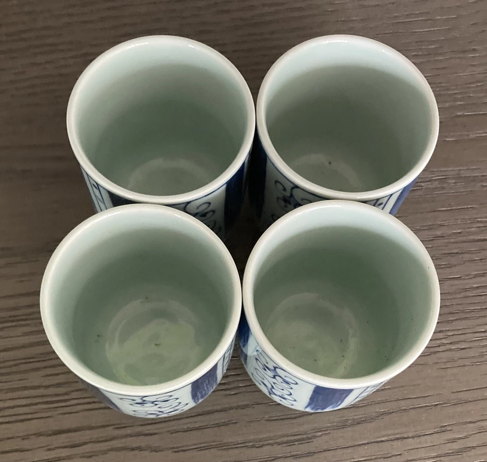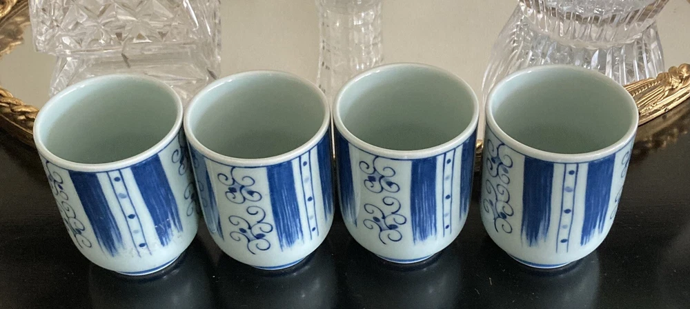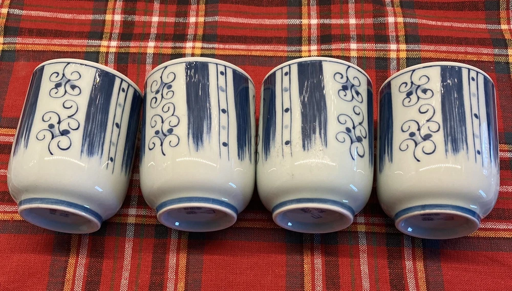 Set of 4 Japanese Sake Tea Cups Blue White Marked Footed Pottery Porcelain. 3 1/4” tall, 2 3/8” across top. Preowned/condition is used. Please use zoom to see detail and condition. Very nice set with unique pattern. Shipping in Continental US only. Shipping USPS Ground Advantage.