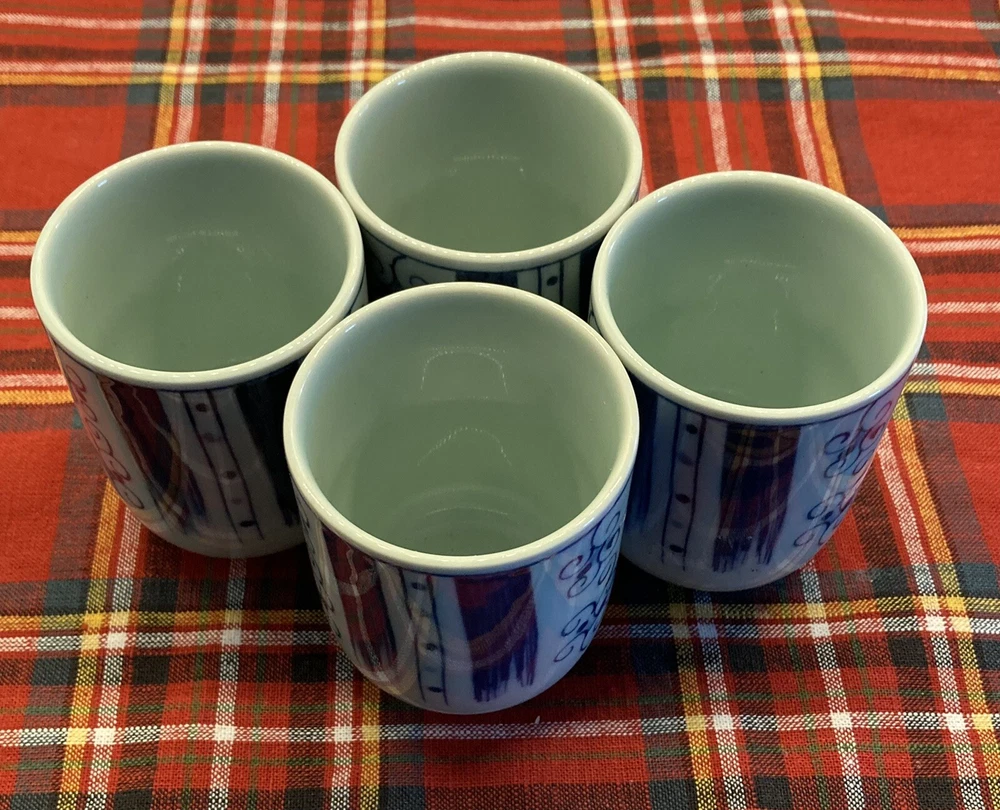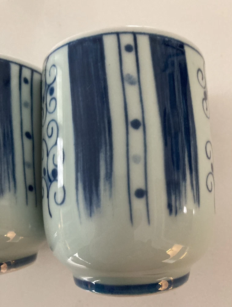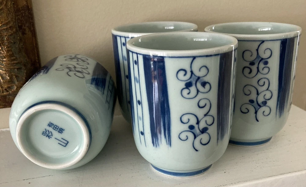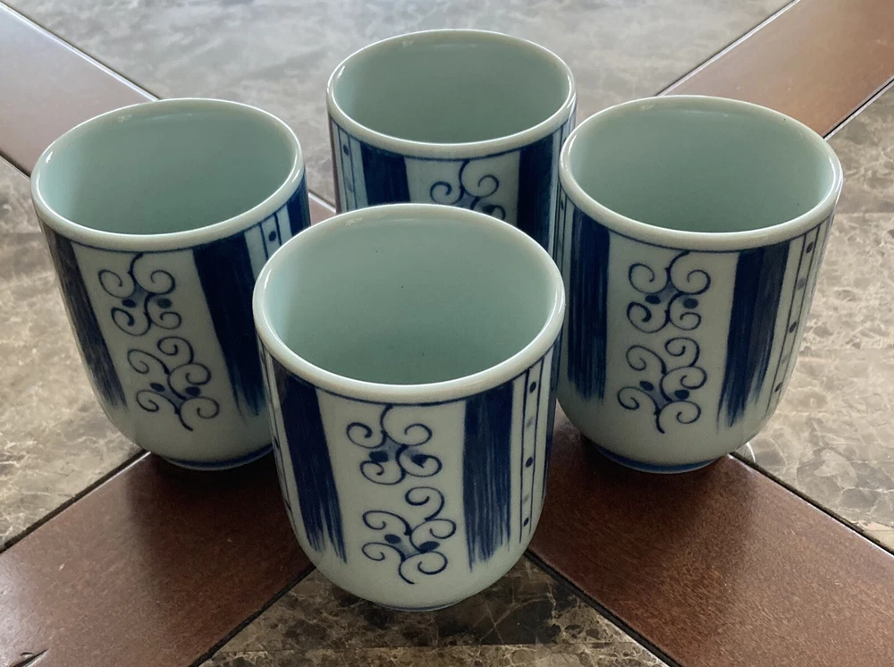 Set of 4 Japanese Sake Tea Cups Blue White Marked Footed Pottery Porcelain. 3 1/4” tall, 2 3/8” across top. Preowned/condition is used. Please use zoom to see detail and condition. Very nice set with unique pattern. Shipping in Continental US only. Shipping USPS Ground Advantage.