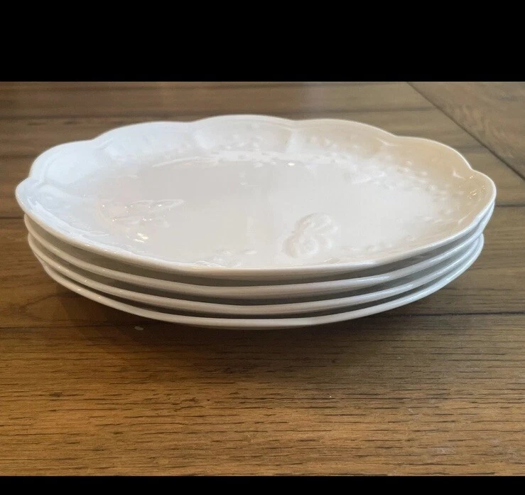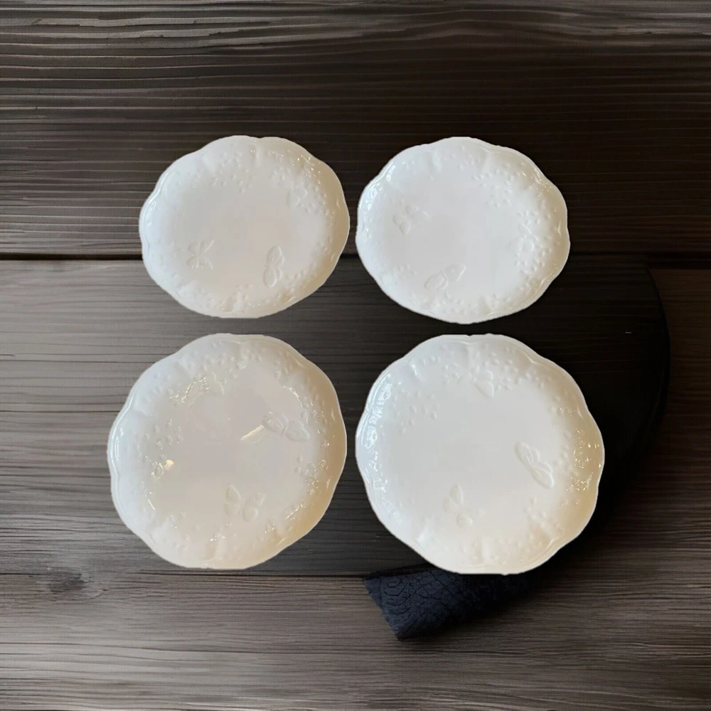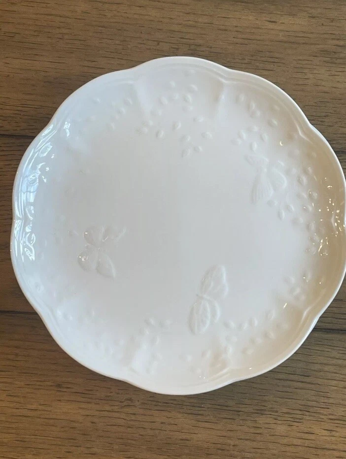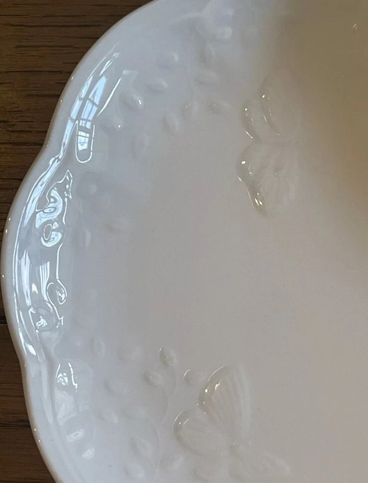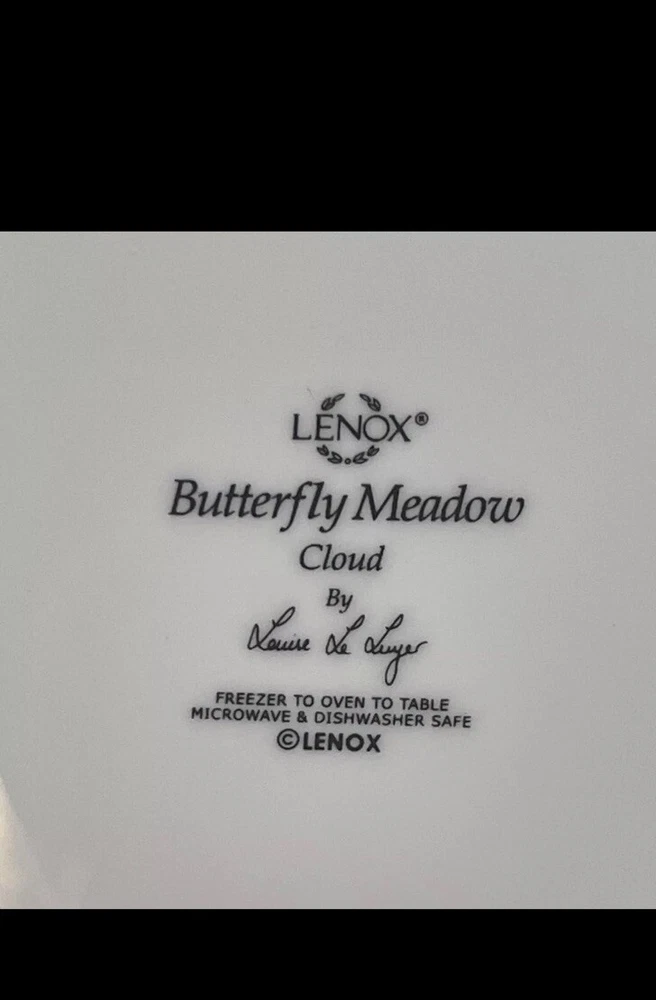Elevate your dining experience with this stunning set of 4 Lenox Butterfly Meadow Cloud Accent Luncheon Plates. The plates feature a beautiful butterfly meadow pattern on a white background, making them perfect for any occasion. Made of high-quality bone china, these plates are durable and dishwasher safe. The set includes 4 place settings, each with a plate that adds a touch of elegance to your table. The plates were manufactured in Indonesia between 2010 and 2019, and are part of the Butterfly Meadow Cloud product line. With their art pottery production style and technique, these plates are a true work of art. Add a touch of sophistication to your dining experience with this beautiful set of Lenox plates.