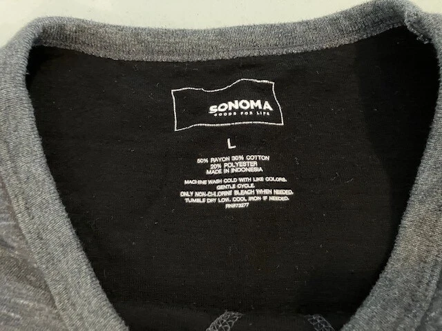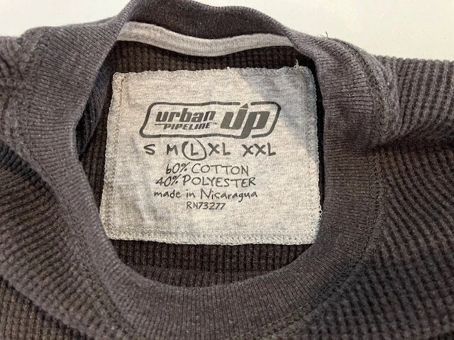 Set of 4 Men's Long Sleeve Shirts- Includes Urban Pipeline Dark Gray Thermal Shirt- Size L- 60% Cotton/40% Polyester; Sonoma Dark Gray Flecked Thermal Shirt- Size L- 60% Cotton/40% Polyester; Sonoma Dark Gray Flecked/Black Double Knit Shirt- Size L- 50% Rayon/30% Cotton/20% Polyester; Sonoma Light Gray Sweatshirt- Size L- 69% Cotton/20% Polyester/11% Rayon. In good condition for age and use. No rips or tears. No stains. See Photos.