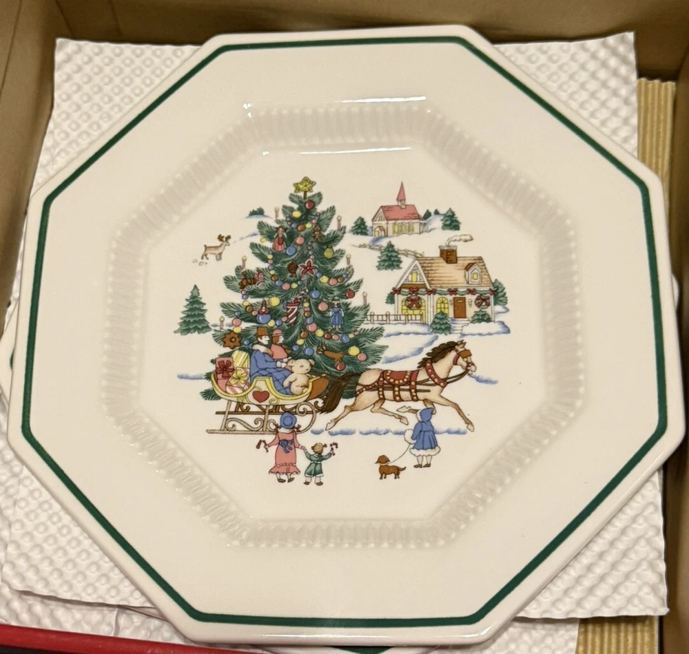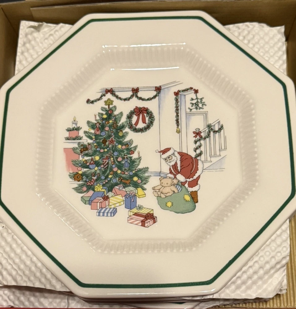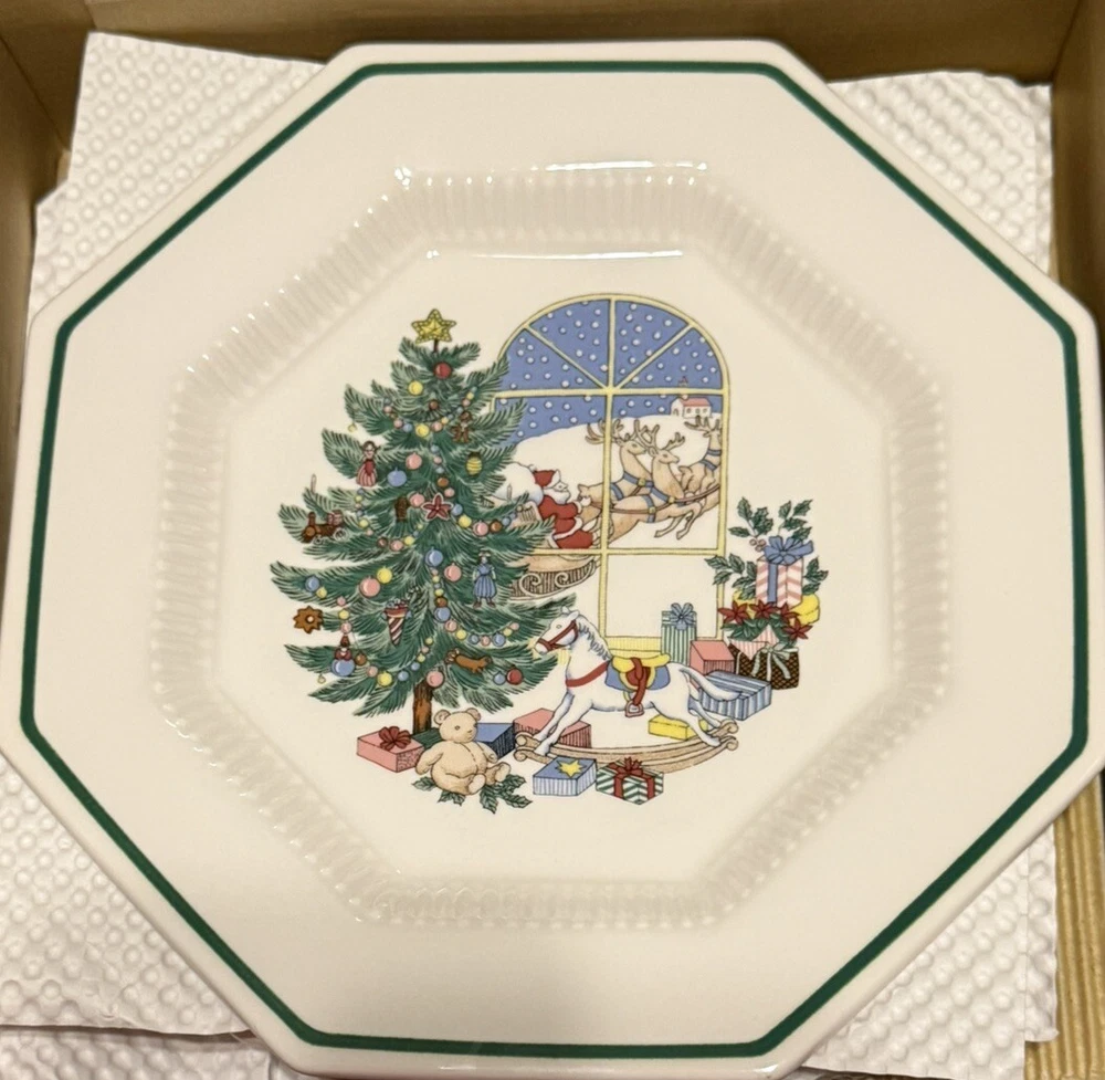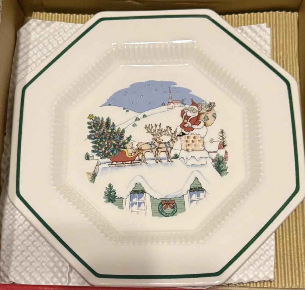 Add a touch of retro charm to your Christmas table with this set of four Nikko Christmastime Octagon 8" Salad Accent Plates. Christmas spirits design. Featuring festive designs of Santa dropping off his presents and arriving and taking off in his sleigh, these plates are perfect for serving salads or desserts. Two plates feature Santa dropping off his presents under the tree, one taking off from the roof and one of him flying through the sky.
