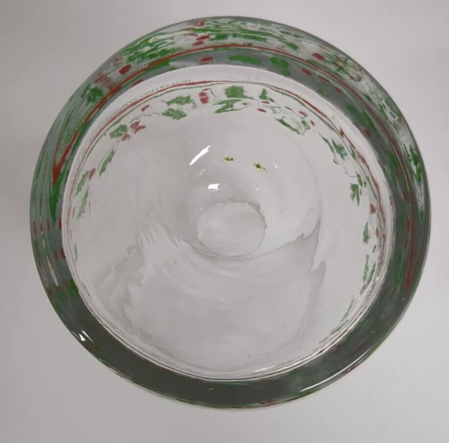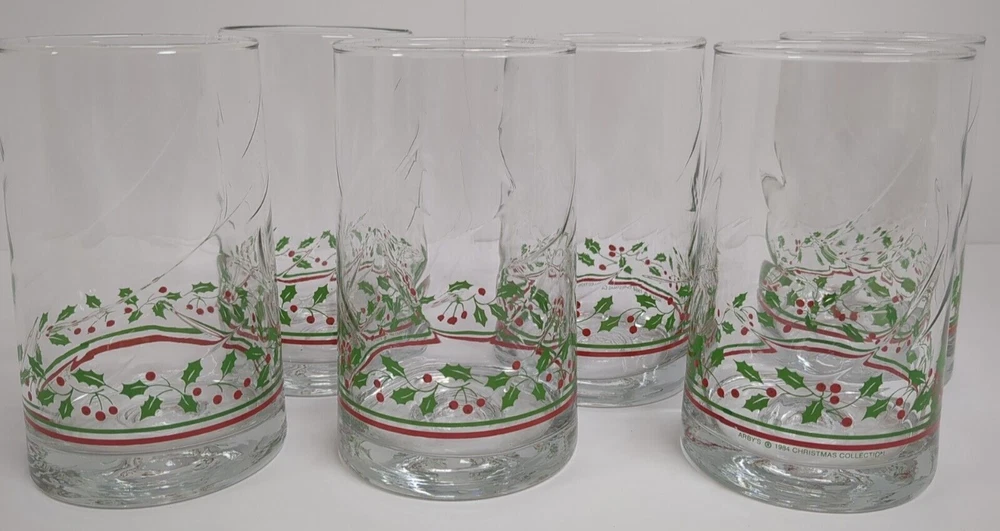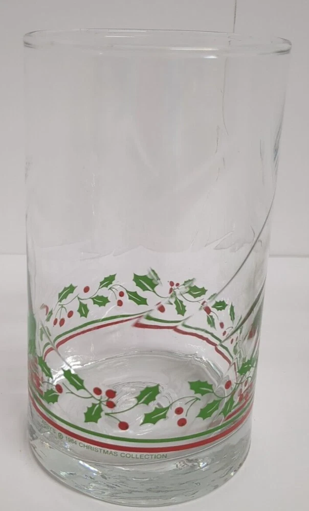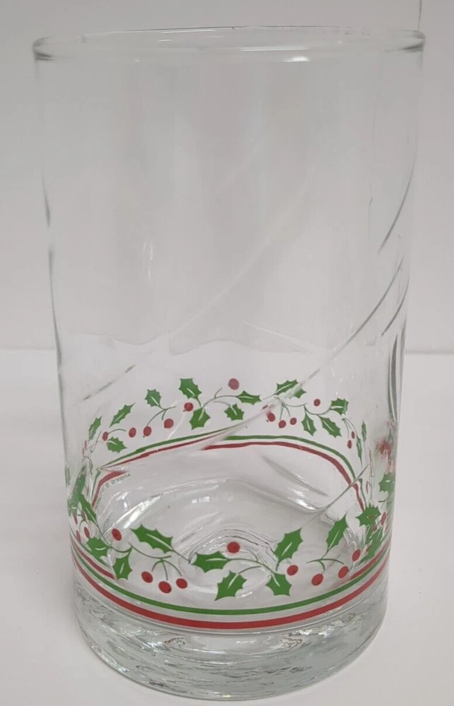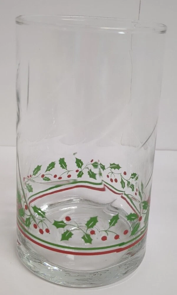 This set of 6 vintage Libbey Christmas flat tumblers features a festive design perfect for the holiday season. Each tumbler is made of clear glass with a red and green holly berry ribbon pattern, adding a touch of holiday cheer to any table setting. With a height of 5 inches, these round-shaped tumblers are ideal for serving drinks during Christmas gatherings. This set is a charming addition to your glassware collection and can accommodate a service for 6, making it perfect for hosting holiday parties or dinners.