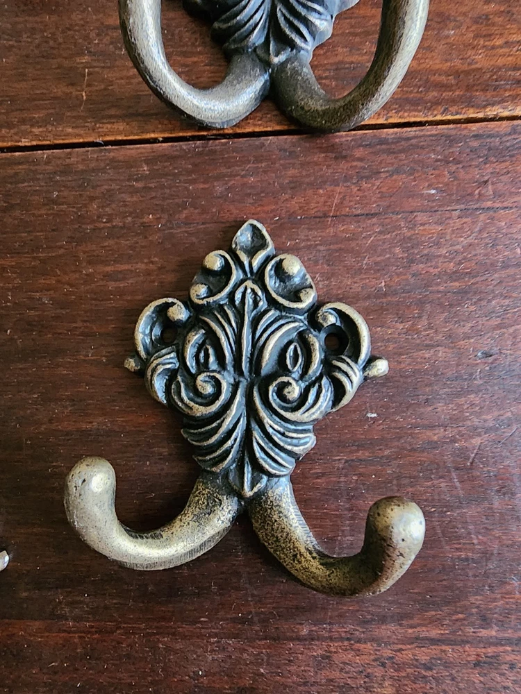Set of 6 Wrought Iron Metal 2 Peg FLoral Wall Hanging Hook Coat/Towel Gold Tone