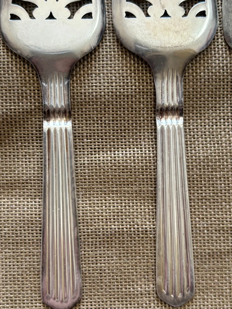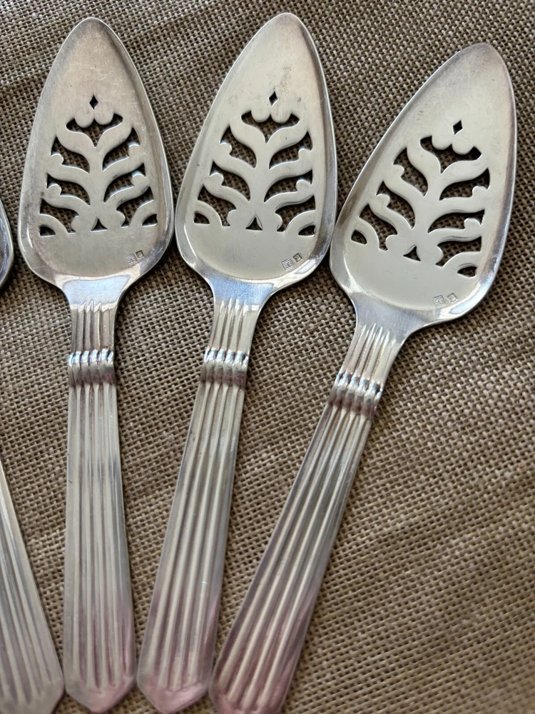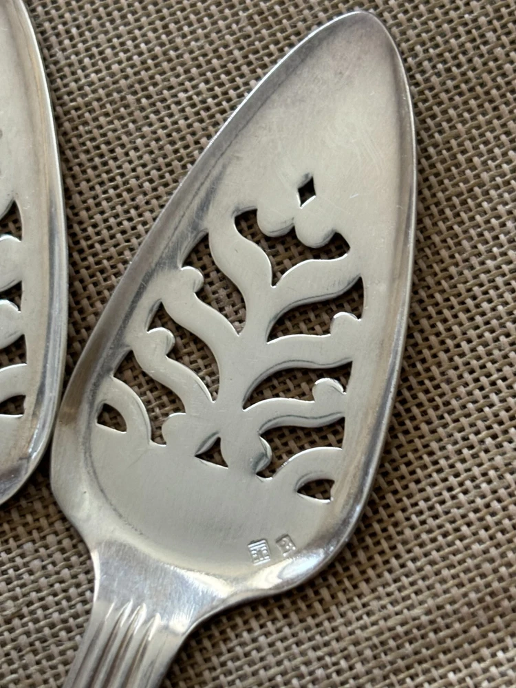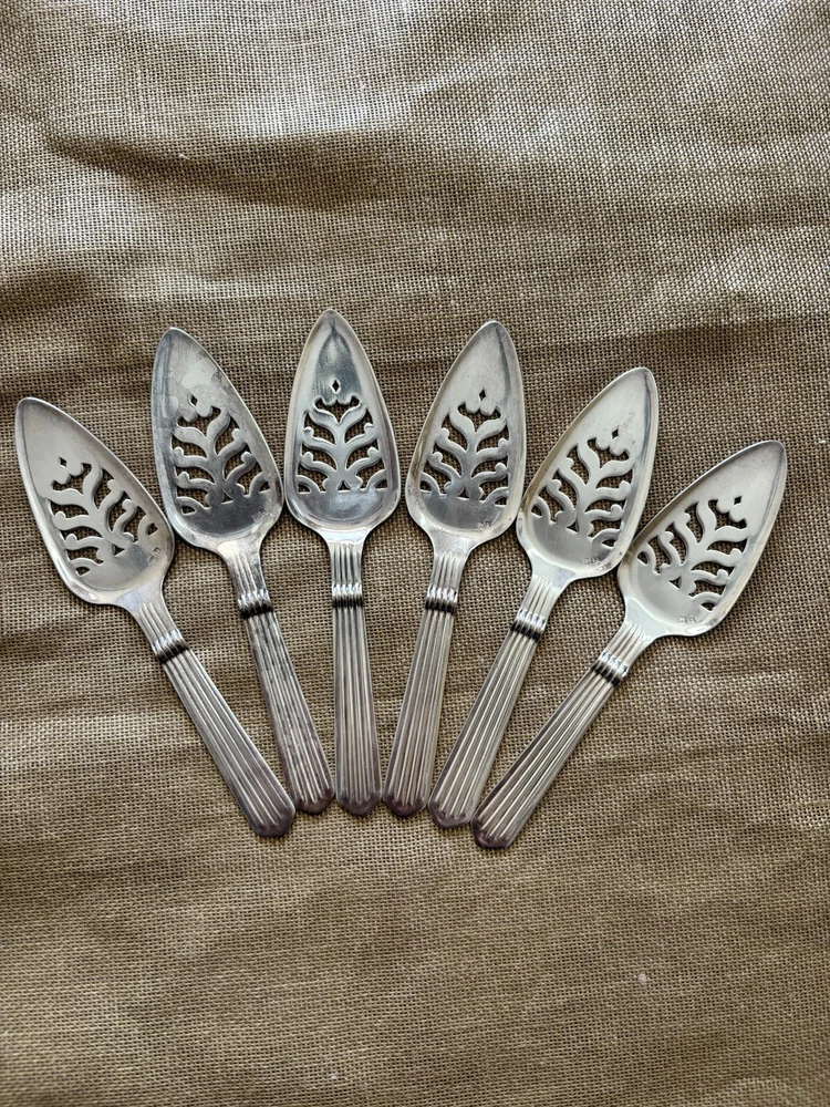 Set of 6 vintage silver plated absinthe spoons with hallmarks. Mark on left is an Arc de Triomphe, mark on right is number 2. Made in France ca. 1910. Length 6 in. Width 1.5 in. In very good condition with some signs of use.