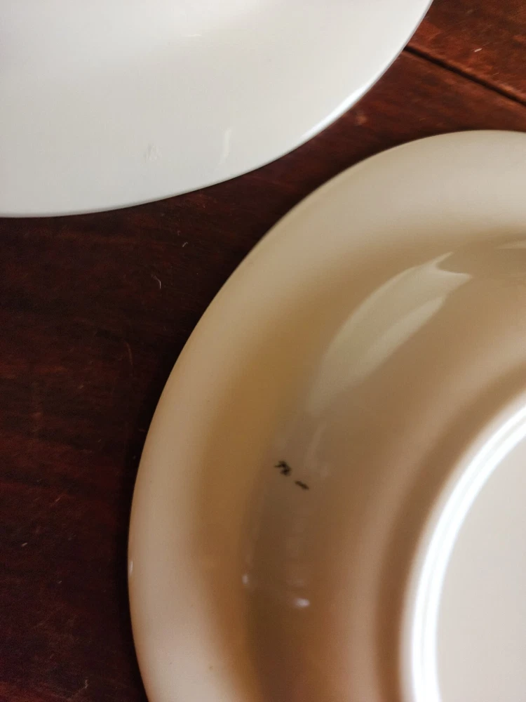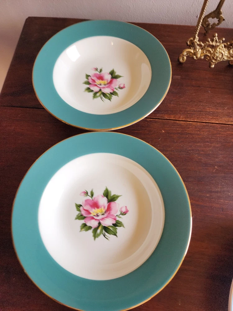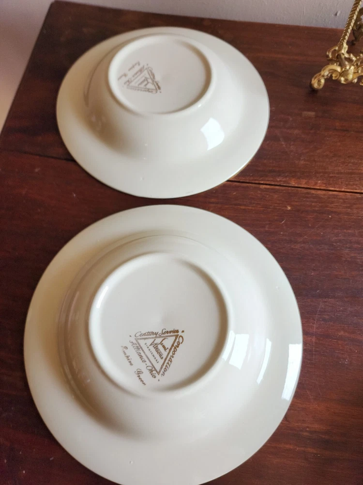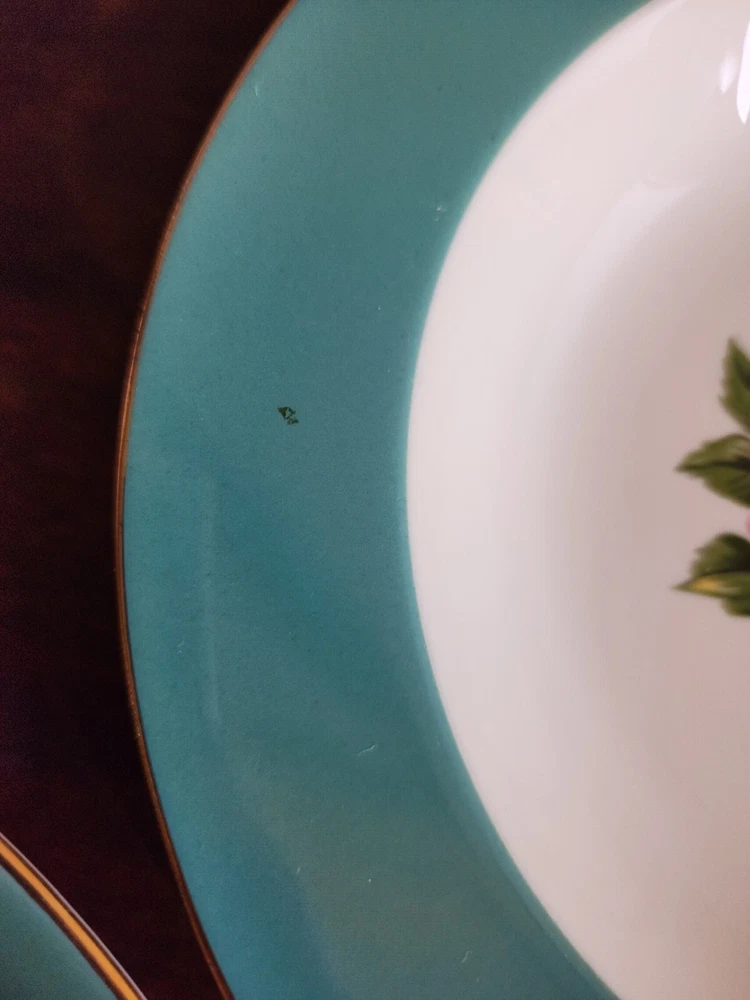 2 bowls have a tiny chip on each one. One bowls has a green spot on the green area. On the back of one has a mark. Please look at all pictures. size 8-3/8 inch
