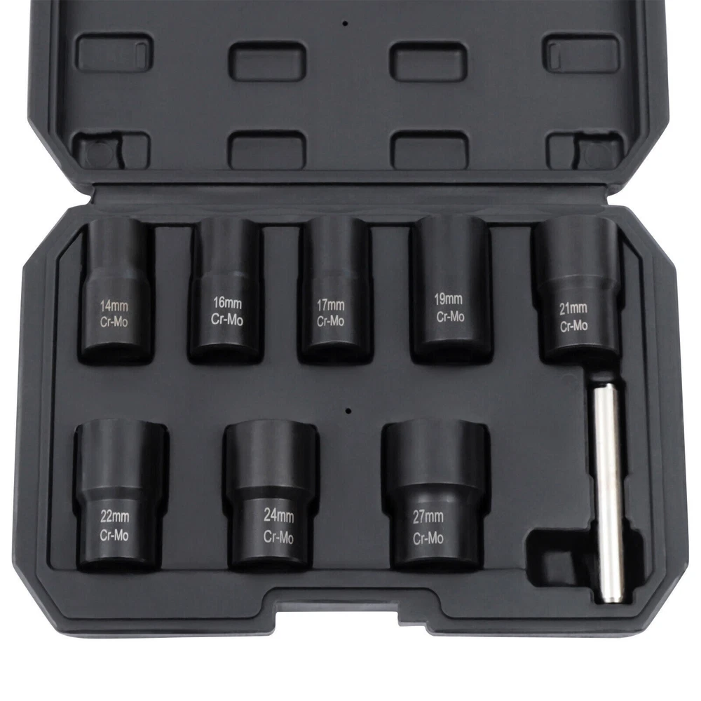 Set of 8 Impact Bolt Extractor Nut Remover Kit Stripped Extraction Socket Tools 8 Pcs Wheel Lug Nut Remover Remove Damaged Locked Nuts Bolts Extractor Tools NEW Description~ Description What if a bolt or nut is rusted or damaged and cannot be removed with a wrench? Then you'll need a bolt extractor that removes them easily. Our bolt extractor set comes in 8 different sizes to fit different diameter nuts or bolts. The 42Cr-mo material and manganese phosphate surface treatment make these bolt extractors very strong and durable with long service life. This will be a good helper for you. Key Features Strong and Durable: The item is made of 42Cr-mo, which is relatively strong and stable. It is also not easy to damage or rust under proper use and is very durable. Ergonomic Design: This cylindrical rod is a very ergonomic design. It is smoother and more comfortable to hold while you are working. You will not feel fatigued even after long hours of use, giving you great comfort. Optional Sizes: This item is equipped with 8 different diameter bolt extractors. You can choose bolt extractors with different diameters according to the size requirements of the bolts to be removed. Manganese Phosphate Treated Surface: The surface of these bolt extractors is treated with manganese phosphate, which improves the abrasion and corrosion resistance of the item. This gives the item a longer service life. Reverse Spiral Design: These bolt extractors have a reverse spiral design inside, which allows for better tucking and clamping of damaged nuts. So they can be easily removed. Easy to Carry: This item has a toolbox that is easy and convenient for you to take to the workplace you like without much effort. It is a good helper for you to improve work efficiency. Great Helper at Work: This set can help you to take out the damaged nuts or bolts easily. This is very time and effort-saving and is a good helper at work. Guaranteed Customer Service: We aim to provide quality products and services. If you have any problems, please feel free to contact us. We will reply and solve the problem for you as soon as possible. Details Toolbox: This item comes with a toolbox that will keep these bolt extractors well organized. So these bolt extractors can be easily stored and carried. Clear Markings : These bolt extractors have diameter numerical markings that are laser engraved with great clarity. This makes it easy for you to find a suitable diameter bolt extractor. Application This set can be used in factories, garages, and other places to remove damaged nuts and bolts of various sizes. Specifications Color: Black Material: 42Cr-mo Surface Treatment: Manganese Phosphate Gross Weight: 1.6kg/3.53 lbs Net Weight: 1.2kg/2.65 lbs Toolbox Size: 24*16.5*5cm/9.5*6.5*2" Bolt Extractor Diameter: 14mm/0.55"; 16mm/0.63"; 17mm/0.67"; 19mm/0.75"; 21mm/0.83"; 22mm/0.87"; 24mmm/0.94"; 27mm/1.06" How to Use Choose a bolt extractor with a diameter comparable to the nut or bolt that needs to be removed. Attach a drill to the bolt extractor and attach the end with the reverse spiral to the bolt or nut. Repeat the 360° rotation and the nut or bolt can be removed. If the damaged nut or bolt is stuck inside the extractor, you can use a rod to knock it out. Package Included 8* Bolt Extractors 1* Rod 1* Toolbox Notes Please allow the slight color difference caused by the shooting light and 1-3cm error due to manual measurement, and make sure you do not mind before you order. tu1 Payment Delivery details Terms of sales About us Contact us Payment We accept ebay payment 。 Fees such as import duties, taxes are not included in the item price or shipping costs. These charges are the buyer's responsibility. Delivery details Shipping: 2-9 working days to: USA Terms of sales We maintain high standards of excellence and strive for hundred percent customer satisfaction. Feedback is very important to us. We hope that you contact us immediately before you give neutral or negative feedback, so that we can address your concerns. It is impossible to address issues if we do not know about them! About us Your satis faction is our ultimate goal. We work hard to earn your trust and future business. Our certified technicians have tested each item before shipping. The unit comes with 1 year limited warranty on all manufacturing defects. a) If you receive a defective item, you may return it or ask for a discount. Please contact us within 14 days after you receive the package. b) What you returned must be intact and in its original packaging as re? u. Customer is responsible for shipping costs of the returned item. c) We will cover the cost of shipping back t with the shipping rate indicated in the registration page. We will send you a new unit or refund the full payment you paid. Thank you. Contact us Business Hour Business Hour: Monday To Friday: 8:30 AM to 5:00 PM (Beijing China time) Due to time zones, our reply to your questions may not be immediately. But within above working time, we will reply your email within 24 hours. If it's non-workdays, please kindly be patient and wait till Monday. Please contact us with ebay message. Please feel free to contact us if you have any questions. Monday To Friday: 8:30 AM to 5:00 PM (Beijing China time) Due to time zones, our reply to your questions may not be immediately. But within above working time, we will reply your email within 24 hours. If it's non-workdays, please kindly be patient and wait till Monday. Please contact us with ebay message. Please feel free to contact us if you have any questions.