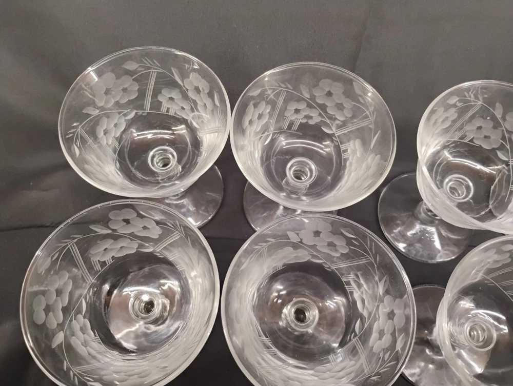 The product is a set of 9 clear coupe sherbet glasses, each measuring 4 1/2 inches in height. These glasses are made of glass and feature an etched design, adding a touch of elegance to the classic sherbet glass style. Perfect for serving sorbets, ice creams, or other desserts, these glasses would make a stylish addition to any table setting or barware collection. Thank you for visiting my listing today and thank you for your interest in this item! My goal is to have a pleasant transaction resulting in a satisfied customer. I hope any transaction between us leaves you with a feeling of confidence knowing you can trust me and the items I offer here. *Most if not all my listings are set to accept offers. Feel free to send an offer and I will be happy to consider it!! *Please contact me with any questions or concerns and I will be happy to help. *Always examine the photos carefully, and if in doubt, email me with any questions you may have. *Please note that condition statements are offered as a guide only. They will always be somewhat subjective and reflect our opinion, which may not necessarily agree with someone else's opinion. PLEASE READ: I aim to please and I want my buyers to have a positive transaction with me. If you have questions, concerns, or special requests related to any of my items I hope you will contact me so we can work them out to your satisfaction. I sell my items to give you a great item at a decent price while making a little profit at the same time. If you feel the item you are interested in is too pricey do not hesitate to send me a fair offer and I will consider it. My goal is to satisfy your needs and mine so both parties can benefit. SHIPPING: If you prefer a different shipping method or company please contact me and I will do all I can to make that happen. If you have concerns or requests about the packaging of your item contact me and I will do all I can to accommodate them. Shipping costs are based on location in each state or country, the costs always differ. After I have received your payment I will ship your item out within 3 business days or less excluding weekends and holidays. BEFORE PURCHASING & BIDDING: **Please see all the pictures. I do not have great photography skills but I try to get the most accurate photos I can. If you are unsure about something you see in a photo contact me so I can do what I am able to answer your concern about the item. **I cannot stress enough that if you have any questions or concerns please contact me before purchasing and bidding. Communication can solve so much. **As a customer myself, I understand the meaning of customer satisfaction and my goal is to have nothing but satisfied customers. If you are not unsatisfied with your purchase I ask that you please contact me so I can take care of your issue. My goal is for you to be 100% satisfied. INTERNATIONAL BUYERS WELCOMED - PLEASE NOTE: I welcome International buyers! Please be aware that any custom/duties/taxes that the parcel might incur once it is out of the USA are the responsibility of the buyer. Please check with your country's customs office to determine what these additional costs will be prior to bidding or buying. Please refer to the eBay Site Map for more information if needed.