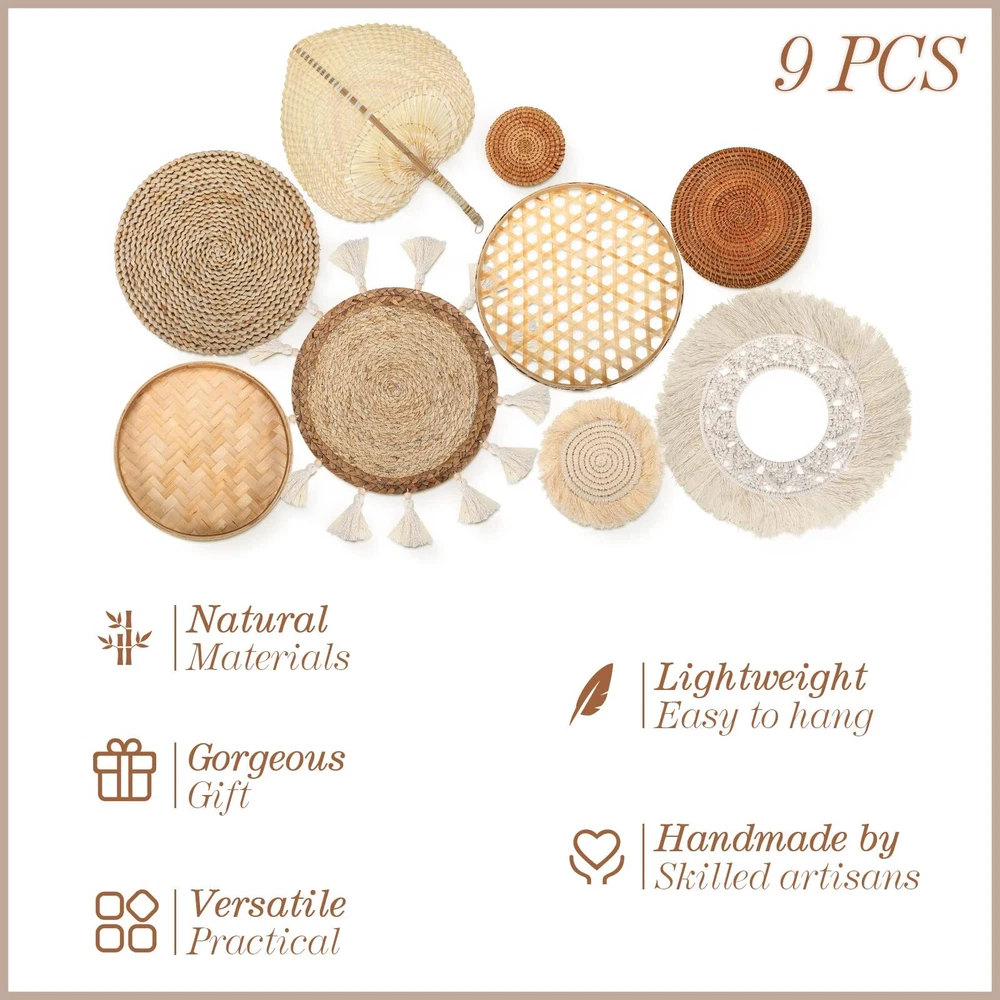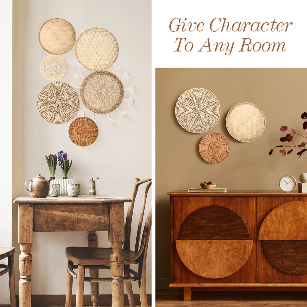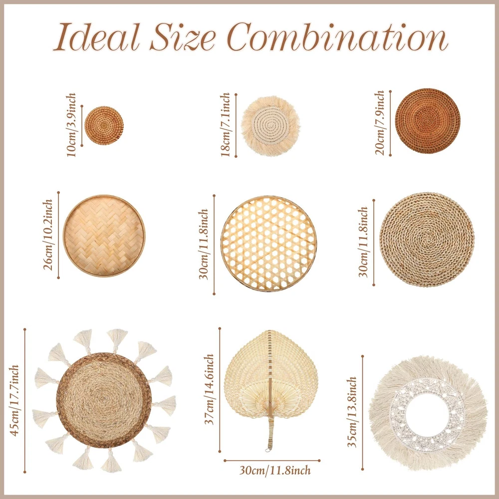 Basket Decor Sets: you will get 9 styles of delicate woven wall basket decors in different sizes, you can enjoy an authentic boho with these decors; These baskets bring stylish style to any room, combine them together, sufficient quantities can meet your decorative needs to fit different places or rooms for you to create a unique home decor combination Quality and Versatile: we put together this macrame wall decor to hang on the wall of boho decor, farmhouse decor and minimalist decor, simple yet versatile, this set is suitable for any room or occasion, whether you are decorating your nursery, living room, kitchen, bedroom, patio, yoga room, they can easily fit into your space Adorable Size: the hanging wall baskets have different sizes, respectively, 1 piece 44 cm/ 17.3 inch, 1 piece 30 x 38 cm/ 11.8 x 15 inch, 1 piece 35 cm/ 13.8 inch, 2 pieces 30 cm/ 11.8 inch, 1 piece 26 cm/ 10.2 inch, 1 piece 20 cm/ 7.9 inch, 1 piece 18 cm/ 7.1 inches, 1 piece 10 cm/ 3.9 inch, the combinations of diverse sizes will make them not only easy to hang, owing to the handmade crafts, there may have size error Ideal Gifts: these flat baskets for wall decor are ideal gifts for housewarming, birthdays, Mother's Day, Father's Day, Teacher's Day, Easter, Valentine's Day, Christmas, and more, or can be served as a gift for anyone who loves creativity and creativity and appreciates art friends, they will be fond of these ornaments Reminders: the tassel hanging woven wall baskets are folded and packaged in transit, and the borders will be messy, when you receive the product, you need to comb the items with a comb and restore them to their original state for use