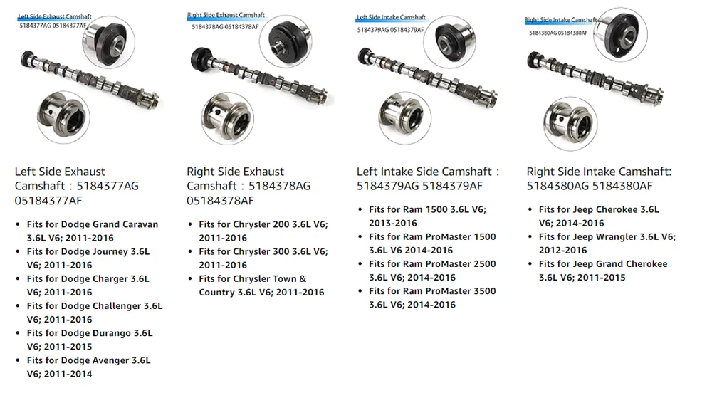 You may also like 4PACK OEM Engine Camshafts For Jeep Dodge Chrysler RAM 3.6L Pentastar 2011-2020 80.99 USD Free shipping OEM Left Side Intake Camshaft For 16-2024 Chrysler Dodge Jeep Ram 3.6L 5047912AD 139.99 USD Free shipping OEM Right+Left Intake & Exhaust Camshaft Fit 16-24 Chrysler Dodge Jeep Ram 3.6L 139.99 USD Free shipping Camshafts Rockers Lifters Kit For 2011-2016 Chrysler Dodge Ram 3.6L V6 Pentastar 409.99 USD Free shipping OEM Exhaust Camshaft Right Side 5048030AD For Chrysler Dodge Jeep Ram 3.6L 16-24 96.99 USD Free shipping OEM Exhaust Camshaft Right Side 5184378AG For Jeep Dodge Chrysler 3.6L 2011-2020 84.99 USD Free shipping OEM Intake + Exhaust Camshaft Left Side For 2011-2020 Jeep Dodge Chrysler - 3.6L 158.99 USD Free shipping OEM Exhaust Camshaft Left Side 5048029AD Fits Chrysler Dodge Jeep Ram 3.6L 16-24 96.99 USD Free shipping OEM-5184380AG Intake Camshaft Right Side 2011-2020 For Jeep Dodge Chrysler 3.6L 84.99 USD Free shipping 1X CVVT Exhaust Timing Gear for Hyundai Elantra Tucson Kia Forte Soul 243702E200 37.99 USD Free shipping Camshaft Position Sensor for 99--07 Chevy GMC Sierra Silverado Camaro Corvette 14.55 USD Free shipping OEM Intake Camshaft Left Side 5184379AG - For DODGE CHRYSLER JEEP 3.6L 2011-2020 80.99 USD Free shipping OEM Exhaust Camshaft Left Side 5184377AG for Jeep Dodge Chrysler 3.6L 2011-2020 84.99 USD Free shipping OEM Camshafts Rockers Lifters Kit For 3.6L Chrysler Dodge Ram V6 Pentastar 11-16 409.99 USD Free shipping OEM Intake + Exhaust Camshaft Right Side For Dodge Chrysler Jeep 3.6L 2011-2020 158.99 USD Free shipping OEM Intake w/ Exhaust Camshaft Left Side For 2011-2020 Jeep Dodge Chrysler 3.6L 158.99 USD Free shipping Product Description 4PACK OEM Engine Camshafts For Jeep Dodge Chrysler RAM 3.6L Pentastar 2011-2020 Description: 100% Brand New According to original factory specifications, perfect match to original car. Made of high quality material. Easy to install. Parts are from certified professional factory. Part Number: ❤5184377AD, 5184377AE, 5184377AF, 5184377AG ❤5184378AD, 5184378AE, 5184378AF, 5184378AG ❤5184379AD, 5184379AE, 5184379AF, 5184379AG ❤5184380AD, 5184380AE, 5184380AF, 5184380AG Fitment: For 2011-2020 DODGE JOURNEY WITH 3.6L For 2011-2020 CHRYSLER TOWN & COUNTRY WITH 3.6L For 2011-2020 DODGE GRAND CARAVAN WITH 3.6L For 2012-2020 JEEP WRANGLER JK WITH 3.6L For 2011-2015 JEEP GRAND CHEROKEE WITH 3.6L For 2011-2015 DODGE DURANGO WITH 3.6L For 2011-2020 CHRYSLER 300 WITH 3.6L For 2011-2020 DODGE CHARGER WITH 3.6L For 2011-2020 DODGE CHALLENGER WITH 3.6L Packag includes: Exhaust Camshaft Left Side 5184377AG / Exhaust Camshaft Right Side 5184378AG / Intake Camshaft Left Side 5184379AG / Intaket Camshaft Right Side 5184380AG / 24x Rockers 24x Lifters 12x Intake Manifold Gaskets and Seals As your choose Note: Please Carefully Check Whether the OE Number And Picture are What You Need Before Buying. If You are Not Sure Whether It Fits, Please Write to us. If There are Any Problems, Communication by Letter Will be More Effective. Payment Shipping Terms Returns Feedback Contact us We accept PayPal only. If buyer want to delay the payment because of financial problem, please contact me by the ebay message within 3 days Payment via PayPal (PayPal accepts all major credits/debit cards and eCheque) ECheque payment will tak e 3-10 days to get clear, thus DELAYing the shipment. Handling time: 1 business day (Orders are not processed on weekends & holidays) Tracking information will be sent once item is shipped. Local pick-up is unavailable at the moment. For international shipping and shipping to Guam, Hawaii and Alaska, Please contact us before placing the order. Item is shipped to ebay address. Leaving correct address can minimize delay. For any issues with Defects, Return, Item Exchange request, please contact us first and send us a message first before opening any type of case or request. We devote ourselves making EVERY CUSTOMER in 100% Satisfactory and resolve any problem. We highly value and appreciate your business. Thank you. No returns will be accepted without an RMA number. Please contact us for the RMA number. Return is acceptable within 30 days of delivery. Return for replacement or money back is optional. Returned items must be in the brand new, unaltered and resalable condition. Seller is not responsible for any labor cost, expense in a dealer store, or damage due to wrong installation. Return is accepted within 14 days after the buyer's receiving the item. (Excluding contrived damagement or misusage).100% money-back Guaranteed! All product will be tested in 100% before delivery.If the item is defected by the processing of postage,Buyer has up to 14 days from date of receipt for exchange of a new one.All shipping charges for returned products are to be paid by the buyer,Please contact us for the return address If you are satisfied with the purchase and our total service, your comment is very important in our business success. Please take a minute to leave us a positive feedback with an overall Detailed Selling Rating (DSR) of 5. Our eBay account setup auto feedback, so eBay system gives you automatically Positive feedback back after your positive feedback left. If you plan to give us a neutral/negative feedback Or open ebay/paypal case, please write to us immediately so that we can do our best to resolve your problem. All messages will be answered within 24 office hours. Please contact us either by clicking "contact seller" in the "purchase history" section or simply click "ask a question" at the bottom of this page. If you are unsatisfied with our item or service, please contact us before leaving any feedback. We are committed to resolve all issues in a friendly and satisfactory manner. We always reply to messages within 2 business days (off-duty at weekend). If you do not get a response from us, then please check your junk or spam mailbox. Payment We accept PayPal only. If buyer want to delay the payment because