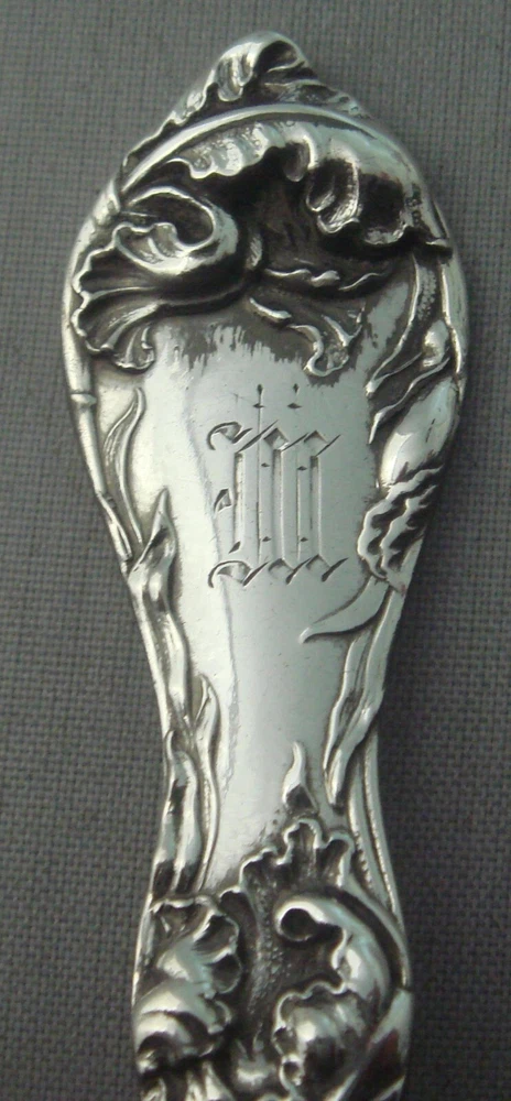 Here is a set of two coffee spoons in the sterling silver pattern Les Cinq Fleurs by Reed and Barton. These pieces are in very good condition and they measure 5 1/4" long each. They are both monogrammed on the front of the handle with a single letter mono as shown. FREE SHIPPING.