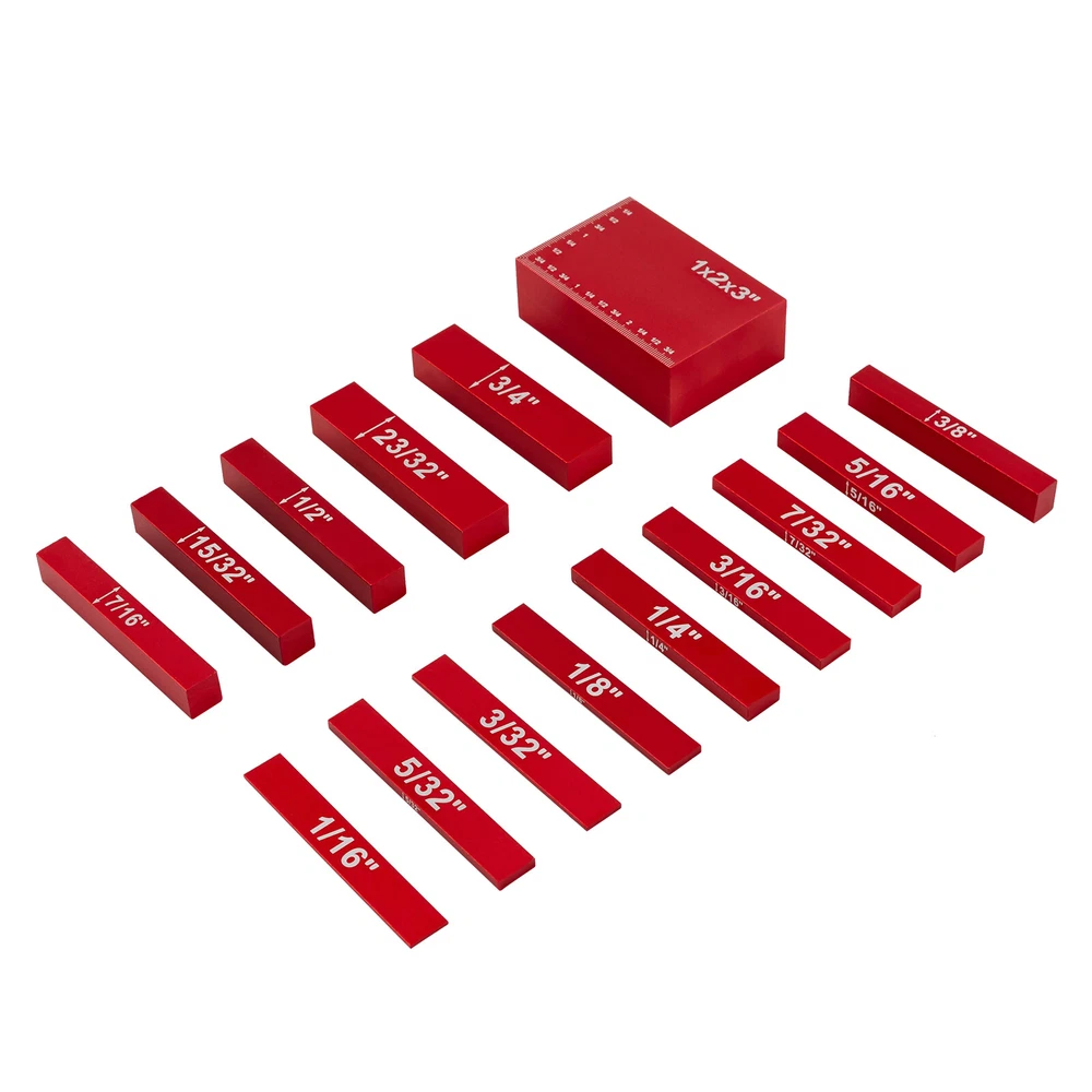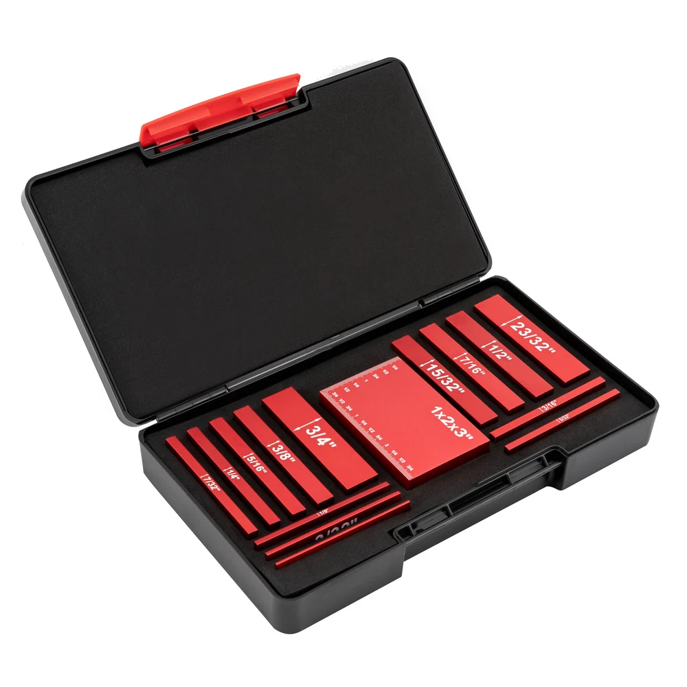 Setup Blocks Woodworking Tools - 15-Piece Gauge Block Set with Precise Setup Blocks Height Gauge Set 15x Precision Aluminum Alloy Setup Bars for Router Description The measurement work is tedious and strict, which directly affects our work efficiency. It's time to find a helper. Our setting blocks height gauge is made of aluminum alloy and processed by multiple processes, laying a foundation for your long-term use. 15 setting blocks of different sizes fully meet your needs and save your use costs. It is a combination of traditional depth&height measuring instruments and traditional building blocks, making your measurement work easier. Key Features High-quality Material : This setup blocks height gauge set is made of aluminum alloy, which is solid and firm, not easy to rust and corrosion, so it can be used for a long time without frequent replacement. Exquisite Technology: The setup blocks height gauge set adopts CNC processing, sandblasting, and oxidation technology, making the product smoother, wear-resistant, more precise, and brighter. Multiple Sizes: The setup blocks height gauge set has 15 setup blocks with different sizes and high flatness: 1/16 ", 3/32", 1/8 ", 5/32", 3/16 ", 7/32", 1/4 ", 5/16", 3/8 ", 7/16", 15/32 ", 1/2", 23/32 ", 3/4", 1x2x3 " . The length of each measuring block is 3inch/7.62cm, and you can use it alone or in combination, which fully meets your needs and is very economical. Powerful Function: This setup blocks height gauge set can effectively help you to set router bit height, the distance between blade and fence, test the depth of cuts, and fit a wide height, sizes, and various distance use. It will be a good assistant for your work. Ready to Use: This setup blocks height gauge set does not need to be assembled. You can use it directly after receiving the goods, saving you time. Easy to Store and Carry: The setup blocks height gauge set is equipped with a plastic storage box, and the lining material is environmentally friendly EVA, which can better protect these setting blocks during transportation and normal work. Buckle and groove design ensure that items are not easy to lose, and it is also convenient for you to carry. Ideal Gift: With its powerful functions, this setup blocks height gauge set can be used as a gift for parents or friends to make their work easier and more efficient. Effortless Clean: The setup blocks height gauge set has a smooth surface and a simple structure. After use, you can directly wipe off the residues and dust with a towel. Details Round Corners: The corners of the box and the setup block are very round, which can place your skin scratched during use or movement. Bold Font: The font on the setup block is laser engraved in white, which is very striking and not easy to fade, making it very convenient for you to find the size you want. Application This setup blocks height gauge set is mainly used to measure height, depth, etc. It can be widely used in fence, router bits, saw blades, router bits, drill bits, table saw, bandsaw, and woodworking, like bench drill, cutter height and table saw, router bit, cutter, drill press, etc. It is an ideal choice for carpenters, household decoration, and mechanical maintenance. Specification Style: Modern Shape: Rectangular Color: Red+Black Number of Items: 15 Overall Material: Aluminum Alloy Material of Storage Box: Plastic+EVA Surface Treatment: CNC, Sand Blasting, Oxidation, and Laser Engraving Size of Setup Blocks: 1/16 ", 3/32", 1/8 ", 5/32", 3/16 ", 7/32", 1/4 ", 5/16", 3/8 ", 7/16", 15/32 ", 1/2", 23/32 ", 3/4", 1x2x3 ". Accuracy: ±0.001" Length of Setup Blocks: 3inch/7.62cm Gross Weight: 0.9kg/2lbs Net Weight: 0.8kg/1.76lbs Package Size: 25.5*14.5*5cm/10*5.7*2inch Package Included 15 * Setup Blocks 1* Plastic Storage Case Notes Please do not use this product in a corrosive environment, or the surface oxide layer will fade. Please allow the slight color difference caused by the shooting light and 1-3cm error due to manual measurement. Please make sure you do not mind before you order. Payment Delivery details Terms of sales About us Contact us Payment We accept ebay payment 。 Fees such as import duties, taxes are not included in the item price or shipping costs. These charges are the buyer's responsibility. Delivery details Shipping: 2-9 working days to: USA Terms of sales We maintain high standards of excellence and strive for hundred percent customer satisfaction. Feedback is very important to us. We hope that you contact us immediately before you give neutral or negative feedback, so that we can address your concerns. It is impossible to address issues if we do not know about them! About us Your satis faction is our ultimate goal. We work hard to earn your trust and future business. Our certified technicians have tested each item before shipping. The unit comes with 1 year limited warranty on all manufacturing defects. a) If you receive a defective item, you may return it or ask for a discount. Please contact us within 14 days after you receive the package. b) What you returned must be intact and in its original packaging as re? u. Customer is responsible for shipping costs of the returned item. c) We will cover the cost of shipping back t with the shipping rate indicated in the registration page. We will send you a new unit or refund the full payment you paid. Thank you. Contact us Business Hour Business Hour: Monday To Friday: 8:30 AM to 5:00 PM (Beijing China time) Due to time zones, our reply to your questions may not be immediately. But within above working time, we will reply your email within 24 hours. If it's non-workdays, please kindly be patient and wait till Monday. Please contact us with ebay message. Please feel free to contact us if you have any questions. Monday To Friday: 8:30 AM to 5:00 PM (Beijing China time) Due to time zones, our reply to your questions may not be immediately. But within above working time, we will reply your email within 24 hours. If it's non-work