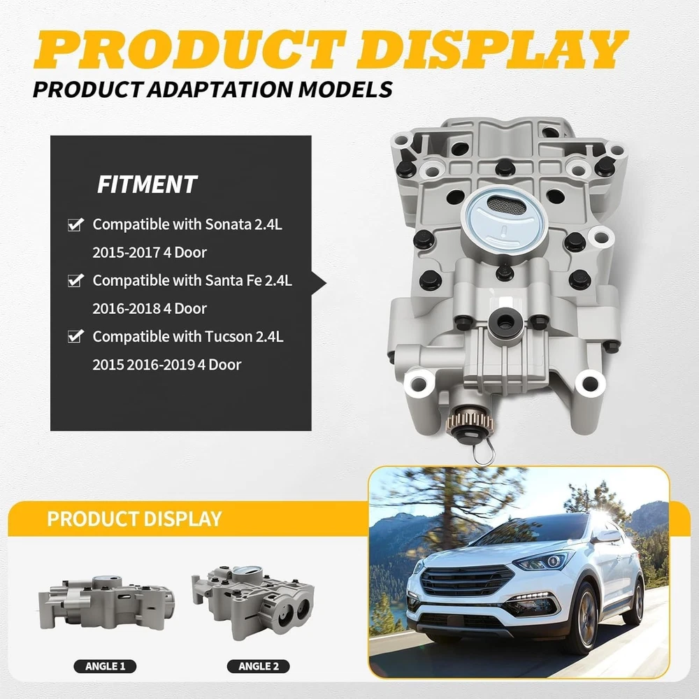 Shaft Balance Oil Pump 19 Teeth For 2015-19 Hyundai Sonata Santa Fe Tucson 2.4L Item Description Compatible : 19Teeth Hyundai Santa Fe Sport 2.4L 2013-2018;Hyundai Tucson 1.6L 2.0L 2.4L 2015-2021; Hyundai Sonata 1.6L 2.0L 2.4L 2015-2017; Kia Sorento 2.0L 2.4L 3.3L 2015-2018; Kia Sportage 2.4L 2014-2022; Replaces Part Number: 233002G401 23300-2G401. Stabilizing Effect : The oil pump assembly, through optimized design, can significantly suppress the vibration generated during the work of the oil pump, thereby enhancing the smoothness of engine work and effectively alleviating the shaking problem during vehicle driving Assist for Smoothness : This oil shaft pump assembly can assist the engine in achieving smooth work and significantly improve the comfort of the vehicle. it has excellent installation convenience and can be seamlessly connected with the old vehicle parts Improve Engine Reliability : The work of the balance oil pump is extremely quiet, effectively reducing the noise interference inside the vehicle, enhancing the comfort of driving and riding, and allowing the driver to focus more on driving Quality Assurance :Every product design must pass rigorous testing before it is considered for production. Then it is quality checked at every stage of the production machining, fabrication, and assembly process.each Engine Oil Pump Shaft Balance Assembly are quality tested and are designed to deliver quiet operation, industry-leading performance and durability. Notice :Please make sure to match the exact part numbers between this part and the part that you are replacing. Contact your mechanics, or send us a message to make sure it matches exactly in case of doubt before purchasing. Best service :If you're not satisfied with our products,Please contact our customer service will solve the problem for you as soon as possible,90 Day Warranty and friendly customer service,So feel free to buy. Item Features Function : Suck the fuel from the fuel tank, pressurize it and then deliver it to the fuel supply pipe, and cooperate with the fuel pressure regulator to establish a certain fuel pressure. Eliminates Vapor Lock : When properly installed on the vehicle, it can ensure a continuous, smooth, and steady supply of fuel to the vehicle even under extreme weather conditions. Material: Made of aluminium, sturdy structure, resistant to high temperature and high pressure, not easily deformed, rust or corrosion. Easy To Install : OE design ensures perfect fit and supports direct replacement of faulty oil pumps. Specifications Condition:100% Brand New Warranty: 90 Day Free Return:30 Day Color: Sliver Material: Aluminium Alloy Fitment For Hyundai Sonata 2.4L 2015-2017. For Hyundai Santa Fe 2.4L 2016-2018. For Hyundai Tucson 2.4L 2015-2019. For Kia Sorento 2.4L 2015-2018. Please Double-Check that this is compatible with your vehicle. Part Number: 233002G401, 23300-2G401. Package Included 1x 19 Teeth Shaft Balance Oil Pump As pictures show FAQ: I purchased by mistake, how do I cancel the order? Please contact us ASAP. If the item has not been shipped out we can cancel the order for you. If the item was shipped out you can refuse the package and wait for the item to return to us. I received your item but it does not fit or is defective Please contact us so we can assist you on the matter. Buy with confidence Our quality is based on meeting the requirements of the manufacturer and improvement them in design problems manufacture. NOTE: (1)It would be highly appreciated if you might contact us first once you have any problems concerning the items. And you can expect all the issues would be resolved ASAP! (2)Please let us know before you send us the neutral/negative feedback that wont help to finish the issues. And I will definitely try my best to provide the best solutions which would meet our satisfactory! (3)According to the distance of the receipt address items would be sent from CA or NJ (4) This product does not include an installation manual