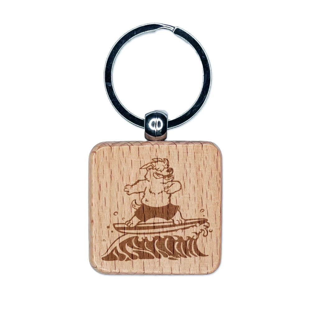 Shaggy Surfer Dog on Wave Engraved Wood Square Keychain Tag Charm