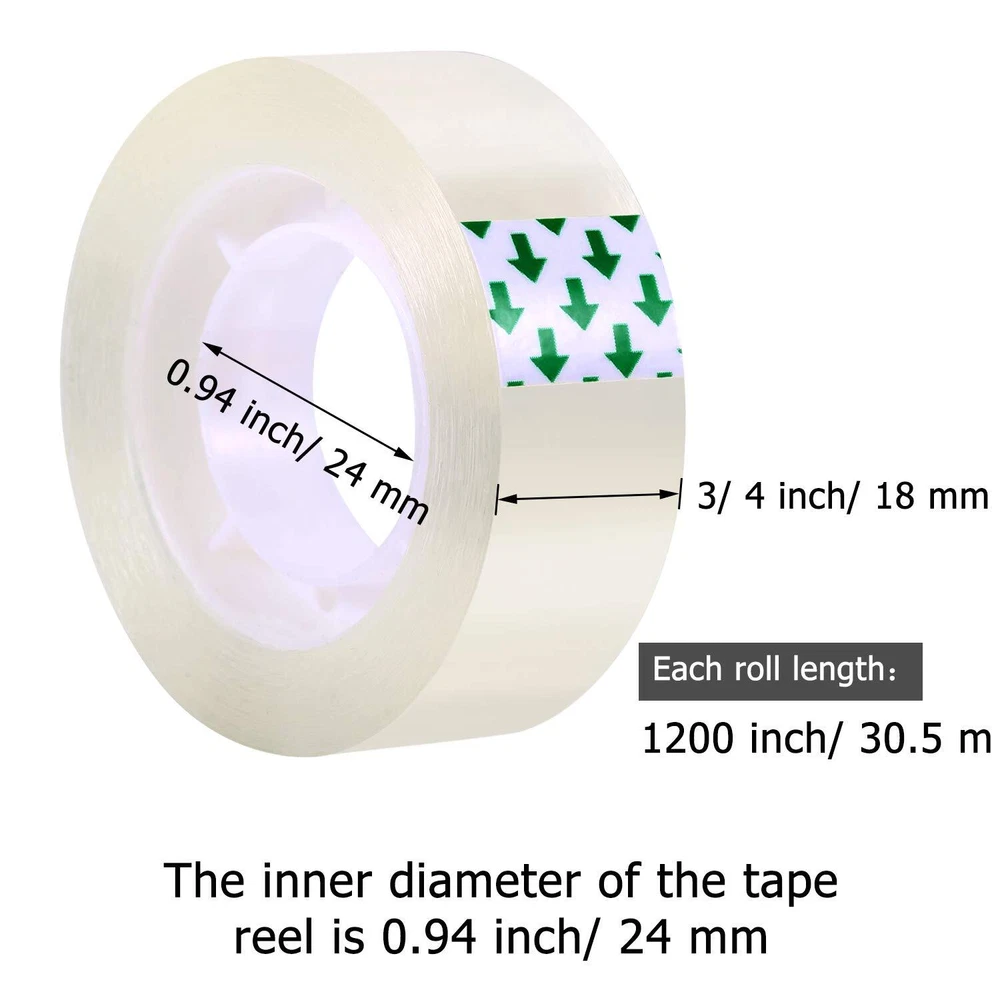16 Pack transparent tape clear tape, each roll 3/ 4 x 1200 inches Clear tape rolls: The transparent tape features good concealment at the same time while it meets the needs of application. Use easily: The clear tape roll fits standard spindle tape dispensers, easy to cut and use. Suitable scenes: The transparent tape fits standard spindle tape dispensers; Note: the inner diameter of the tape reel is 0.94 inch/ 2.4 cm, so please use the the spindle tape dispensers whose inner diameter is small than 0.94 inch/ 2.4 cm, easy to cut and use. Specification: Width: 3/ 4 inch/ 18 mm Length: 1200 inch/ 30.5 m Color: clear Quantity: 16 packs Package includes: 16 x Clear tapes What You Get: our package contains a total of 16 rolls, each measuring 3/ 4 inches/ 18 mm in width and 1200 inches/ 30.5 m in length; The generous amount ensures you will have enough tape for multiple uses without running out quickly, making it an economical choice for office, school or home use Reliable Transparency: each roll of tape features a clear color that makes it an ideal choice for a variety of applications; Warm notice: the tape color is clear, but due to the color of the adhesive is a little yellow, so overall, the tape will be a little yellow Refill Easily: the transparent tape fits standard spindle tape dispensers; The inner diameter of the tape reel is 0.94 inch/ 2.4 cm, so please use the the spindle tape dispensers whose inner diameter is small than 0.94 inch/ 2.4 cm, easy to cut and use Excellent Concealment: the transparent tape will not cover the text or pattern on the book when applied, very suitable for repairing damaged documents, with excellent adhesion, very sticky, smooth and shiny surface Wide Range of Uses: the tape can be applied not only to repair documents, but also for gift wrapping, handicrafts, pasting photos, sealing envelopes and many other items; It is a good helper in the office, school and daily life