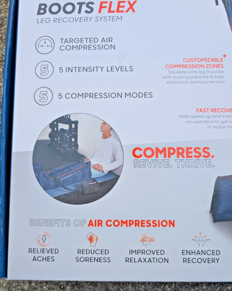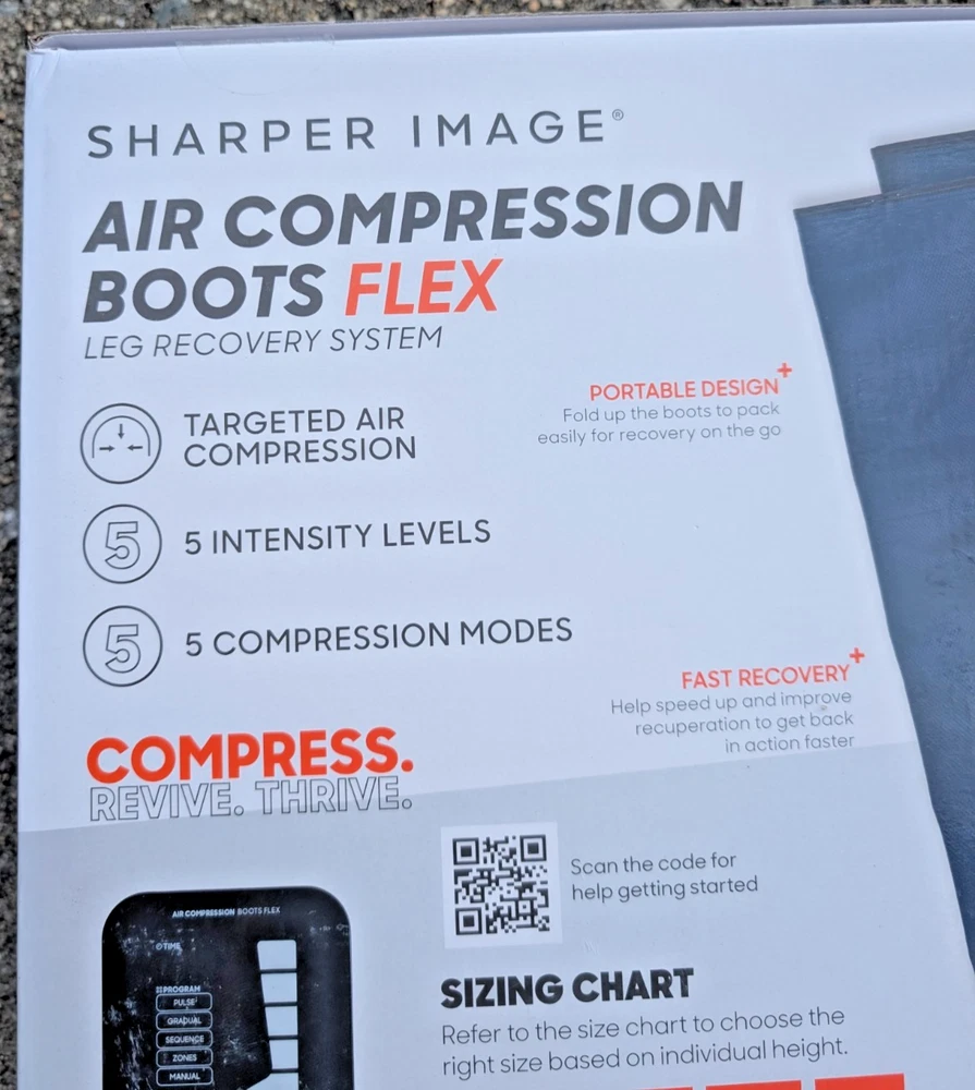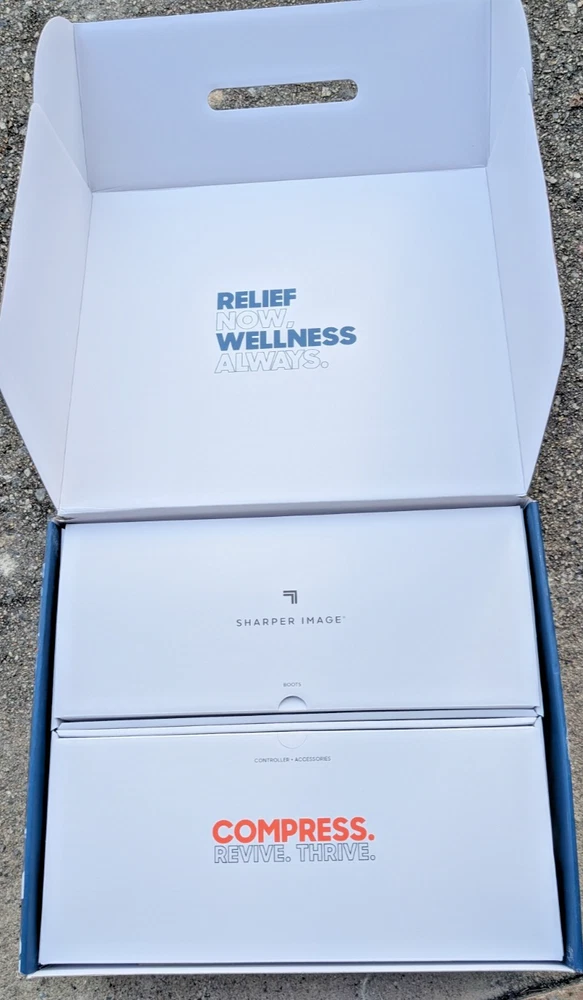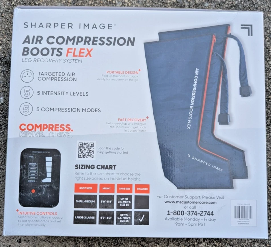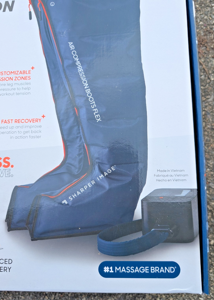 Speed up recovery and relieve tired, sore legs with the Sharper Image Air Compression Boots Flex Leg Recovery System . This set is brand new in the box and has never been used. Perfect for athletes, fitness enthusiasts, or anyone looking to improve circulation and reduce muscle fatigue. These compression boots use dynamic air pressure to massage your legs, helping promote blood flow and recovery after workouts or long days on your feet. Features: Air compression therapy for leg recovery and circulation Designed to reduce muscle soreness and fatigue Comfortable, easy-to-use Flex design Multiple pressure settings for customized relief Ideal for post-workout recovery or daily relaxation Size: Small/Medium What’s Included: Pair of Sharper Image Air Compression Boots (S/M) Control unit All original accessories Original retail box Shipping: ✔️ FREE shipping within the United States ✔️ Ships quickly and securely Notes: Returns accepted per eBay's return policy Feel free to message me with any questions—buy with confidence!