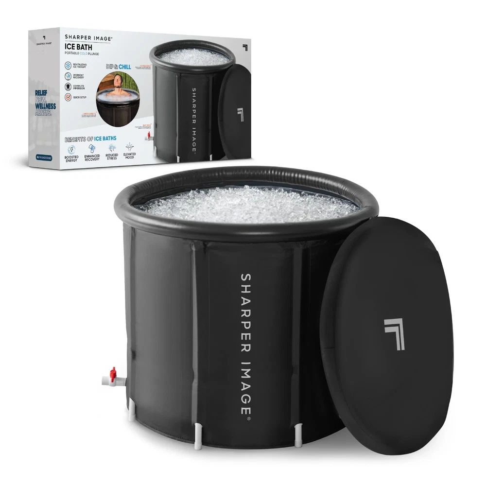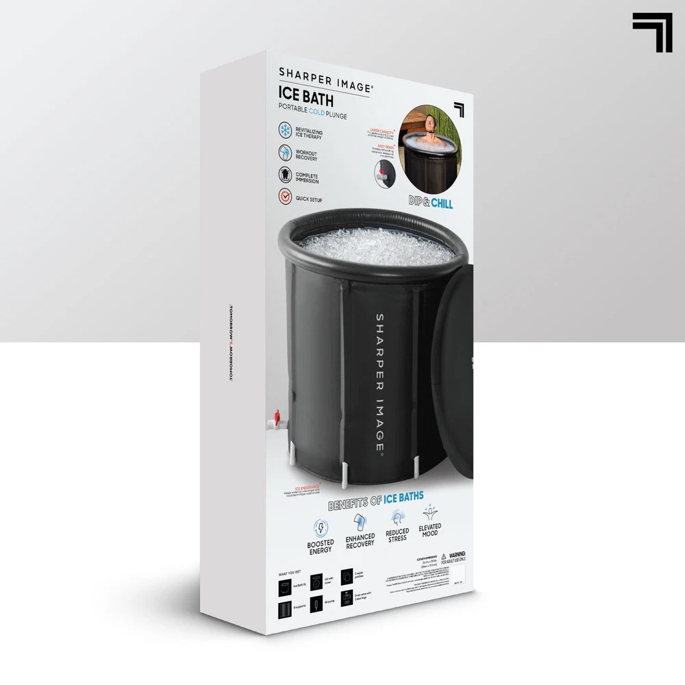 Elevate your recovery and mood with the Sharper Image® Ice Bath Portable Cold Plunge. Designed for comfort and convenience, this portable cold plunge makes ice therapy more accessible to all athletes, fitness enthusiasts, or anyone serious about health and wellness. The spacious ice bath measures 31.5 in. x 29 in. and easily fits adults of various body types, up to 6.5 ft. tall or a max weight of 250 lb. The tub walls feature tri-layer insulation to maintain temperature and reinforced with 8 supports for enhanced stability during use. Its user-friendly spigot, complete with a hose, allows for hassle-free drainage and cleanup. The lightweight and portable design makes it easy to setup in a variety of locations, and when not in use, it neatly folds, making it a perfect fit for spaces with limited storage. Regular use not only aids in reducing muscle soreness and speeding up recovery but also offers holistic benefits like mood elevation and stress reduction through cold immersion therapy. The Sharper Image® Ice Bath combines functionality and wellness, providing a comprehensive solution for enhanced recovery and overall well-being. Large capacity for adults up to 6.5 ft. and max weight of 250 lb., with tri-layer insulated walls and 8 supports to enhance stability. Features a bottom spigot and hose for quick, easy water removal after use. Lightweight and foldable, perfect for use in areas with limited storage space. Reduces muscle soreness and speeds up recovery, enhancing athletic performance. Cold immersion therapy uplifts mood, increases energy, and lowers stress for overall well-being. Contemporary design Model: 1017908