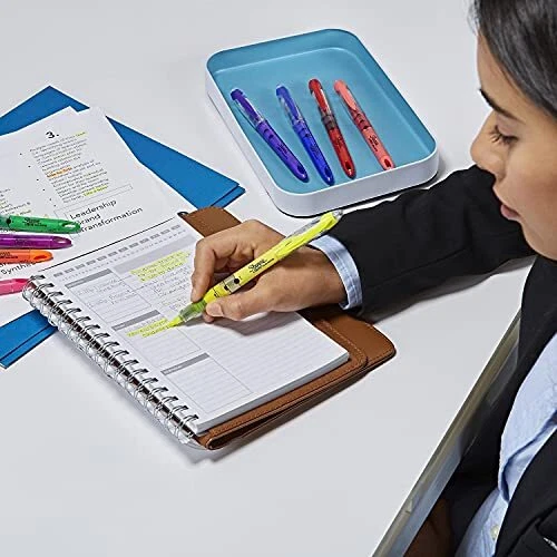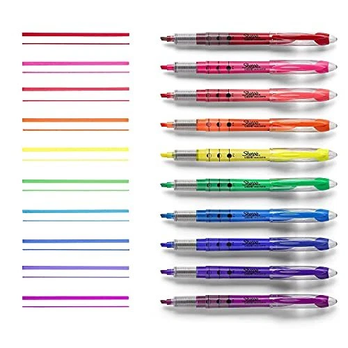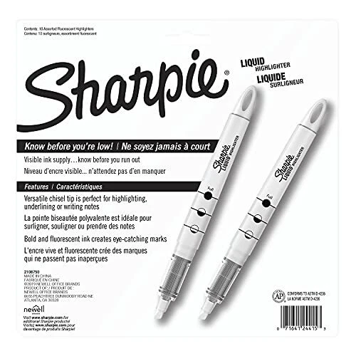 Easily identify important notes with Sharpie Liquid Accent Highlighters. These liquid highlighters feature vibrant inks that quickly dry to a bold, see-through finish. The easy-glide fine chisel tip applies ink smoothly and consistently, while the integrated loop makes it easy to attach the highlighter to a binder or bag. Color(s): Assorted; Tip Type: Chisel; Assortment: Berry; Blue; Coral; Fluorescent Green; Fluorescent Orange; Fluorescent Pink; Fluorescent Yellow; Indigo; Purple; Red; Retractable: No. Sold as 10/ST. Pigmented ink for brilliant color. Versatile chisel tip is ideal for both highlighting and underlining. Loop feature at the end of the highlighter pen allows you to attach it to 3-ring binders, planners, bags and more. Quick-drying ink is odorless.