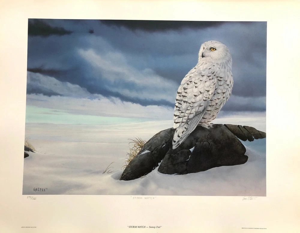 SHELDON VAN ETTEN " Storm Watch - Snowy Owl " Limited Edition Print 325 signed and numbered by the artist 14.5" x 20" in size MINT CONDITION This is a limited edition print signed and numbered by Sheldon Van Etten. It is in perfect, mint condition. It has a clean border of white around the image. Superb piece by a great Canadian artist. We are authorized dealers with almost every publisher in N. America and know we can list world class artists at remarkable prices !! We offer FREE pick up of winning items at our Canmore Art gallery located in Canada's beautiful Rocky Mountains. Shipping is done in some of the best built, strongest boxes ever seen, or wrapped and rolled in the best tubes - always completely insured. Any problems and we ship a new piece immediately - no cost to you!! We will send an email within 24 hours of the auction ending. Canadian residents add GST. We accept paypal and anyone can call the gallery toll-free with a visa or mastercard. We try to ship the same day, but some items may ship the following week. Shipping Information All items are completely insured to arrive in MINT condition! We ship in some of the strongest boxes in the industry! Art Country Canada Galleries Main Street Gallery 729 Main Street Canmore, Alberta Custom Framing Gallery 512 Bow Valley Trail Canmore, Alberta Mill Pond Press Dealer / Greenwich Workshop Dealer / Somerset Publishing Dealer / Wild Wings Dealer and many more TERMS OF SERVICE EBAY is one side of our business, having a fine art gallery we are able to custom frame most items in our gallery. We work hard to do business the old fashioned way, we treat all customers as if they are family. We answer emails courteously and are fair in all our dealings. We have a toll free number for easy service. Please feel free to contact us at anytime, with any question or comment. We make every effort to answer all emails as quickly as possible. WORLDWIDE SHIPPING We sell and ship worldwide, so please email us for a quote to any location, we dropship to any address if it is a gift. We charge shipping based on the Canadian Postal System and all items are sent fully insured. METHODS OF PAYMENT We accept Paypal which accepts the major credit cards, or we also take Credit Cards Directly over the phone, (MC, VIS A,). We accept whatever method is most convenient for you. We ask all auctions to be paid for in the fastest possible time frame. LOCAL PICK UP We encourage customers to pick up items at our gallery. Let us know if you want your item framed. We offer incredible custom framing designs and superb pricing!