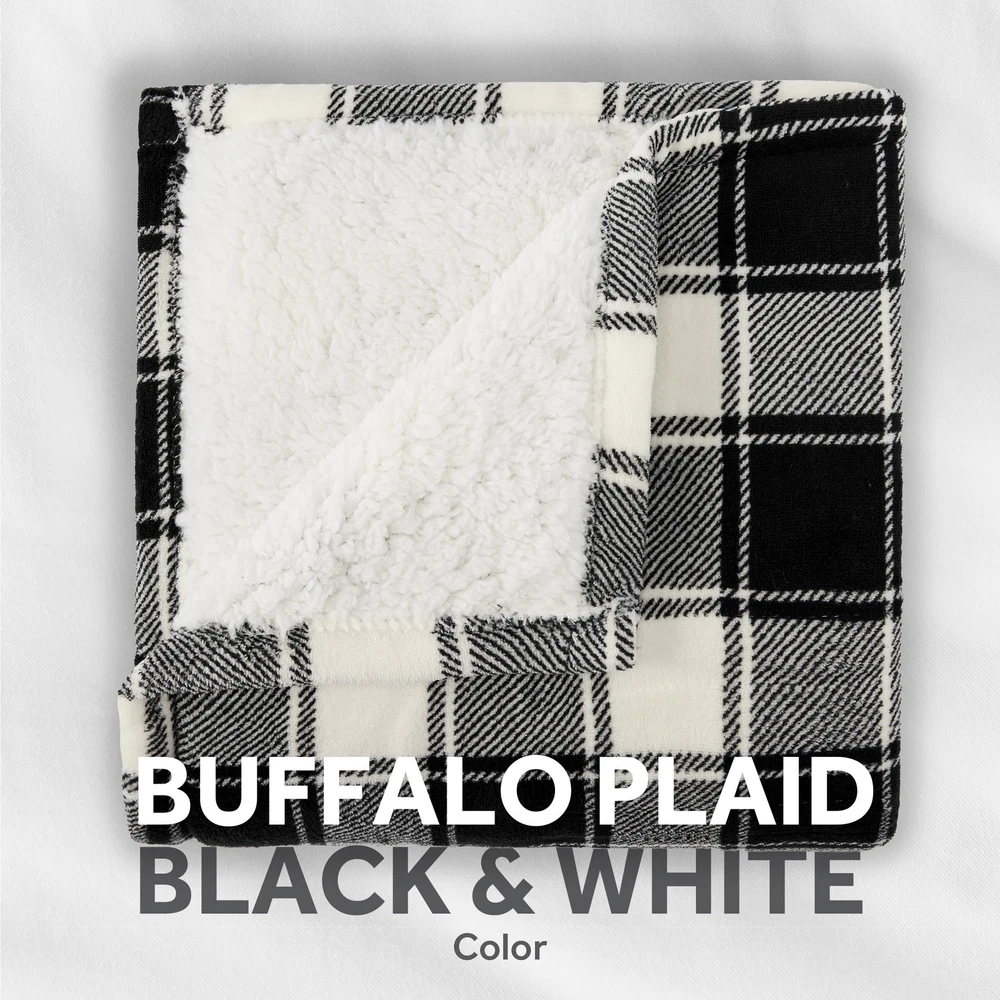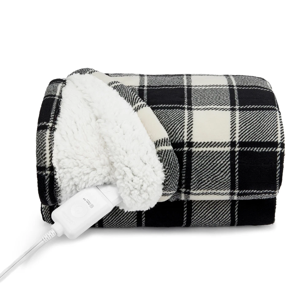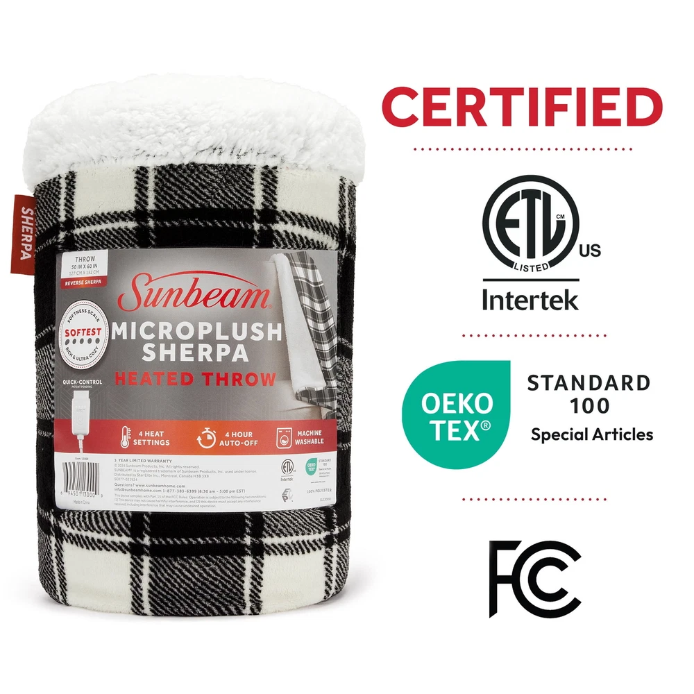 Sunbeam Electric Heated Throw Blanket – White & Black Buffalo Plaid, Microplush & Sherpa Stay warm and cozy with the Sunbeam White & Black Buffalo Plaid Heated Throw Blanket . Perfect for chilly nights, this luxurious throw combines style, comfort, and advanced heating technology to keep you snug all season long. ✨ Key Features: Effortless Warmth: Simple push-button controller for easy use. Customizable Comfort: 4 heat settings (Warm, Low, Medium, High) to find your perfect temperature. Safety First: Equipped with a 4-hour auto shut-off and overheat protection for peace of mind. Premium Materials: Ultra-soft microplush with reverse Sherpa/Faux Shearling fabric – a rich, cozy texture you’ll love. Perfect Size: Measures 50" x 60", ideal for snuggling on the couch, bed, or favorite chair. Easy Care: Machine washable and dryer safe for hassle-free maintenance. 🌟 Stylish and Functional: The elegant White & Black Buffalo Plaid pattern adds a touch of rustic charm to any space, making it both a practical and stylish accessory for your home. 💡 Trusted Quality: Sunbeam, an American brand with over 125 years of expertise, ensures all electric bedding products are ETL certified for quality and safety. 📏 Available Colors: Choose your favorite: White & Black Buffalo Plaid, Red & Black Buffalo Plaid, or Slate. Why settle for ordinary blankets? Upgrade to the Sunbeam Heated Throw and experience warmth, comfort, and style like never before.