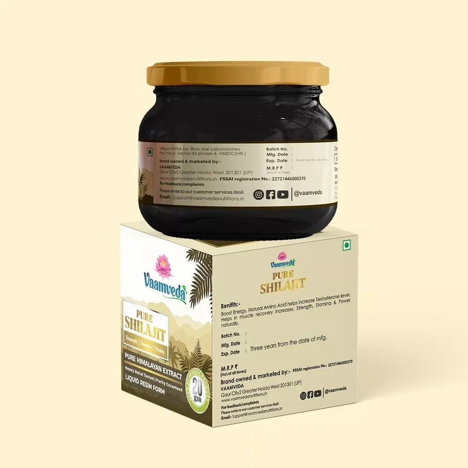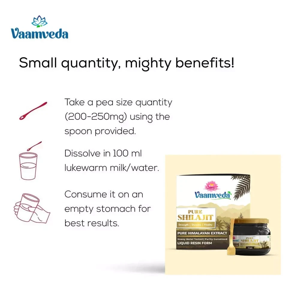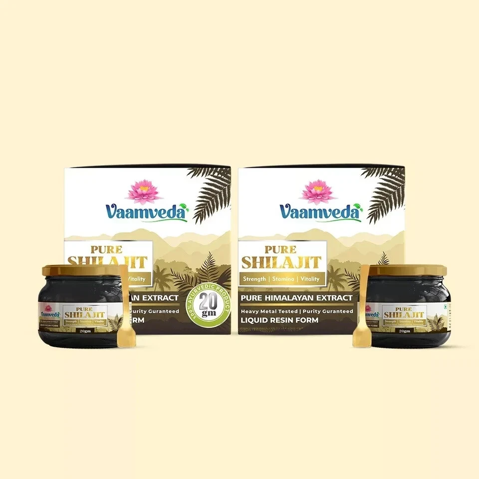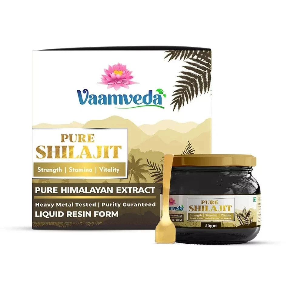 Introducing Vaamveda Himalayan Shilajit Resin – a powerhouse of fulvic acid and essential nutrients, meticulously sourced from the pristine Himalayan region. Elevate your well-being and lifestyle with our premium Shilajit resin, a timeless herb renowned for its myriad health benefits. Derived from centuries-old preparations in the Himalayas, Vaamveda Shilajit stands as a testament to purity and authenticity. Our Shilajit resin, presented in a 20 gm glass bottle, is a natural treasure accompanied by a convenient spoon for effortless daily use. Unveil the secret to prolonged contentment with the potent ingredients found within each jar. Key Benefits: Nutrient-Rich Formula: A daily pea-sized application of Vaamveda Shilajit resin enriches your body with essential nutrients, promoting overall well-being and health. Fulvic Acid Enriched: Boasting over 60% fulvic acid, our Shilajit resin facilitates the direct delivery of oxygen to cells and combats free radicals, promoting faster body recovery and regeneration. Adaptogenic Stress Relief: As an adaptogen, Vaamveda Shilajit helps combat stress, rejuvenating the body holistically. Its stress-relieving properties have even been recognized by the Russian military and Olympic teams. Renewed Energy: By enhancing mitochondrial efficiency, Shilajit powers up your body's energy production. It aids in converting oxygen and nutrients into ATP, fueling your body with enduring vitality. Cognitive Boost: Inhibiting the breakdown of acetylcholine, a crucial neurotransmitter, Vaamveda Shilajit supports brain health. It normalizes GABA levels, making it effective in addressing cognitive issues and mental illnesses. Heart and Circulatory Health: Packed with potent antioxidants, our Shilajit resin benefits heart and circulatory health. High in essential minerals like cobalt, iron, potassium, and calcium, it aids in red blood cell formation, oxygen delivery, and blood pressure regulation. Directions for Use: Mix and Consume: Blend 1 scoop of Vaamveda Shilajit resin into a glass of water. Daily Regimen: Consume twice a day after meals for optimal results. Shipping Information: We pride ourselves on prompt service, ensuring all orders are shipped within 1-2 business days of payment. Choose Vaamveda Shilajit Resin – a holistic approach to well-being that sets you apart from the rest.