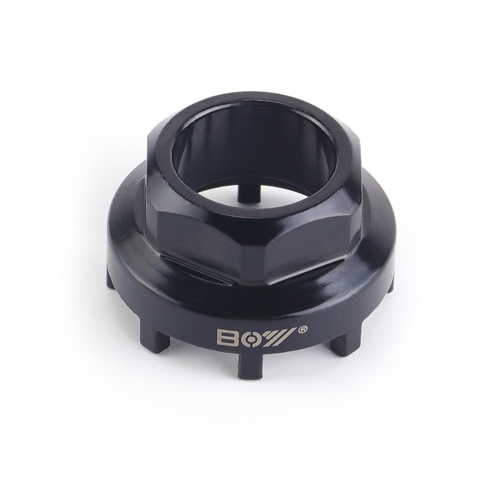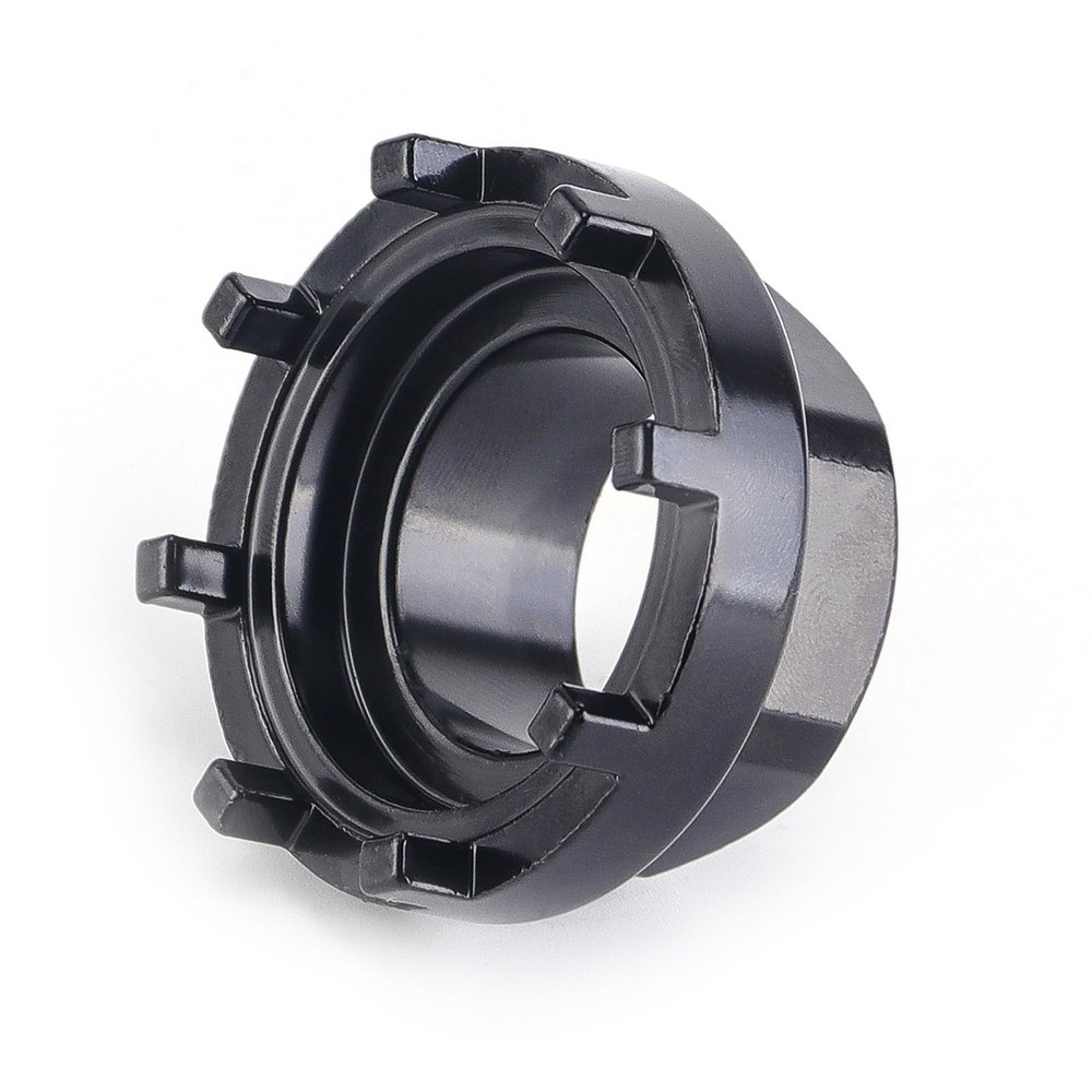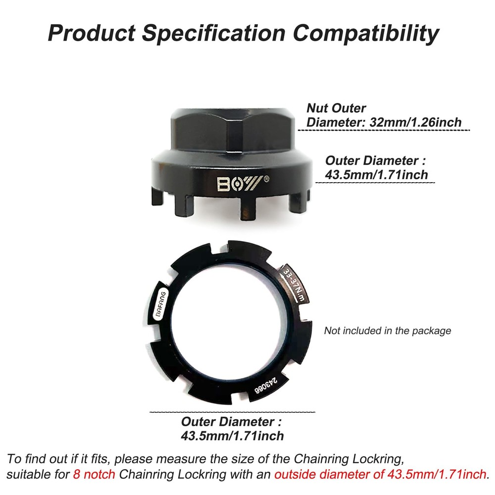 Bike 8 Notch Bottom Bracket Chainring Lockring Removal Tool Synopsis: 8-Notch Bottom Bracket/Lockring Tool Compatible with Shimano Octalink, ISIS Drive, Bosch Gen 3 and 4, Brose, etc. Bike Chainring Lockring Tool Compatible with: Shimano Octalink right side bottom bracket cups with external notches, ISIS Drive bottom bracket cups including Truvativ and Bontrager E-Bike Chainring Lockring Tool Compatible with: Front chainring lockring for Bosch Gen 3 and Gen 4 e-bike systems, Specialized Levo Brose e-bike systems and other lockring with 8 external notches With 8 notch, Each tooth is approximately 3.9mm wide and with notch spaced approximately 13.5 mm apart, Material: High Carbon Steel, Weight: 93g Maximum outside diameter is 43.5 mm. The width from inside to inside is approximately 38 mm.The hole in the center of the casting is 0.9 inches (22.5 mm) and will not fit on a 30 mm shaft.