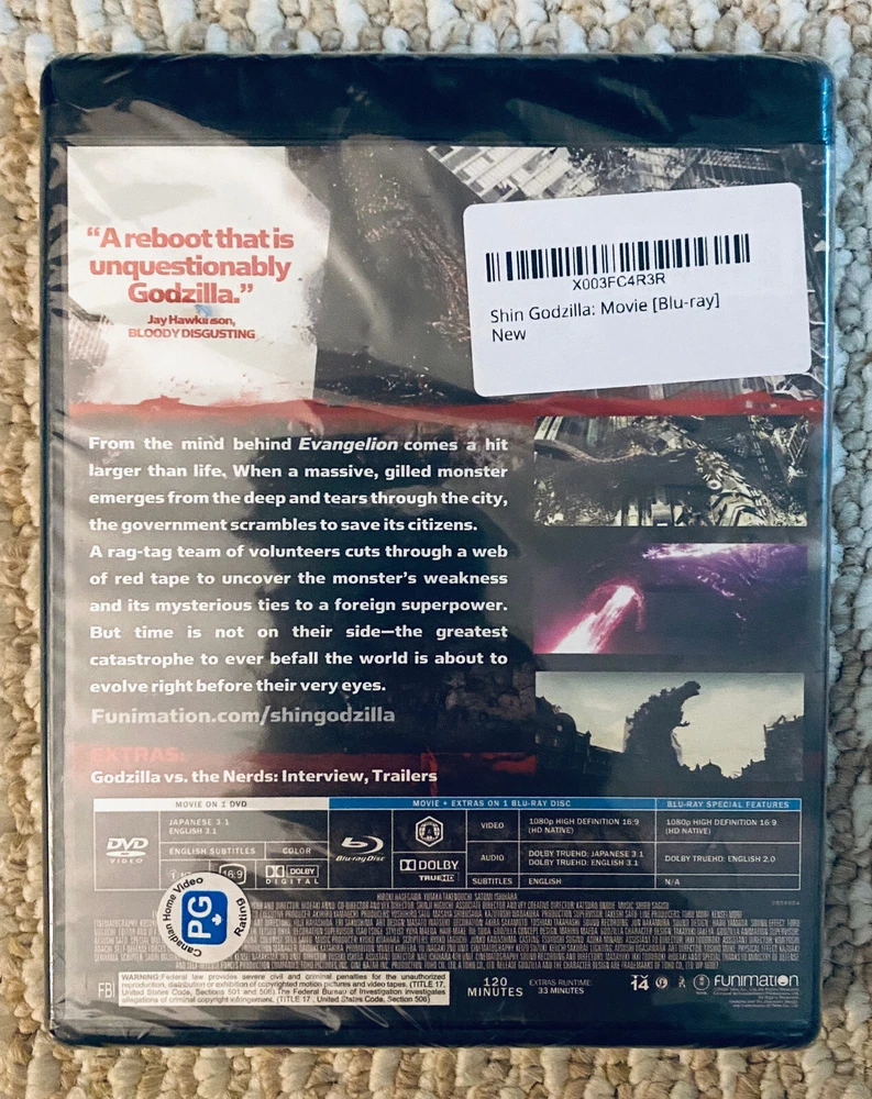 ~~~ Shin Godzilla (2 Disc Blu Ray/DVD~~~ NO Digital Code EXTRAS: Godzilla Vs The Nerds : Interviews, Trailer Video Codec: MPEG-4 AVC Resolution: 1080p Original aspect ratio: 2.39:1 Audio Japanese: Dolby TrueHD 3.1 English: Dolby TrueHD 3.1 Subtitles English Discs Blu-ray Disc Two-disc set (1 BD-50, 1 DVD) Packaging Inner print Playback 2K Blu-ray: Region A It's a peaceful day in Japan when a strange fountain of water erupts in the bay, causing panic to spread among government officials. At first, they suspect only volcanic activity, but one young executive dares to wonder if it may be something different… something alive. His worst nightmare comes to life when a massive, gilled monster emerges from the deep and begins tearing through the city, leaving nothing but destruction in its wake. As the government scrambles to save the citizens, a ragtag team of volunteers cuts through a web of red tape to uncover the monster's weakness and its mysterious ties to a foreign superpower. But time is not on their side – the greatest catastrophe to ever befall the world is about to evolve right before their very eyes. EXACTLY AS PICTURED, Please View All Pictures. Extremely Rare and Out of Print Tracking in USA, International shipping available Note: If there are any Questions or Concerns with your order, Please contact us First before leaving any feedback. We take pride in our company and will respond back within 24 hours promptly to answer any questions or correct any concerns. More pictures of DVD are available upon request! Please Check out my other Rare OOP "Out of Print" dvds on my other auctions! We want you to know exactly what you are getting here at "RAREDVDGEEKS." We are not a big company that sells millions of dvds, just a small INDEPENDENT company you can trust to handle your purchase on a personal level! Please email us with any questions that you may have and receive a quick personal response! Buy more and save on shipping! You can trust our 100% FEEDBACK!! We Ship Worldwide !!!!! Check out our "about me" page for more about us. We love dvds just as much as you do and No Bootlegs are ever sold!